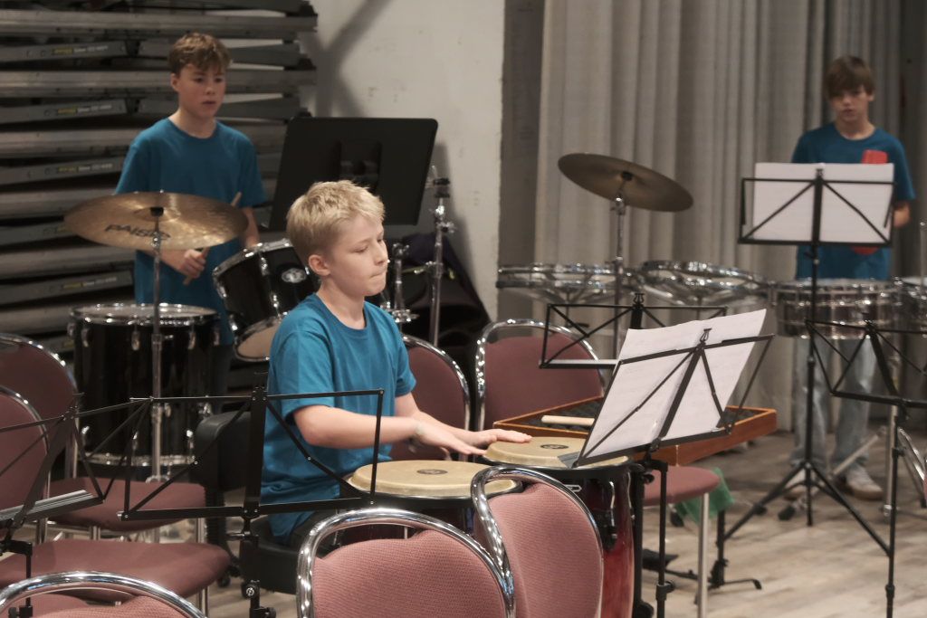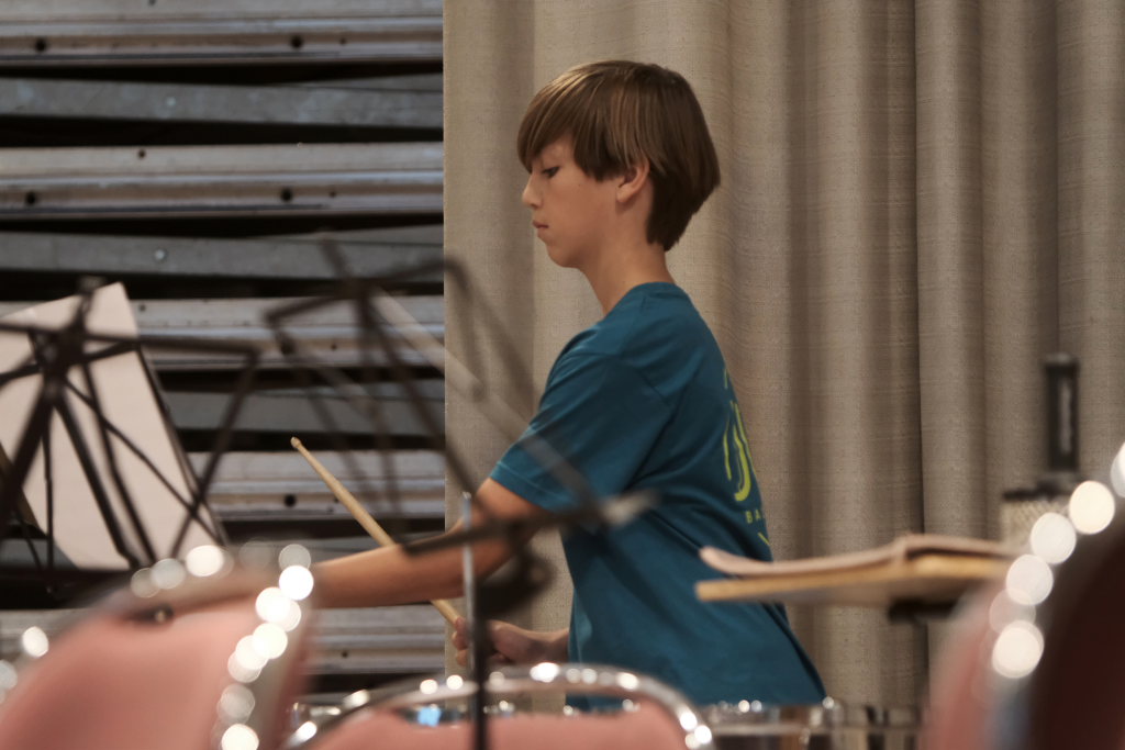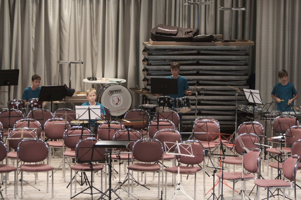 Nach einer kleinen Umbaupause, bei der sich die Schlagzeuger aus der Klasse von Michael Porter den nötigen Raum auf der Bühne verschafften, präsentierten Vitus Vincon, Luis Faßnacht, Samuel Schöllhorn und Florian Hess „Mood“ für ein Percussion-Ensemble von Wolfgang Schmitz.