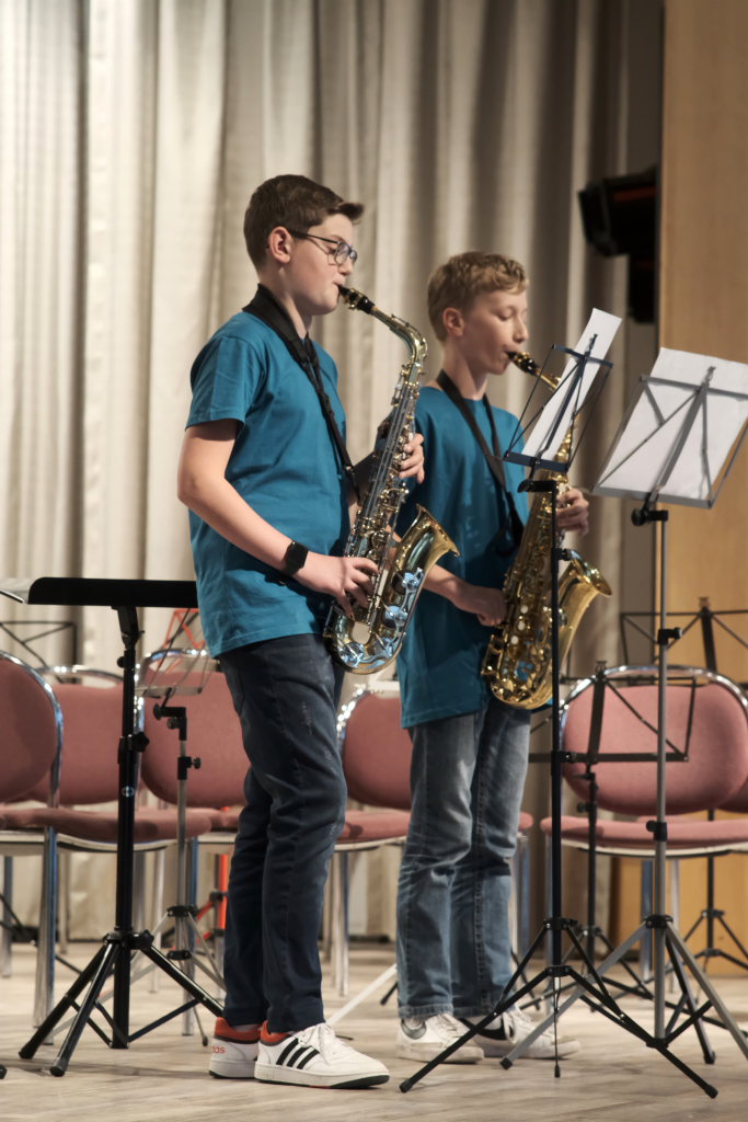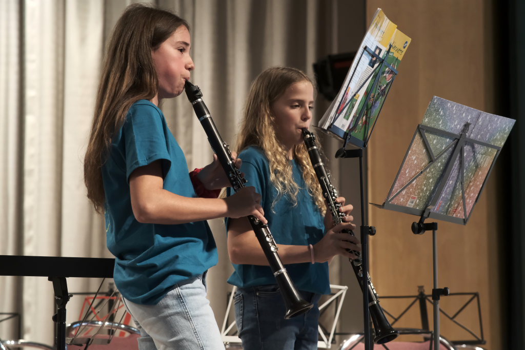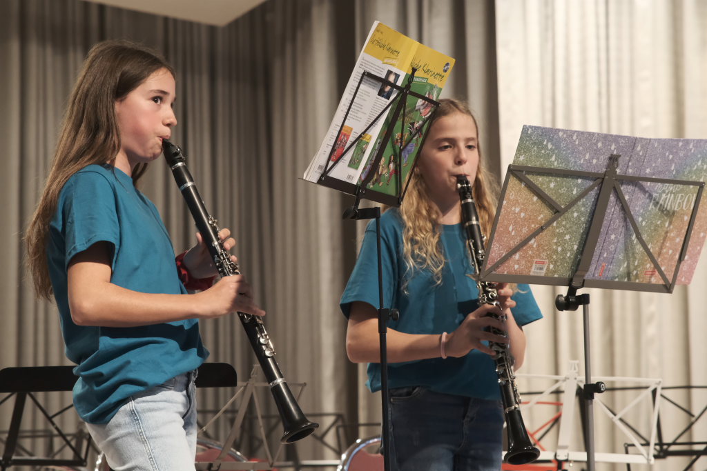 Ebenfalls mit zwei Duos trat Klarinetten- und Saxophonlehrer Georg Stankalla bei dem Konzert auf. Zunächst spielten die beiden Cousinen Leonie und Annalena Heine mit ihren Klarinetten zunächst das Traditional „Prärie Song“ und danach von A. Wandertagen das Konzert-Duett. Danach machten Florian Gieger und Eli Brik ihren Saxophonlehrer Stankalla mit dem gleichnamigen Stück von Paul Schmidt „Happy“.