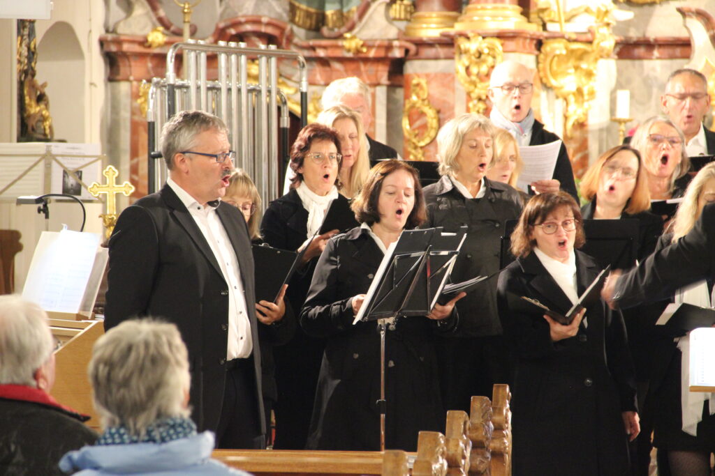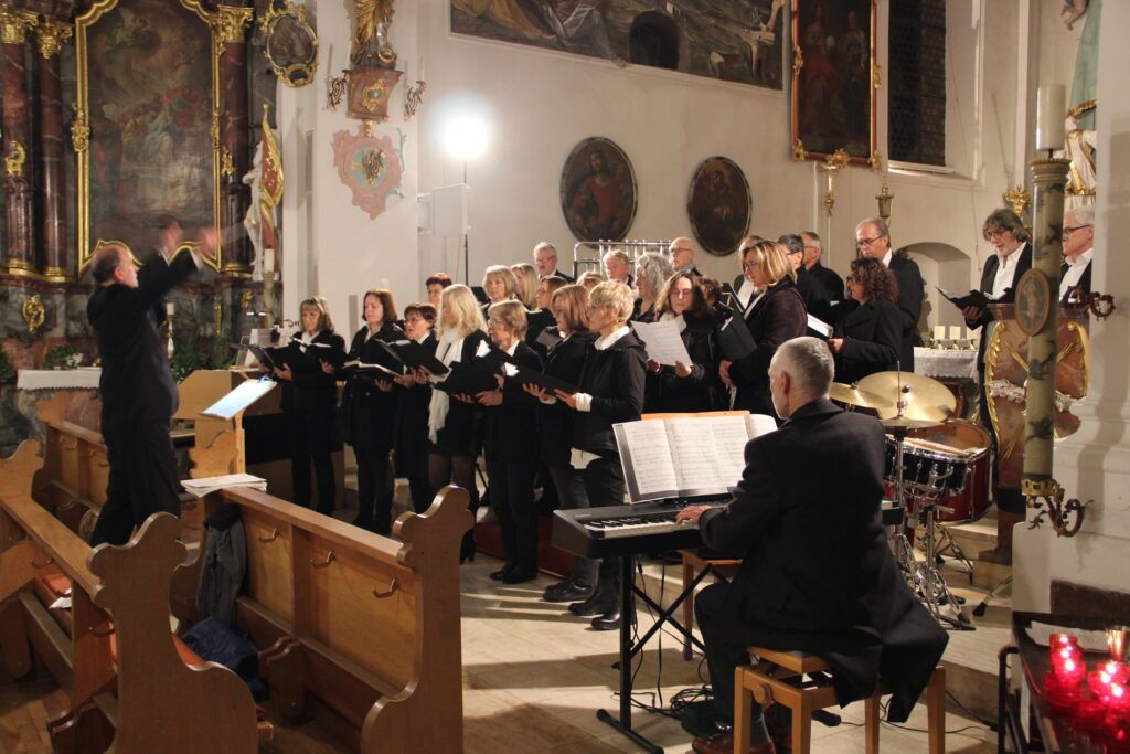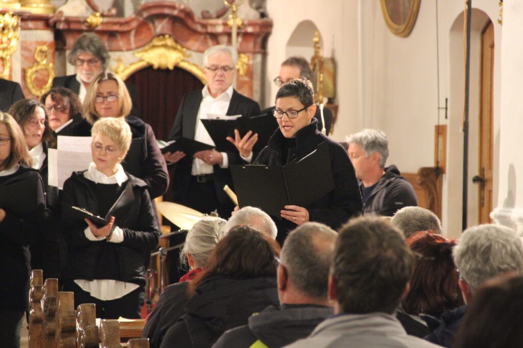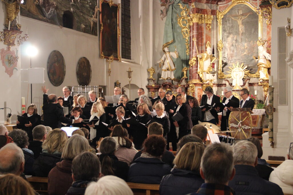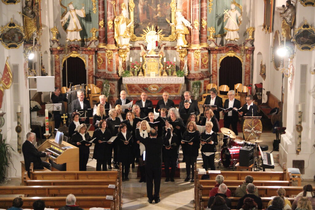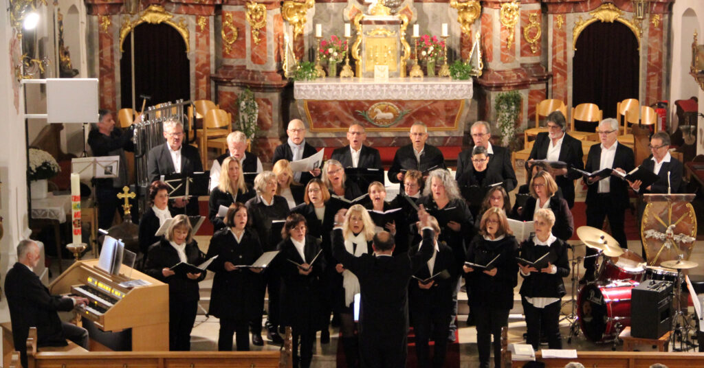 Arnach – Seit April hatten sie sich vorbereitet. 14 Projektsänger aus Arnach und Umgebung, vor allem aus Immenried, waren hinzugestoßen. Vom Stammchor hatten zwei Drittel sich dem anspruchsvollen Projekt angeschlossen. Lohn der Mühen: Mehr als 200 Besucher spendeten am 13. Oktober im barocken Ambiente der Arnacher Pfarrkirche stehend lang anhaltenden Applaus für das Konzert des Kirchenchores Arnach. Sylvia Buchbinder, die Vorsitzende des Kirchenchors, warf in ihrer Danksagung den Blick zurück auf das Bestreben, ein so anspruchsvolles Programm zu erarbeiten. Mit „Geduld und Humor“ habe es Chorleiter Wolfgang Roth geschafft, aus den 28 Sängern und Sängerinnen und den sie begleitenden Instrumentalisten Robert Häusle (Orgel, E-Piano) und Thomas Baumann (Schlagzeug, Röhrenglocken) eine Einheit zu formen. Und diese Einheit zeigte, nach einer kleinen anfänglichen Unsicherheit, die aber souverän überspielt wurde, eine glänzende Leistung.