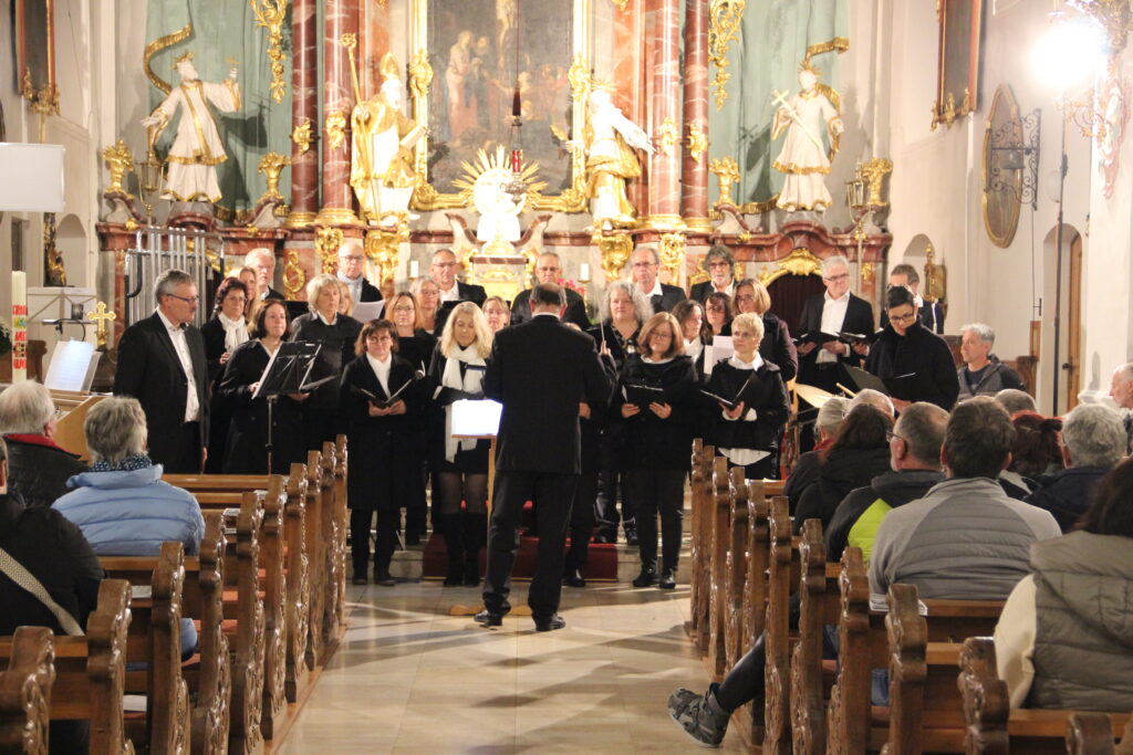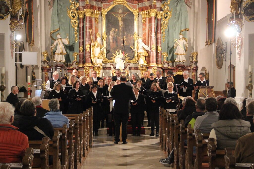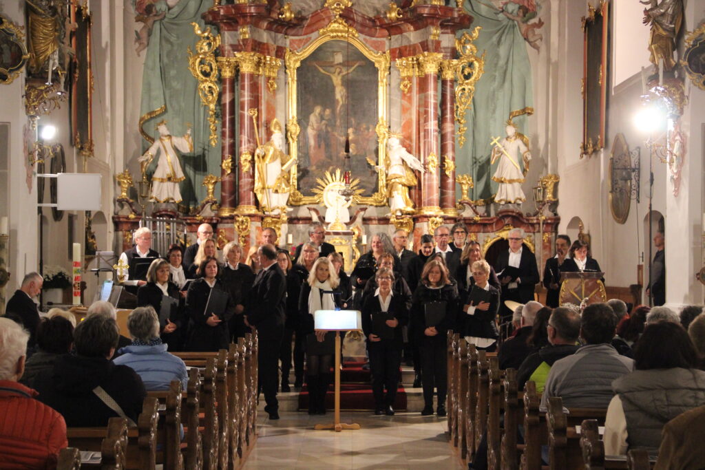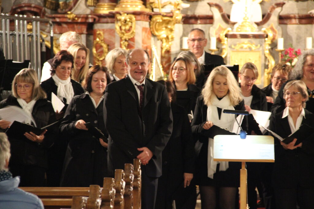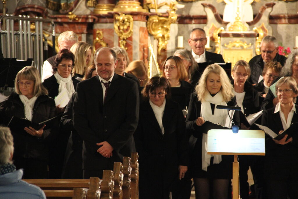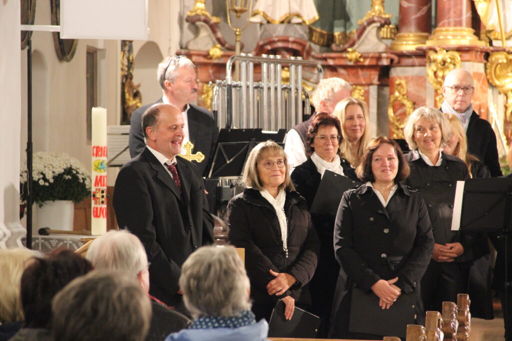Arnach – Seit April hatten sie sich vorbereitet. 14 Projektsänger aus Arnach und Umgebung, vor allem aus Immenried, waren hinzugestoßen. Vom Stammchor hatten zwei Drittel sich dem anspruchsvollen Projekt angeschlossen. Lohn der Mühen: Mehr als 200 Besucher spendeten am 13. Oktober im barocken Ambiente der Arnacher Pfarrkirche stehend lang anhaltenden Applaus für das Konzert des Kirchenchores Arnach. Sylvia Buchbinder, die Vorsitzende des Kirchenchors, warf in ihrer Danksagung den Blick zurück auf das Bestreben, ein so anspruchsvolles Programm zu erarbeiten. Mit „Geduld und Humor“ habe es Chorleiter Wolfgang Roth geschafft, aus den 28 Sängern und Sängerinnen und den sie begleitenden Instrumentalisten Robert Häusle (Orgel, E-Piano) und Thomas Baumann (Schlagzeug, Röhrenglocken) eine Einheit zu formen. Und diese Einheit zeigte, nach einer kleinen anfänglichen Unsicherheit, die aber souverän überspielt wurde, eine glänzende Leistung.