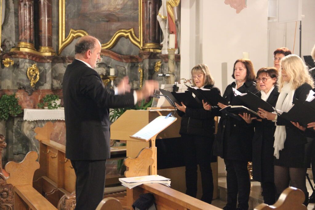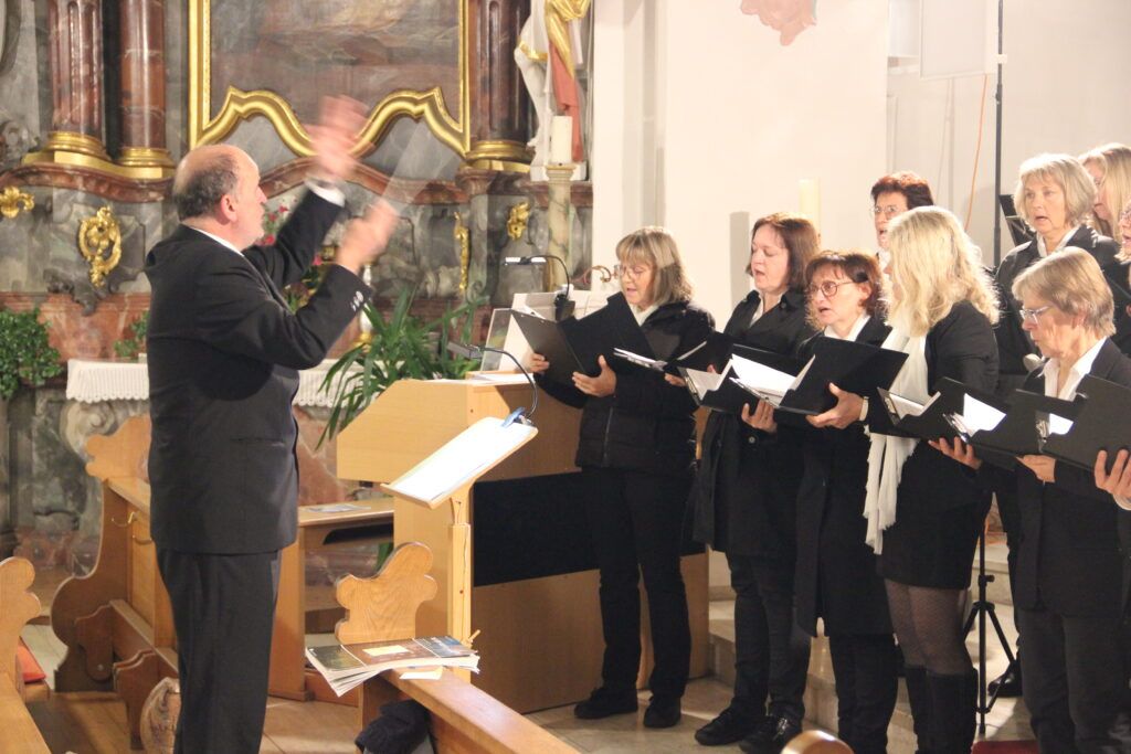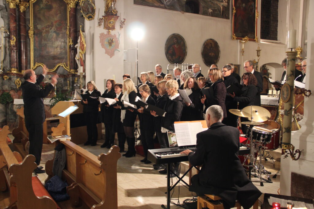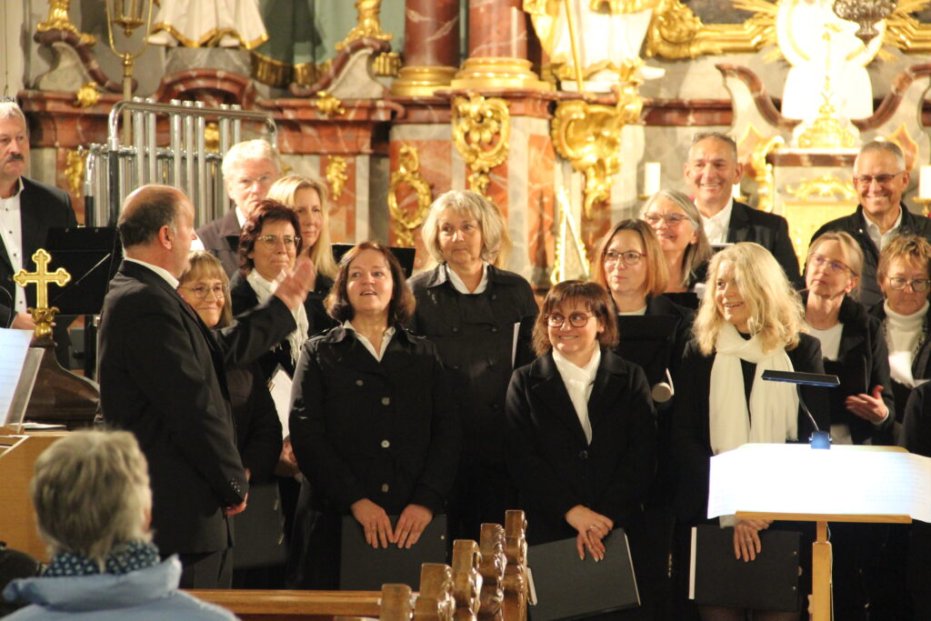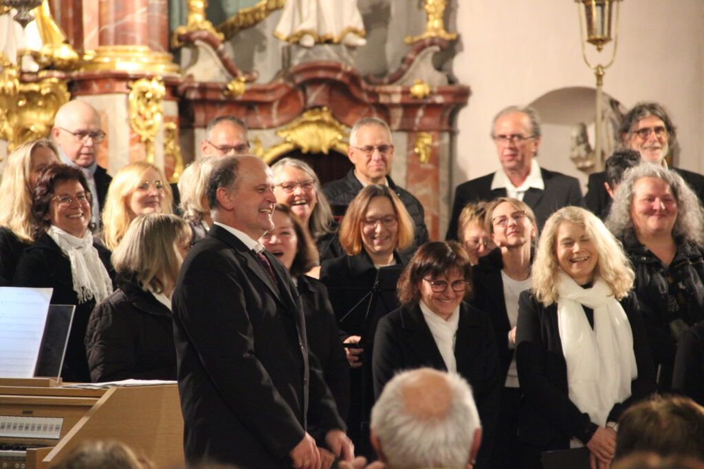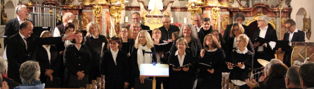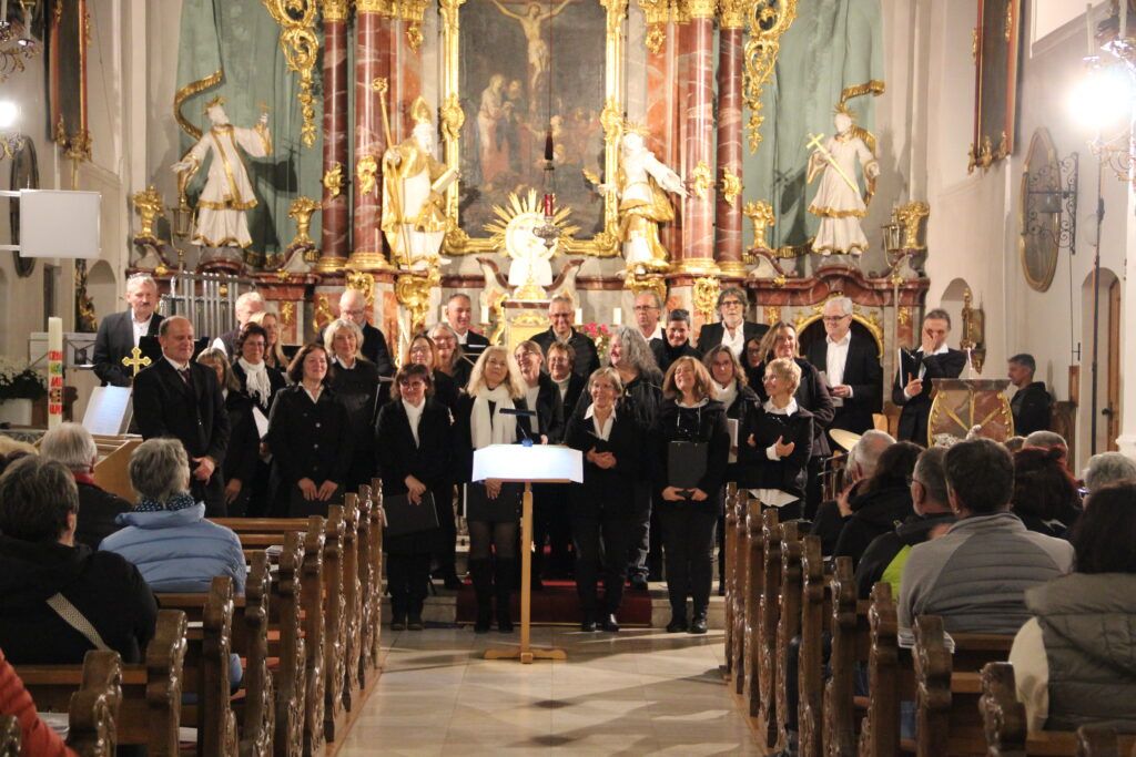 Arnach – Seit April hatten sie sich vorbereitet. 14 Projektsänger aus Arnach und Umgebung, vor allem aus Immenried, waren hinzugestoßen. Vom Stammchor hatten zwei Drittel sich dem anspruchsvollen Projekt angeschlossen. Lohn der Mühen: Mehr als 200 Besucher spendeten am 13. Oktober im barocken Ambiente der Arnacher Pfarrkirche stehend lang anhaltenden Applaus für das Konzert des Kirchenchores Arnach. Sylvia Buchbinder, die Vorsitzende des Kirchenchors, warf in ihrer Danksagung den Blick zurück auf das Bestreben, ein so anspruchsvolles Programm zu erarbeiten. Mit „Geduld und Humor“ habe es Chorleiter Wolfgang Roth geschafft, aus den 28 Sängern und Sängerinnen und den sie begleitenden Instrumentalisten Robert Häusle (Orgel, E-Piano) und Thomas Baumann (Schlagzeug, Röhrenglocken) eine Einheit zu formen. Und diese Einheit zeigte, nach einer kleinen anfänglichen Unsicherheit, die aber souverän überspielt wurde, eine glänzende Leistung.
