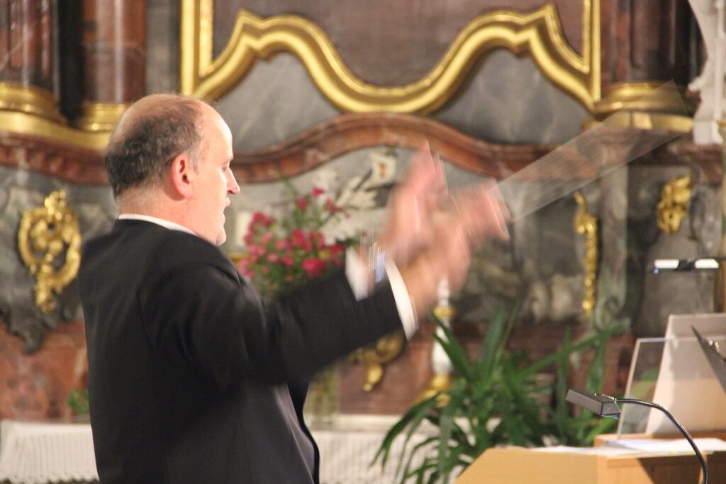 Beim Schlussbeifall. Dirigent Wolfgang Roth weist auf den Chor.