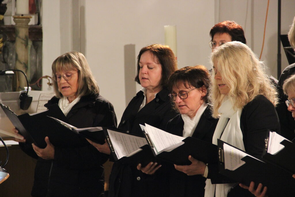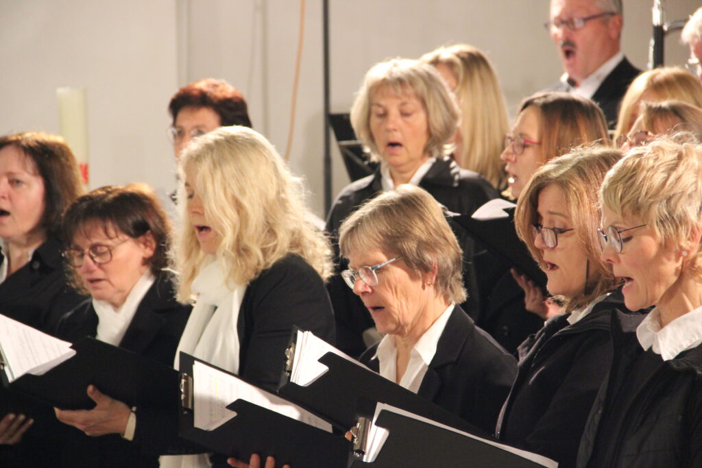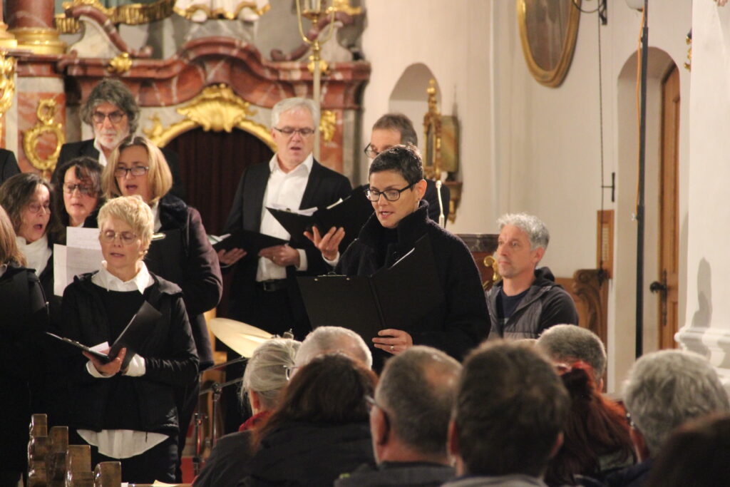 Chorsängerin Alexandra Gut (Bild; am Mikro) führte durch das Programm, das überwiegend geistlichen Charakter hatte und in dem die leisen, feinen Töne überwogen, auch wenn da und dort ein kräftiges Crescendo gewagt wurde – wie etwa beim rockigen „Viva la vida“ und beim beschwingten ABBA-Song „Thank you for the music“, der als Zugabe ein zweites Mal dargeboten wurde.
