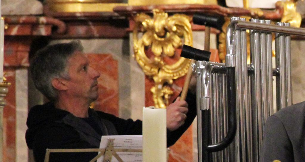 Dann folgte ein zeitgenössisches Werk aus der Feder des englischen Komponisten Christopher Tambling. Aus seiner Missa brevis in B wurde das Kyrie und das Sanctus gegeben. Dabei erklangen die Röhrenglocken, gefühlvoll angeschlagen von Thomas Baumann (Bild).