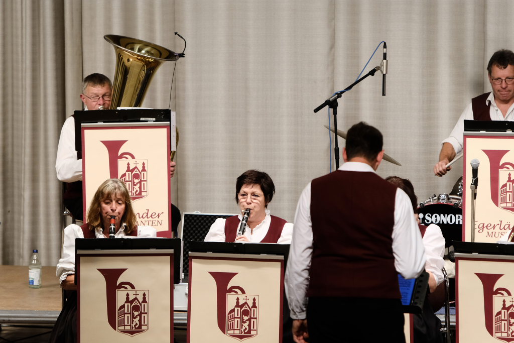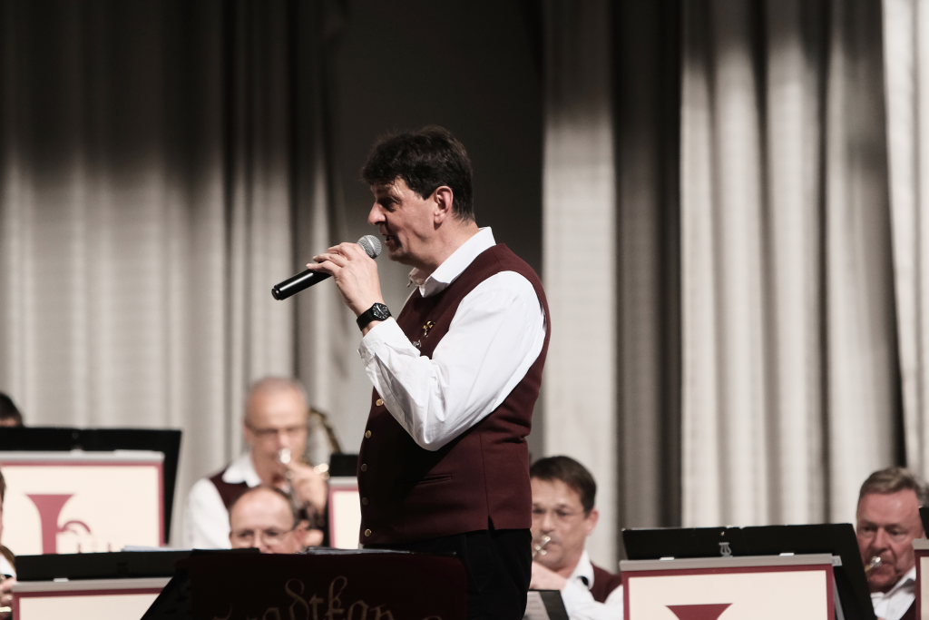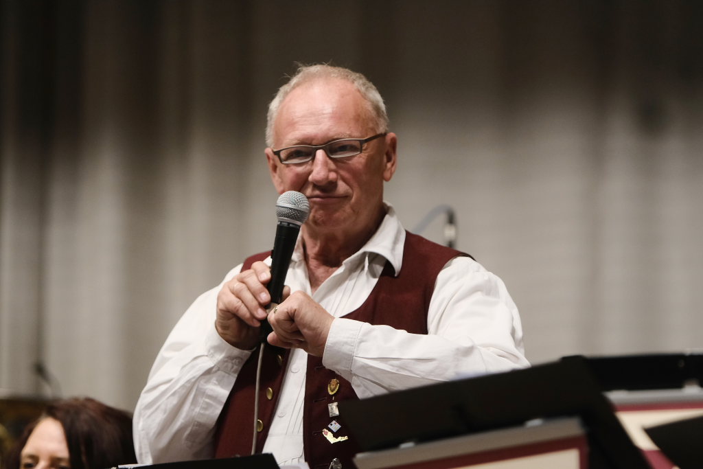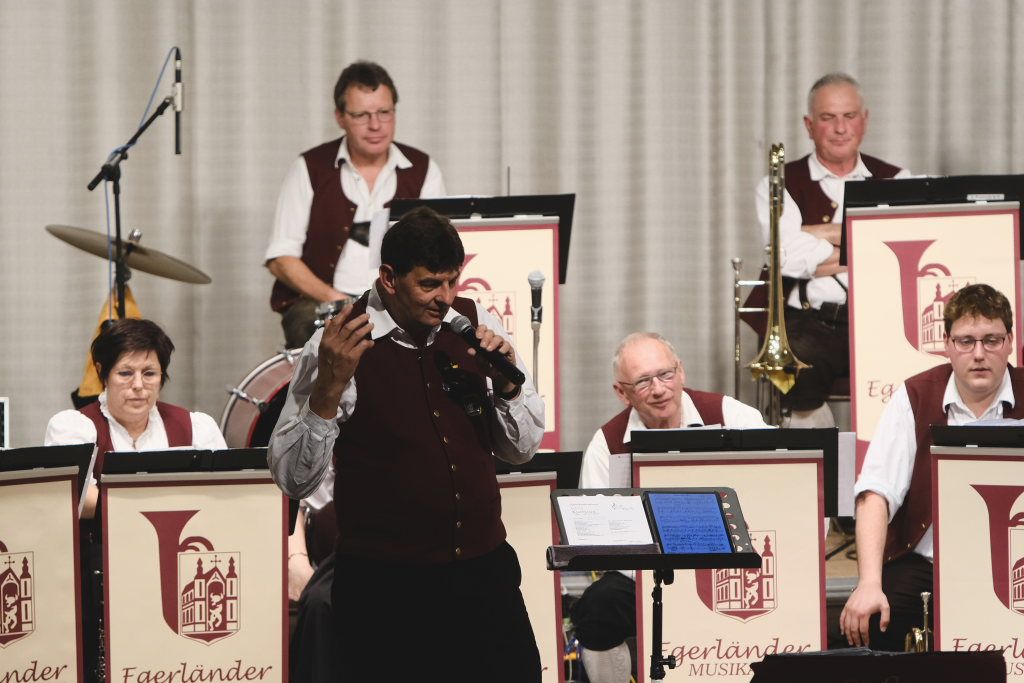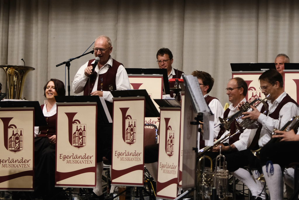 Das Orchester eröffnete den Auftritt mit dem Konzertmarsch „Carpe diem“ von Alexander Pfluger, frei übersetzt bedeutet das: „Genieße den Tag“ und das empfahl Richard Nothelfer, der Ansager der Gruppe, auch dem Publikum für diesen Abend. Nothelfer konnte einige Informationen und Anekdoten zu den Titeln des ersten Konzertteiles beisteuern, die ausschließlich aus dem Repertoire von Ernst Mosch und seinen Original Egerländer Musikanten entstammten, mit dem dieser zu Weltruhm gelangte und der ohne Zweifel auch für die Ochsenhausener Egerländer großes musikalisches Vorbild war. Nothelfer konnte sich noch gut an ein Konzert von Ernst Mosch und seinen Original Egerländern 1964 in Berkheim erinnern, das er als kleiner Junge besuchen durfte, also zu einer Zeit, in der die meisten seiner Mitmusiker noch gar nicht geboren waren…