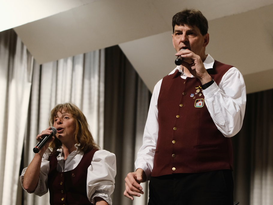 Diese zeigte Posaunist Alwin Hagel mit seinem Alphorn beim „Alphorn Casanova“ auf, dem noch einmal mit „Eine stille Stunde“ eine kleine Reminiszenz an Ernst Mosch zu geben. Und weil Werner Hutzel am Vortag Geburtstag hatte, bekam er vom ganzen Saal natürlich ein Happy Birthday gesungen und durfte nach dem Küsschen Walzer von Alexander Pfluger bei der „Tanz mit mir Polka“ nach dem Duett mit ihr ein kleines Tänzchen mit Sängerin Margit Schiele wagen.