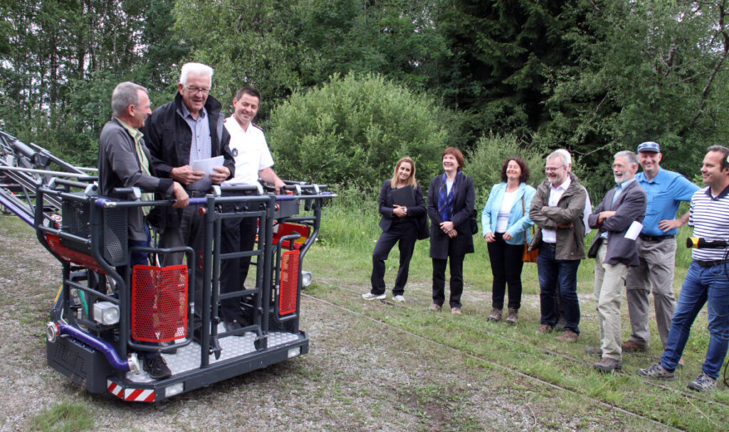 Bad Wurzach (rei) – Am 22. Juni 2018 besuchte Ministerpräsident Winfried Kretschmann das Wurzacher Ried und nahm jenen Standort in Augenschein, an dem jetzt der Naturerlebnis- und Beobachtungsturm gebaut werden soll. Mit der Drehleiter der Bad Wurzacher Feuerwehr ließ er sich hoch in die Lüfte tragen und nahm das Ried von oben in den Blick. Diese demonstrative Bekundung, für die Kretschmann eigens von einem Termin in der Schweiz mit dem Helikopter herbeigeflogen kam, gilt allgemein als Signal dafür, dass das Land den Turm will. Und das Land hat bereits mit dem Kauf eines Ried-Grundstückes auch eine finanzielle Vorleistung erbracht. Die Bilder vom Kretschmann-Besuch 2018 machte unser Reporter Uli Gresser.