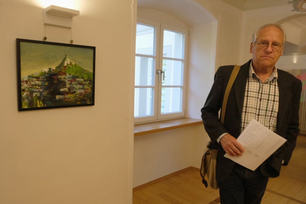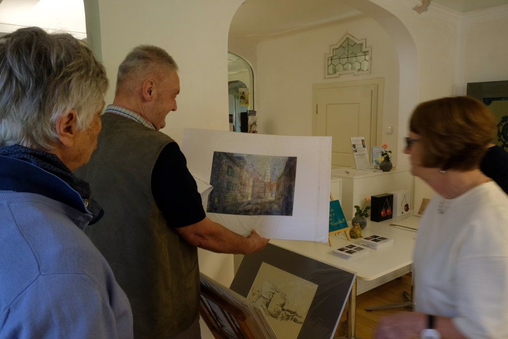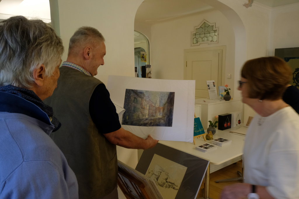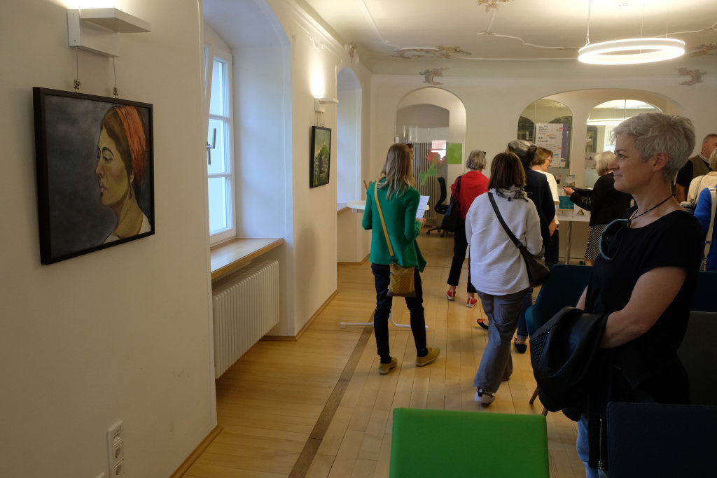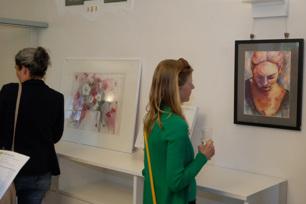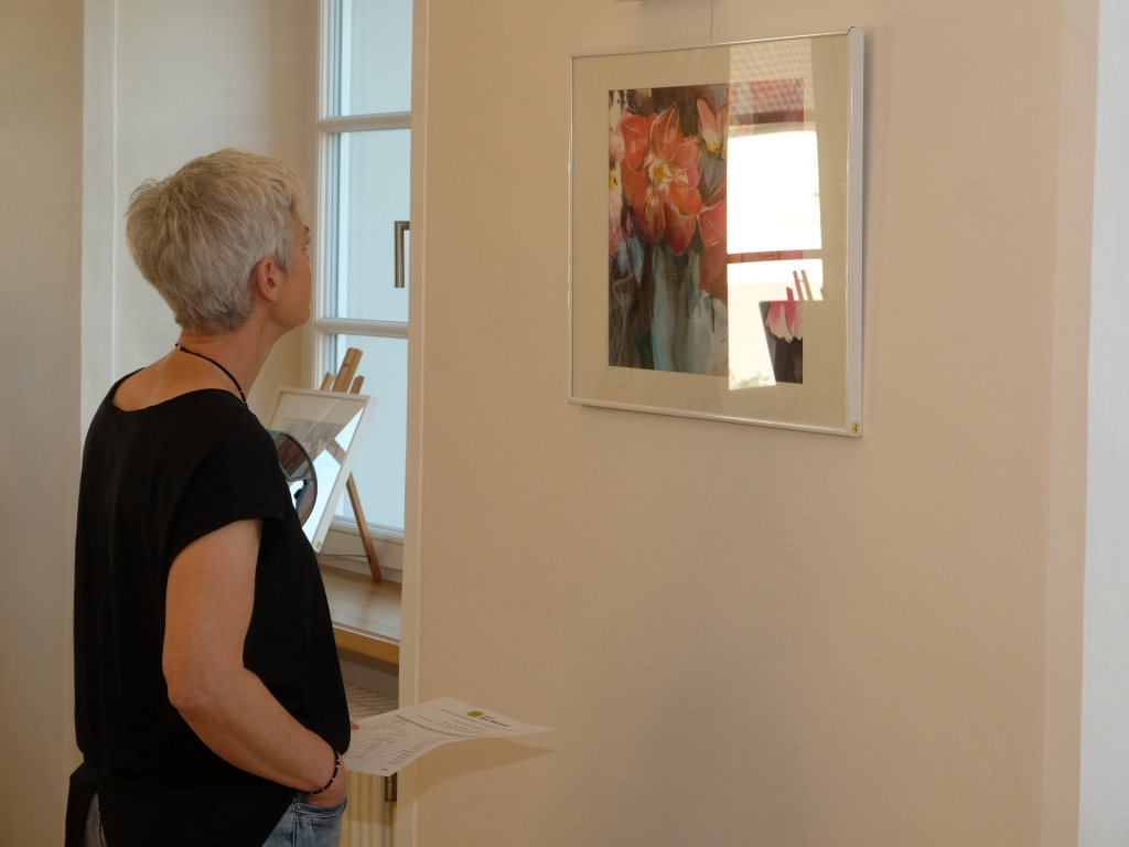 Ihre Lieblingstechnik war lange Zeit das Aquarell. Während im Maler-Handwerk eine Fläche möglichst gleichmäßig aussehen soll, fordert ein Aquarell Duftigkeit und Leichtigkeit. „Aber während Corona hatte man ja viel Zeit und deswegen habe ich in dieser Zeit verstärkt auch in Öl gemalt. “ Sicherlich auch ein wenig beeinflusst von Leonardo da Vinci, der bei seiner Mona Lisa immer eine Lasur über die andere gelegt hat. Ein klein wenig plauderte Silvia Greiner auch aus dem Nähkästchen: „Irgendwann sagte ich mir, ihr könnt mich mal und entwickelte speziell für meine Portraits eine eigene Technik.“ Sie „grundierte“ bei den Portraits die Gesichtspartien mit Veroneser Grün. Und erhielt über die darübergelegten rötlichen Hauttöne und dem durchschimmernden Grün die gewünschte Plastizität.