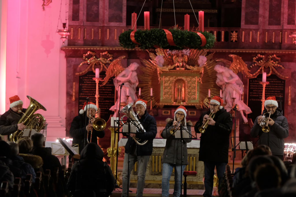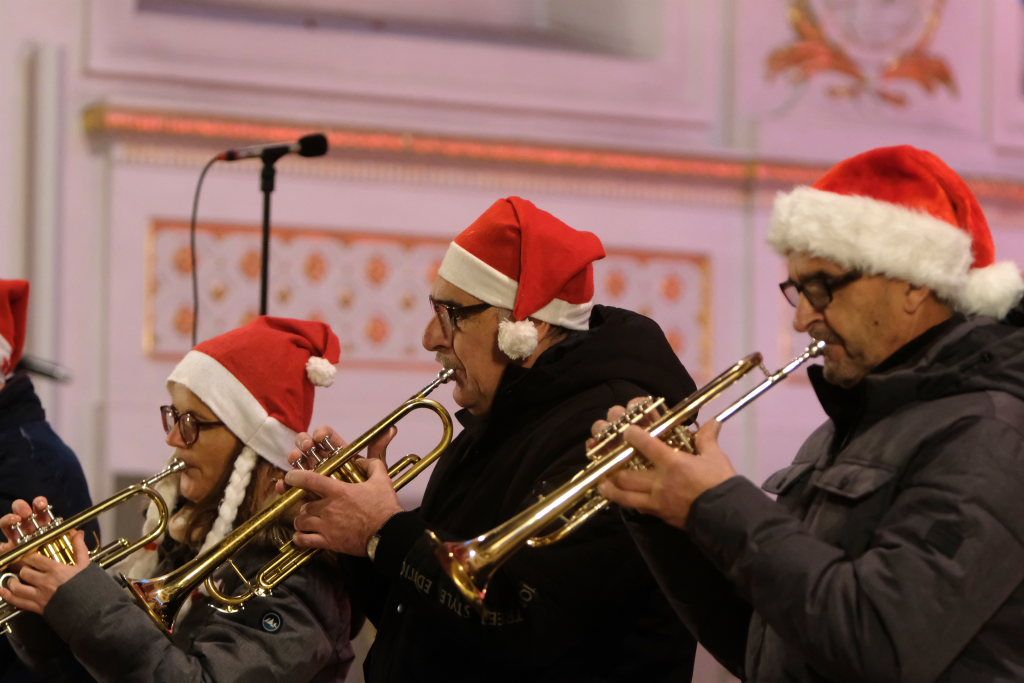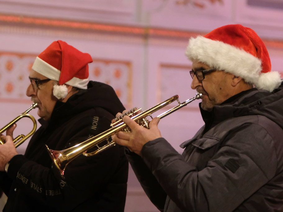 Das Bläsersextett unter der Leitung von Rolf Ritter eröffnete seinen Programmteil mit dem afroamerikanischen Spiritual „Go tell it on the mountain“ dessen Bekanntheit ebenfalls durch Aufnahmen von diversen Pop-Künstlern herrührt. „Joy to the world“ haben viele Größen des Musikgeschäfts in ihren Weihnachtsalben verewigt, etwa Jonny Cash, Neil Diamond, The Kelly Family, aber auch Startenöre wie Placido Domingo oder Peter Hofmann. Mit „Frosty the snowman“ und „Rudolph, the rednosed Reindeer“ spielten die sechs Bläser zwei Stücke aus dem Bereich (Weihnachts-) Filmmusik, und brachten damit auch eine Prise Humor ins Spiel.