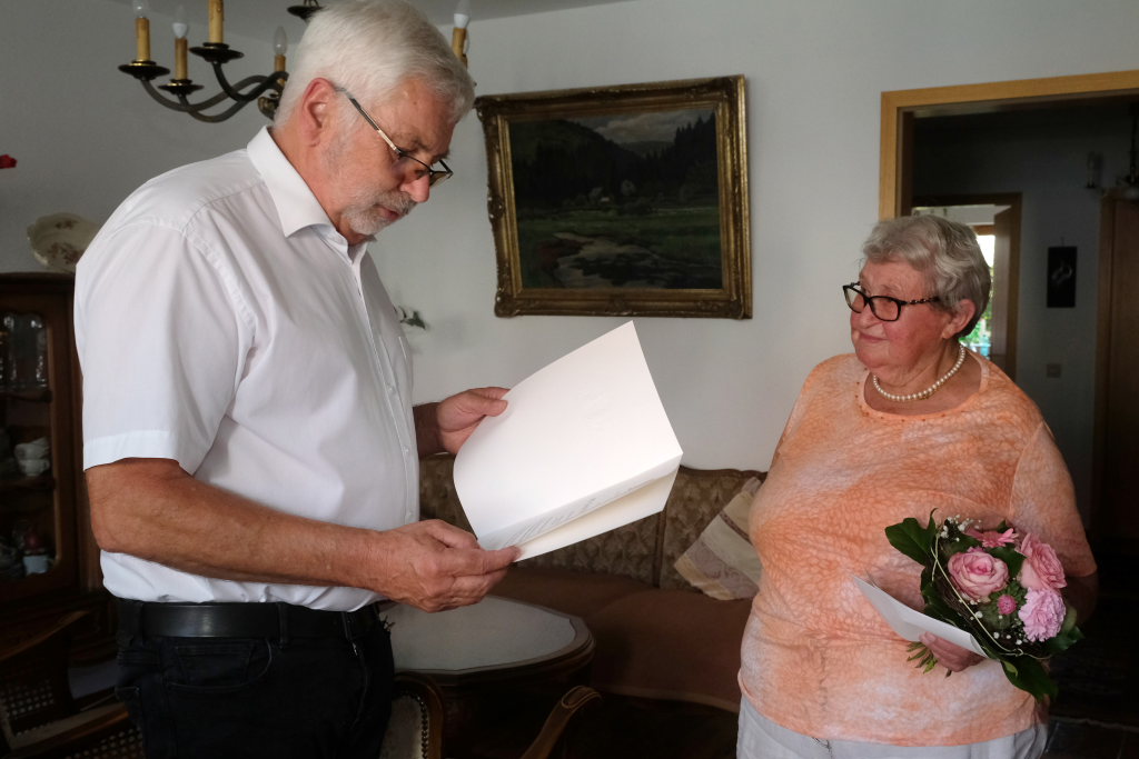 Bad Wurzach – Klaus Schütt als Vertreter für Bürgermeisterin Alexandra Scherer überbrachte der Jubilarin die Glückwünsche und Präsente der Stadt sowie die bei 90. Geburtstagen übliche Urkunde des Baden-Württembergischen Ministerpräsidenten.