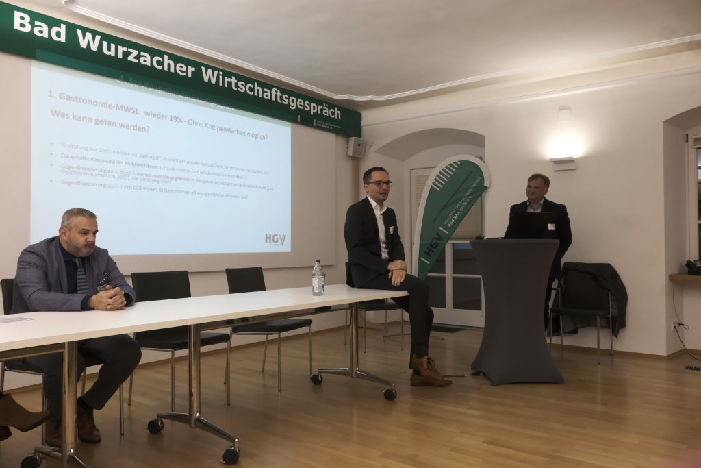 Moderator Friedrich-Thorsten Müller führte im Verlauf des Abends in acht wirtschaftspolitische Themen ein. Er öffnete die Fragerunde mit der geplanten Rückkehr in der Gastronomie auf den alten Mehrwertsteuersatz von 19 Prozent. Strasser sagte dazu, der Widerstand gegen eine Beibehaltung der 7-Prozent-Regelung sinke bei Rot und Grün.