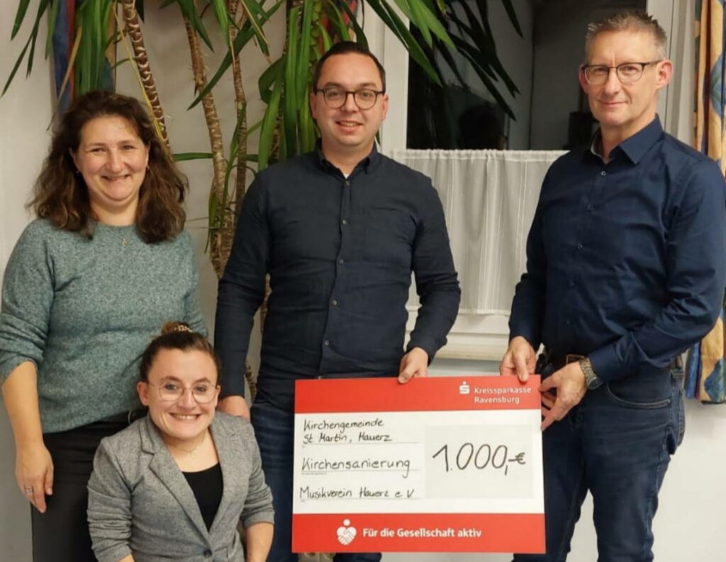 Der Musikverein Hauerz überreichte der Kirchengemeinde Hauerz einen Spendenscheck über 1000 €. Unser Bild zeigt von links die Vorsitzenden Ingrid Ritscher und Daniela Buckenheu, in der Mitte Vorsitzender Dominik Müller und rechts auf dem Bild ist der Gewählte Vorsitzende des Kirchengemeinderats Richard Waizenegger zu sehen.