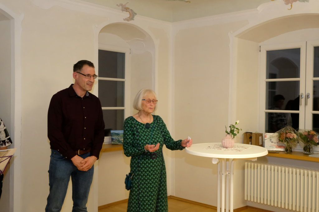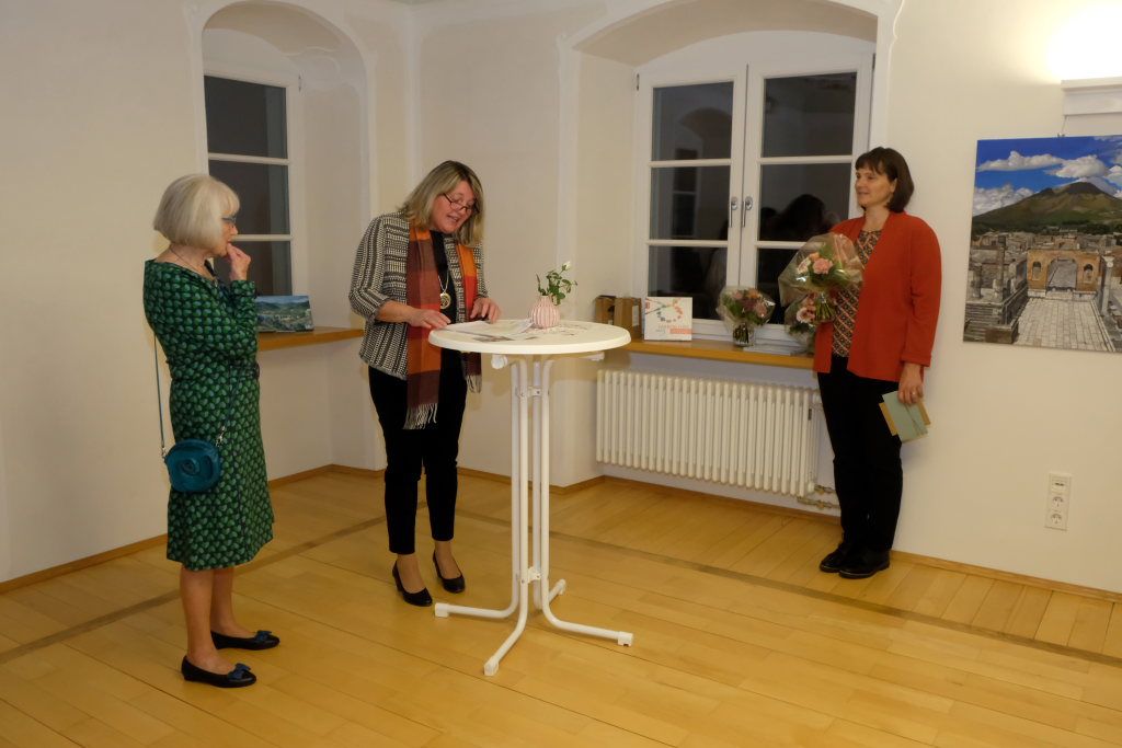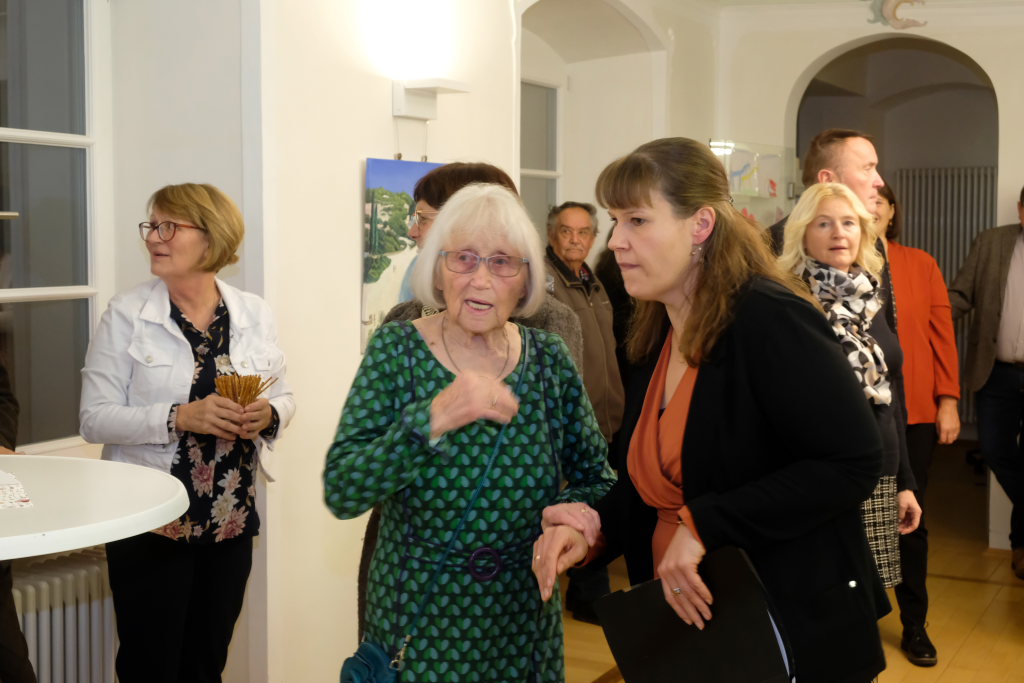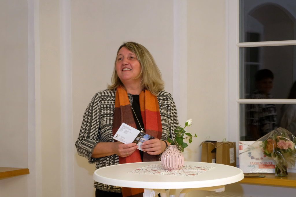 Die Bürgermeisterin sagte in ihrer Laudatio auf Stäbler, es sei ihr bei den 150 Ausstellungen, die sie mit viel Herzblut im Ehrenamt organisiert hatte, darum gegangen, jungen talentierten Künstlern ein Forum zu bieten. Ihrem Engagement sei es auch zu verdanken gewesen, dass die Galerie nun im Kapitelsaal ausstellen könne. „Sie haben große Spuren hinterlassen!“ Hinter der Organisation einer Ausstellung stecke viel Arbeit: Künstlerbesuche, um das Jahresprogramm für die Ausstellungen festzulegen, Werbung und schließlich Mithilfe beim Hängen der Bilder.
