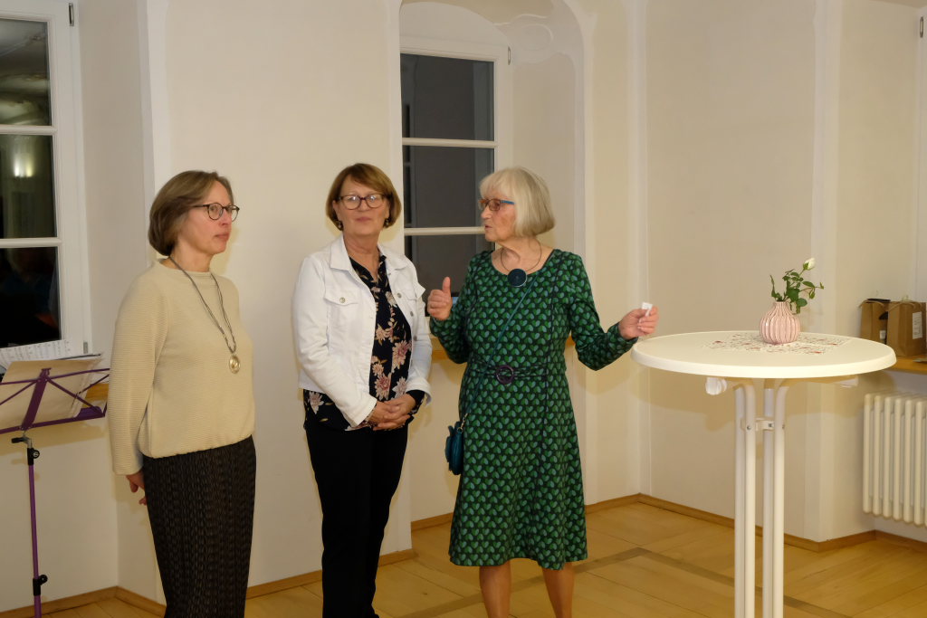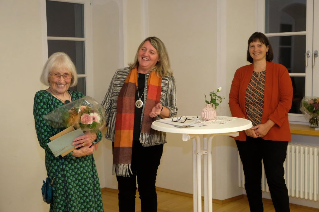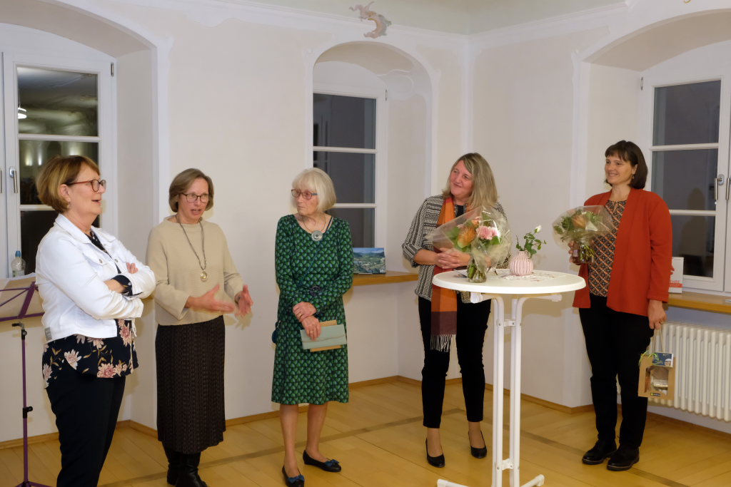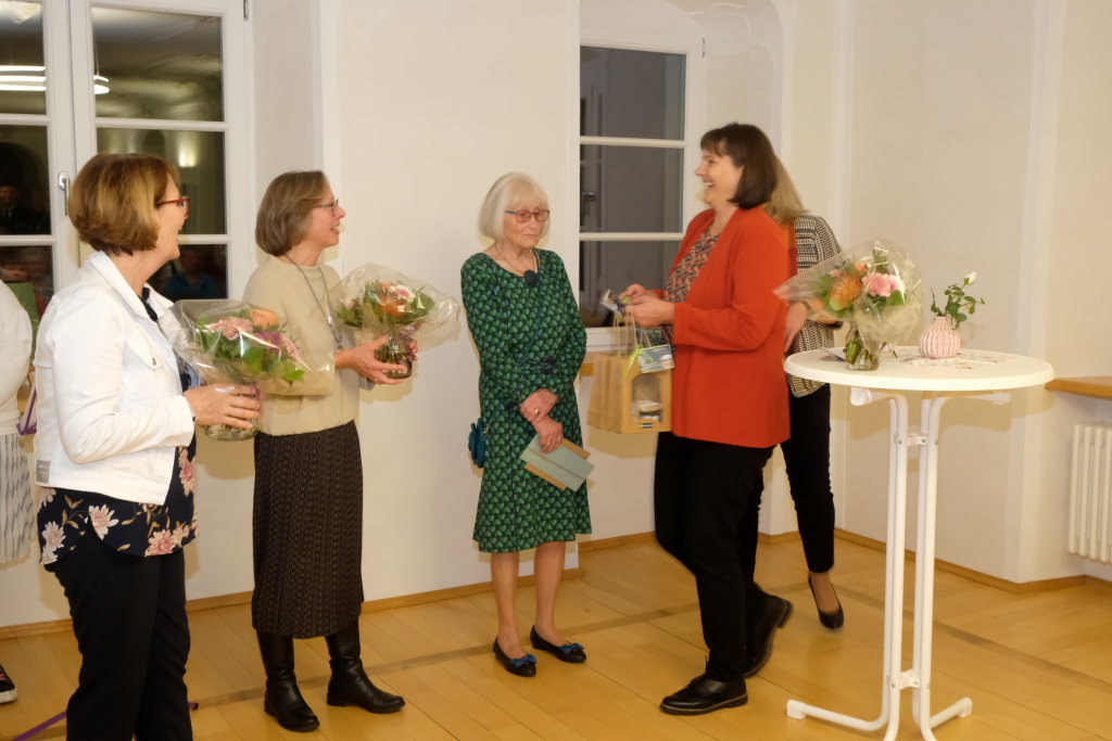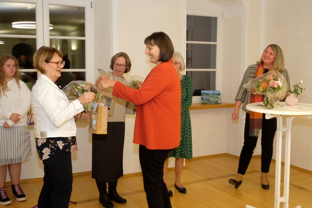 Die Vernissage zu „Der Weg“ war die letzte, die unter der Leitung von Rosemarie Stäbler stattfand. Nach über 150 Kunstausstellungen in 26 Jahren als Kuratorin gibt Rosemarie Stäbler dieses Ehrenamt an ihre Nachfolgerinnen Christiane Linge und Doris Schäfer ab, die im Rahmen dieser Ausstellungseröffnung von Bürgermeisterin Alexandra Scherer vorgestellt wurden. Zu Ehren von Rosemarie Stäbler waren auch Fachbereichsleiterin Sonja Wetzel und die in der Verwaltung für die Ausstellungen Verantwortliche Vanessa Fischer zu der Vernissage gekommen.