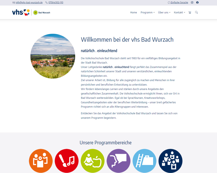 Im Rahmen des aktuellen Zertifizierungsprozesses wurde die Online-Präsenz der Volkshochschule grundlegend überarbeitet und neu gestaltet. Mit einem modernen und benutzerfreundlichen Design sowie einer übersichtlichen Navigation ist der Zugang zur vhs so einfach wie noch nie. Die neue Website ist barrierefrei und enthält zusätzlich viele Informationen auch in leichter Sprache. Damit wird sichergestellt, dass alle Interessierten die Möglichkeit haben, sich über die Angebote und Programme der vhs informieren zu können. Neben Bildern der verschiedenen Kursgebäude sowie Dozentenvorstellungen gibt es viele weitere Inhalte zu entdecken. Die vhs Bad Wurzach freut sich über ihren Besuch auf www.vhs-bad-wurzach.de