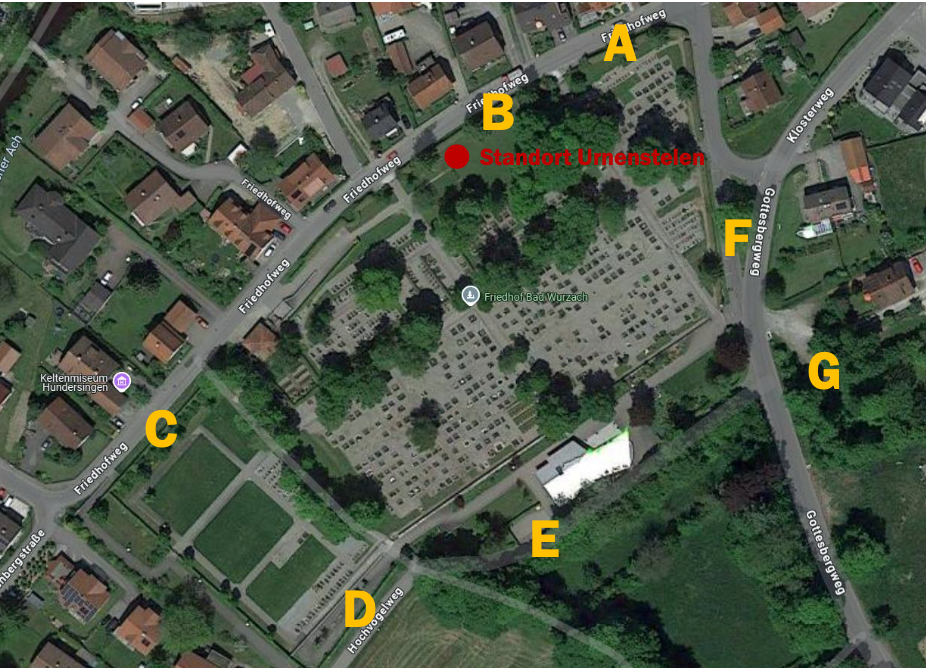 Bei den Parkplatzmöglichkeiten wird es einige Änderungen geben. Die Park-Möglichkeiten in Fassnachtsgrüble (G) sollen aufgeschottert werden, so dass dort einige Plätze mehr zur Verfügung stehen werden als bisher. Die sechs Parkplätze beim oberen Eingang von Friedhof und zur Aussegnungshalle (F) werden neu geordnet und entsprechend angelegt. Die Planung von fünf Querparkplätze (B) am Friedhofweg im Bereich der bisherigen Urnenstelen und der Grabstellen der Sternenkinder wird aufgegeben, da diese zu weit in das Friedhofsareal hineinreichen würden und darüberhinaus zu einer verschärften Verkehrssituation beim Ein- und Ausparken führen würden. Am nordöstlichen Teil zur Einmündung des Friedhofwegs in den Gottesbergweg (A) werden drei Längsparkplätze geschaffen werden.