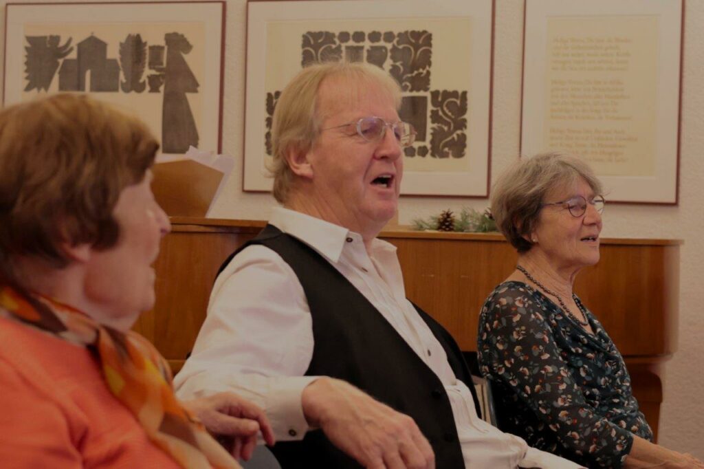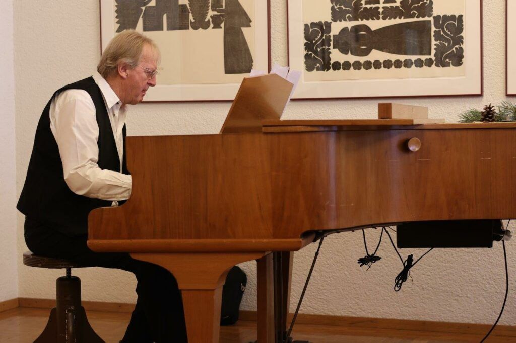 Hansjörg Schick half mit dem hervorragend rezitierten Zauberlehrling von Friedrich Schiller weiter. Zum Mitsingen hatte Peter Schad aus dem Schatz von Adventsliedern sehr wertvolle und erwartungsgetragene Lieder herausgesucht, auf dem Klavier begleitet und auch vorgesungen, so dass sich viele Stimmen aus der Runde mitzusingen trauten.
