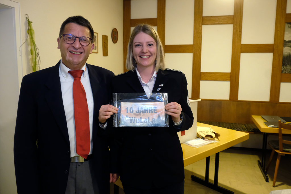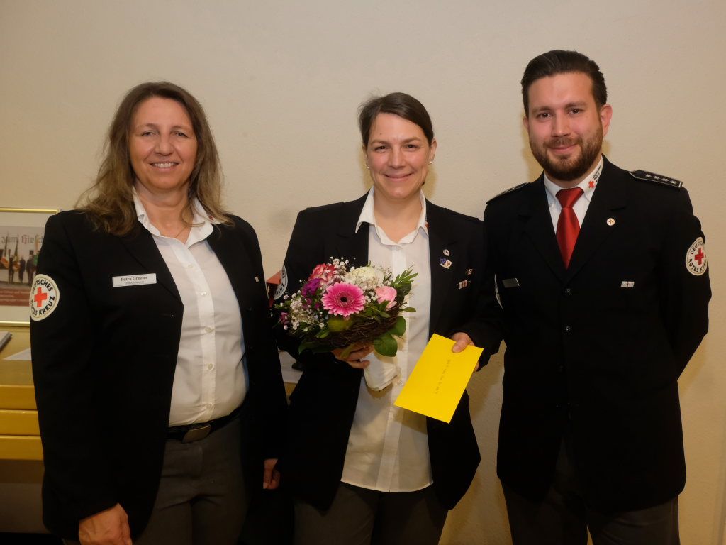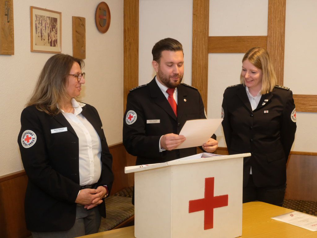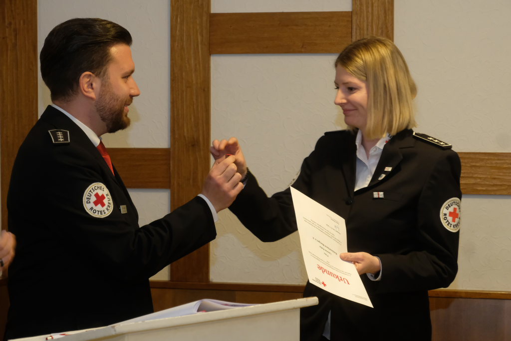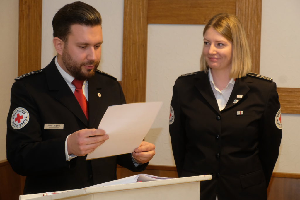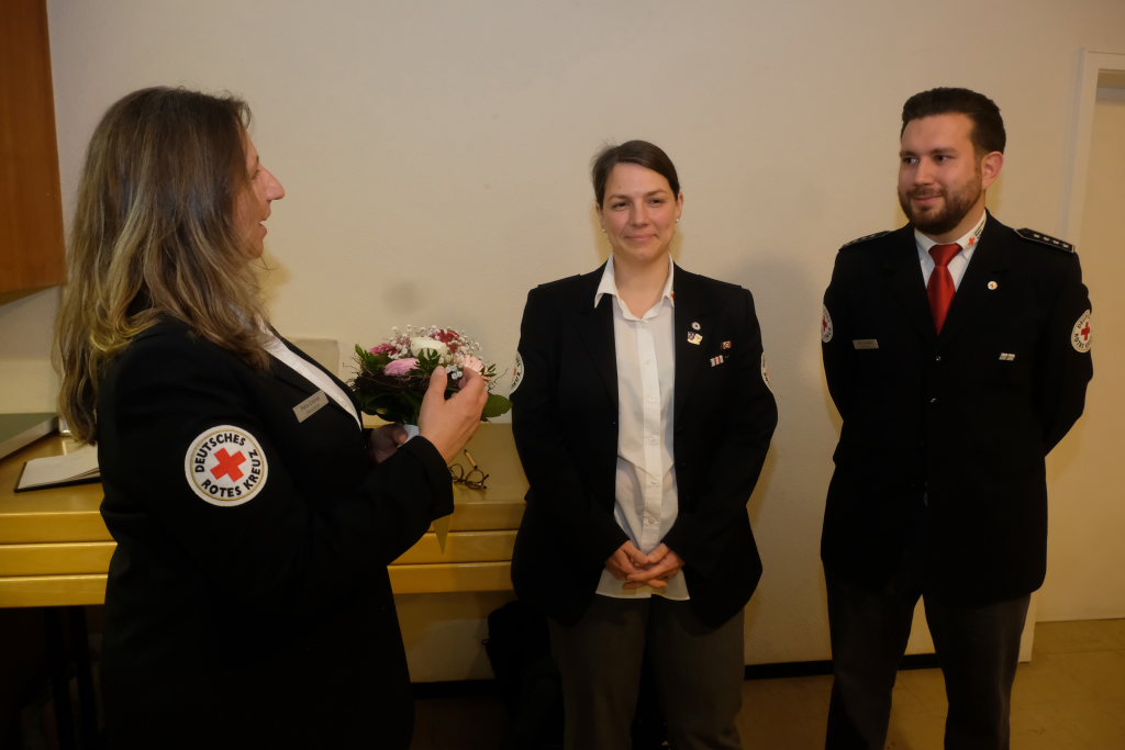 Bereitschaftsleiter Nick Leupolz konnte mit Ramona Ringelbach einer Neuaufnahme ihren Mitgliedsausweis übergeben. Allerdings musste er auch mit Nadine Frey ein – wie er es nannte „Urgestein“ – aus dem Leitungsteam der Bereitschaft verabschieden. Seit 1995 beim DRK Bad Wurzach, war sie zunächst sieben Jahre beim JRK, bis sie 2002 zur Bereitschaft wechselte. Sie gehörte seit 2008 zum Leitungsteam der Bereitschaft, war also stolze 17 Jahre dort tätig. Zu ihren Kernaufgaben zählte neben der Ausbildung die Kleider- und Mitgliederverwaltung und das aktualisieren der Telefonliste. Ihre Highlights in dieser langen Zeit war 2013 die Beschaffung und Ausstattungsplanung des VW-Busses und im Jahr darauf stellte sie zum 100-jährigen Jubiläum des Ortsvereines eine Ausstellung von historischen DRK Materialein mit historischen Ausstattungskoffern und Uniformen etc. auf die Beine. Bei der Planung der neuen Küche im DRK-Heim war sie federführend dabei. Und auch bei der Einrichtung der Corona-Teststationen habe Nadine „Vollgas gegeben“. „Du hast die Messlatte für deine Nachfolger sehr hochgelegt.“ Die Angesprochene gab den Dank zurück: „Das alles ging immer nur, weil mich ein tolles Team unterstützt hat. Einer allein schafft nichts.“ Wichtig sei ihr auch immer die Kameradschaft gewesen.