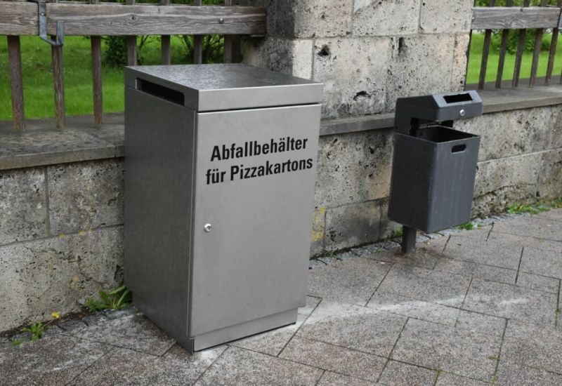 Zwei Abfallbehälter für Pizzakartons in der Innenstadt aufgestellt