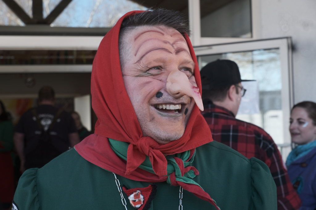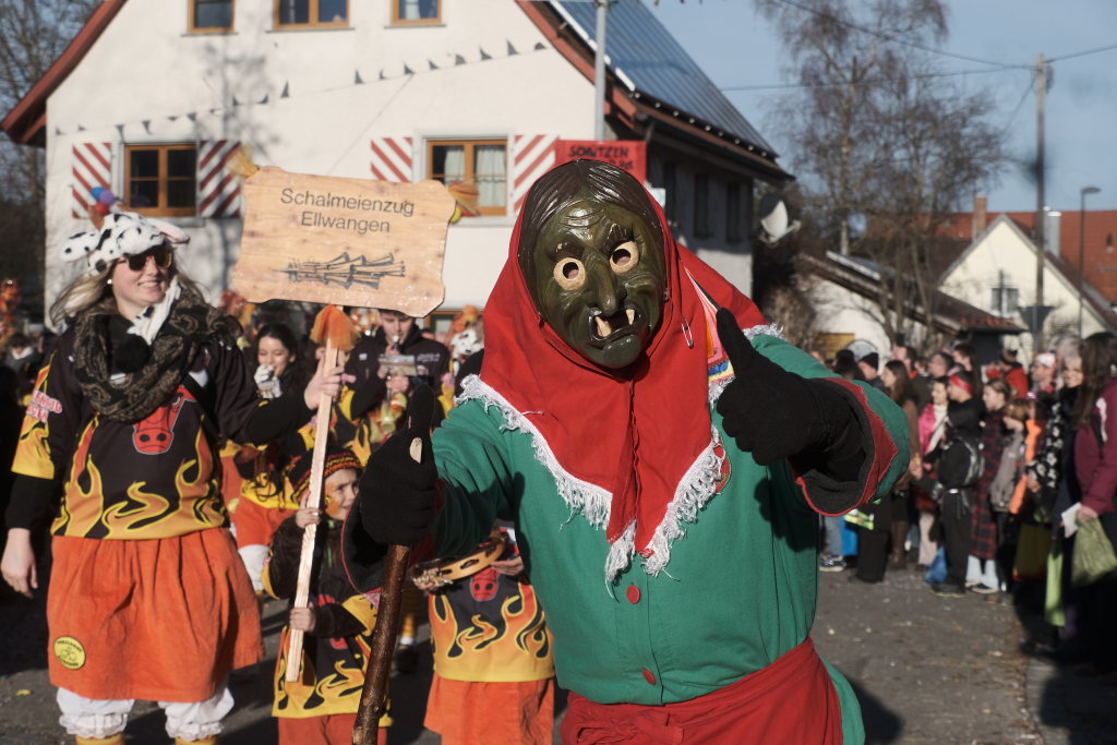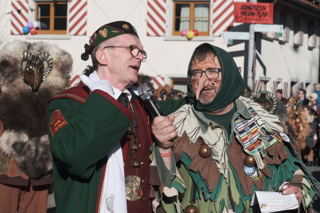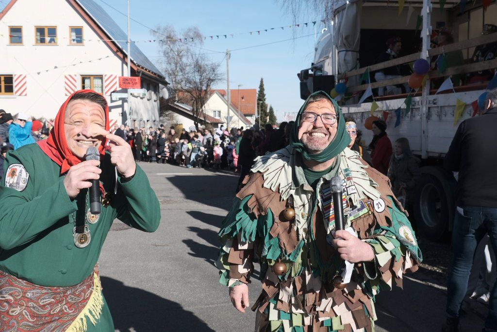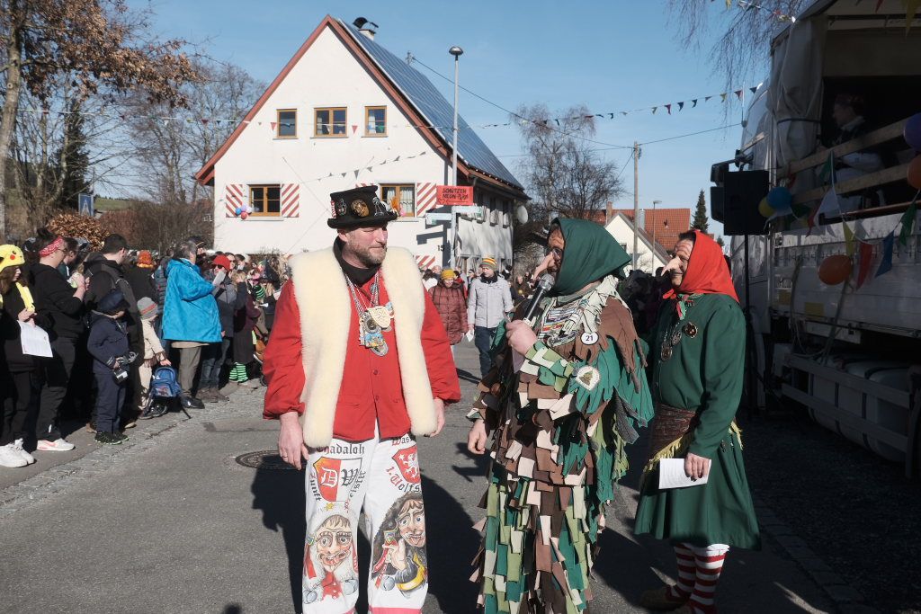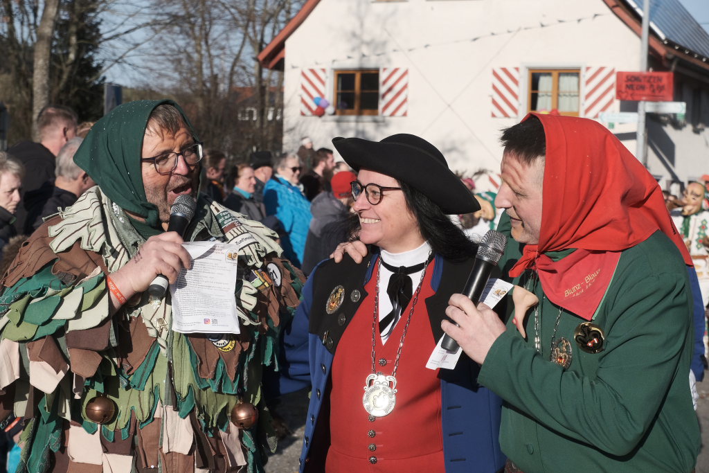 Unten auf der Straße versorgten wieder Günther „Turbo“ Angele, Wassners Zunftmeisterkollegen und Alex Wild mit Kopftüchern und Hexennasen als nimmermüde Sonja Schrecklein-Doubles das selbstredend verkleidete Publikum mit den Narrenrufen der Hästräger. Im Mittelpunkt ihres neckischen Geplänkels stand in diesem Jahr die Regionen-Einteilung des ANR, wo die Haidgauer und die Heimatzunft der Ellwanger Bahwaldbohle von Turbo Angele beispielsweise der Region Allgäu zugeschlagen war, obwohl die Orte geografisch fast im Herzen Oberschwabens liegen …