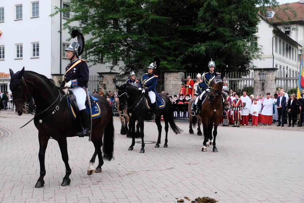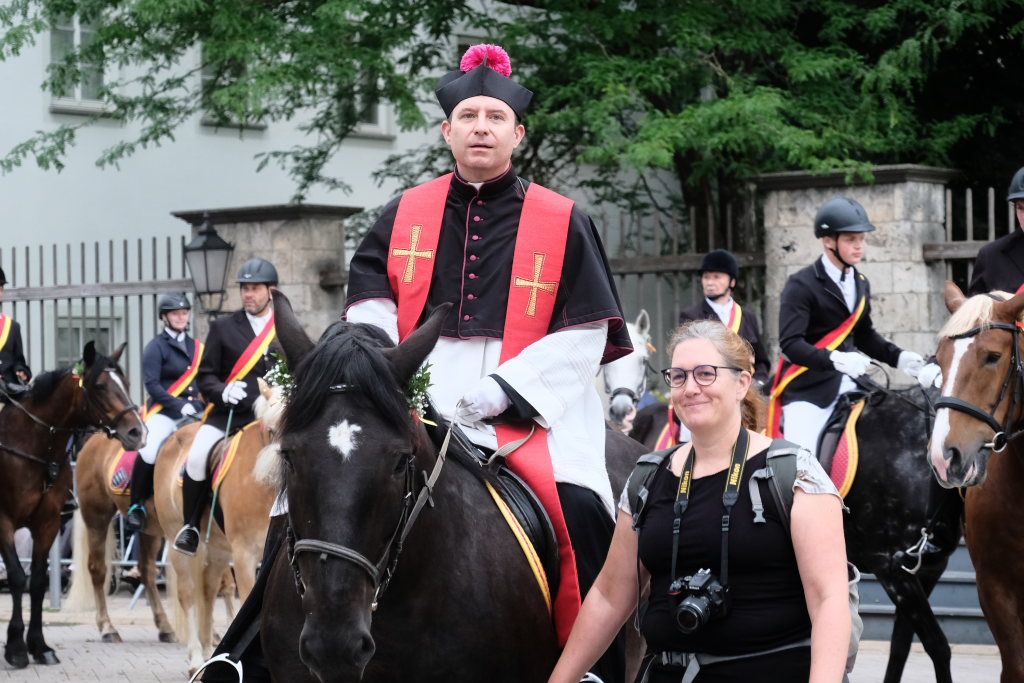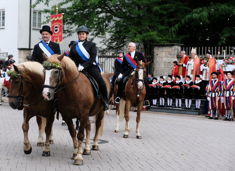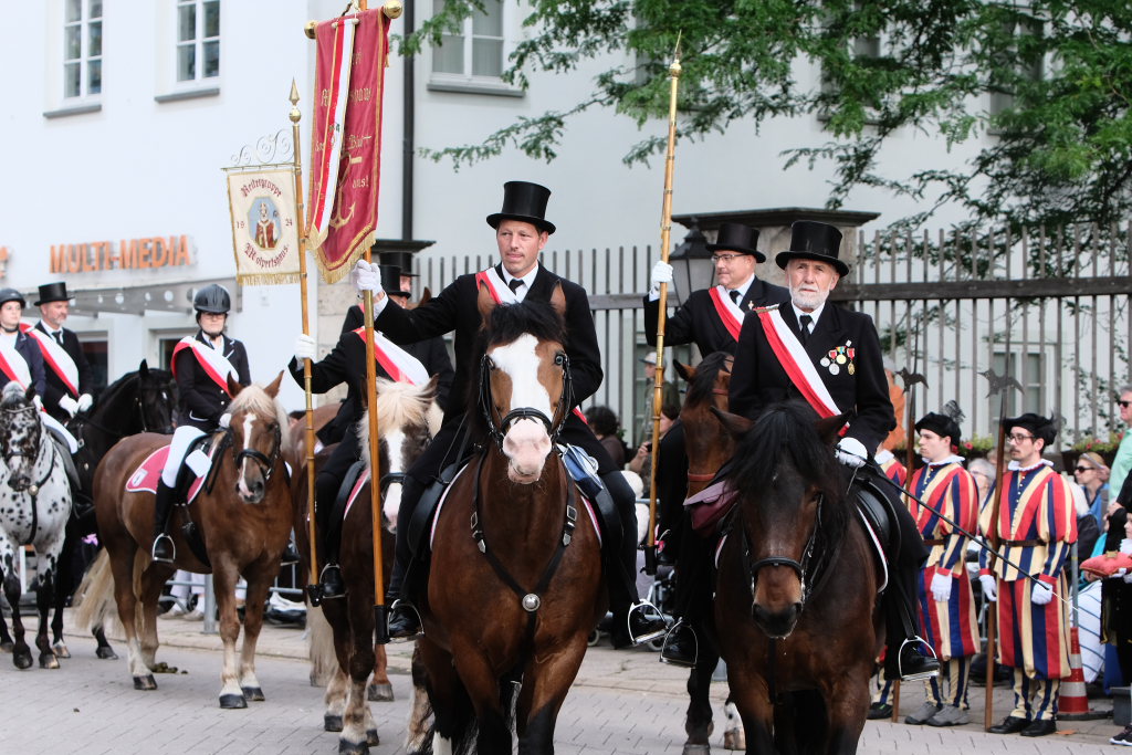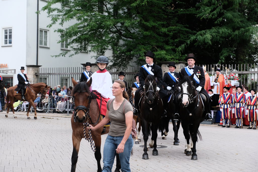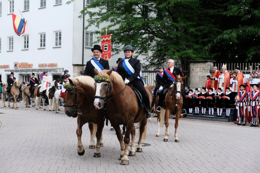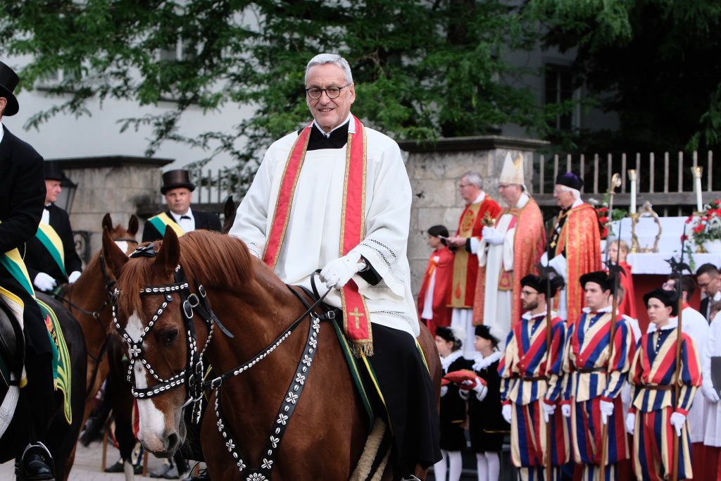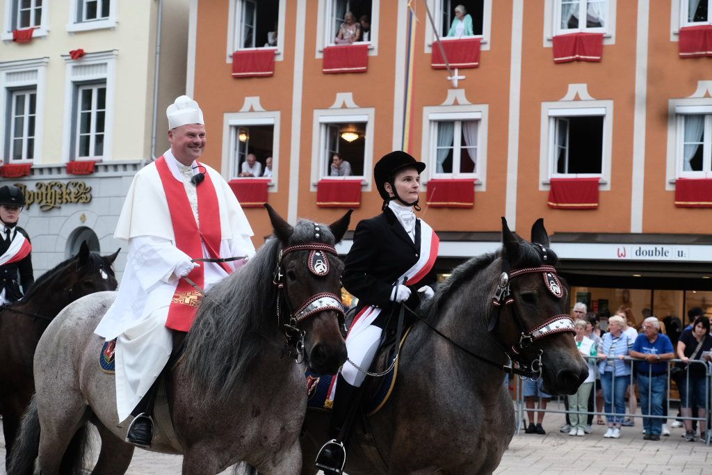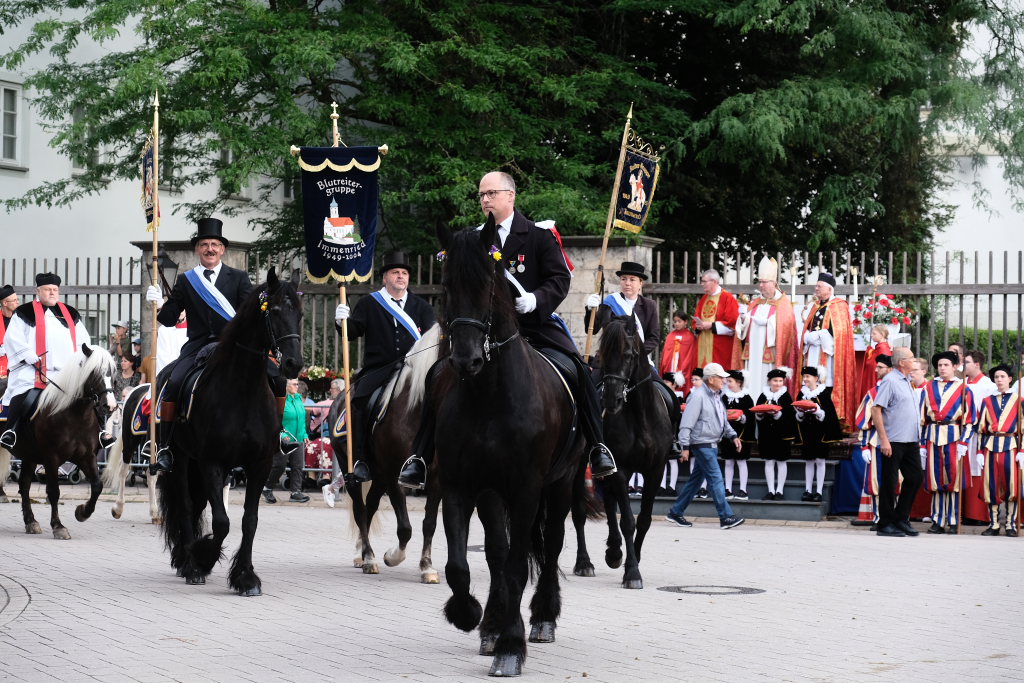 Am Fuße des Gottesberges übernahm dann der Abt Vinzenz Wohlwend OCist wieder die Reliquie, um auf dem Podest an der Straße der zweiten Abteilung der insgesamt 65 Blutreitergruppen und 23 Musikkapellen den Segen zu spenden.