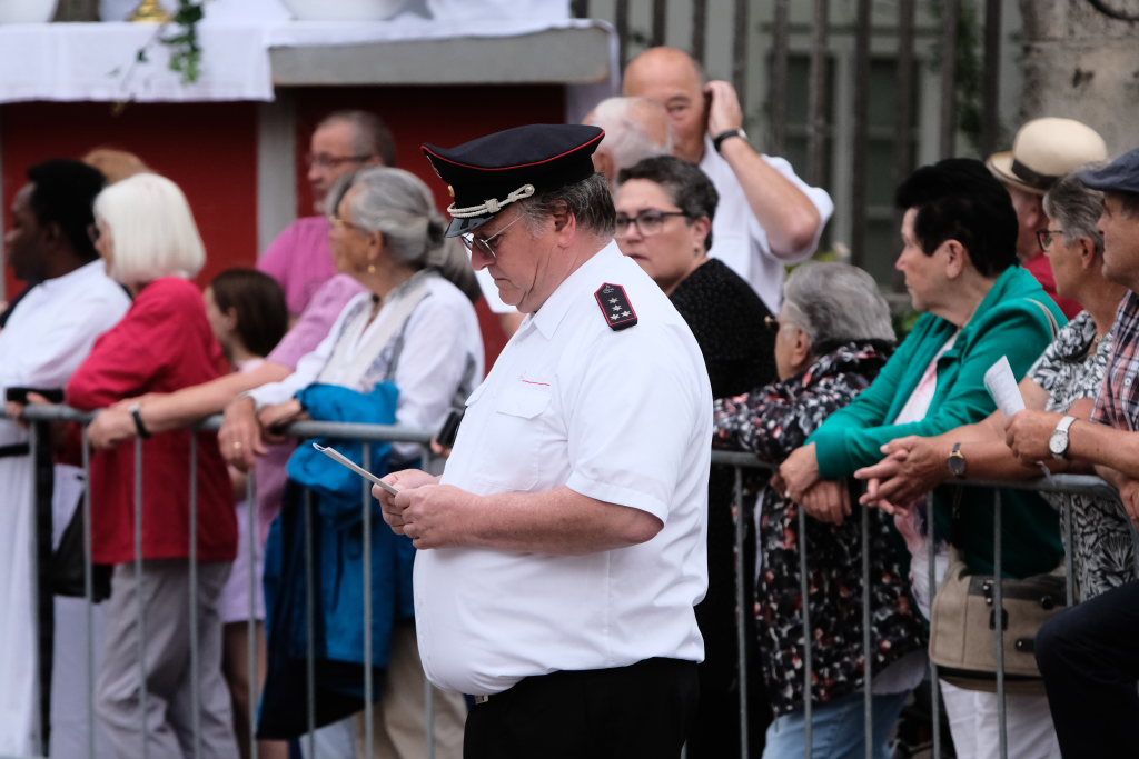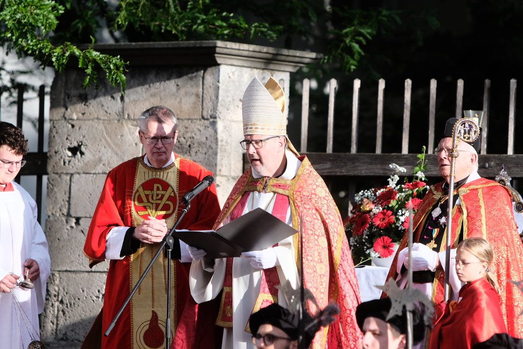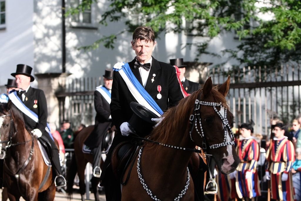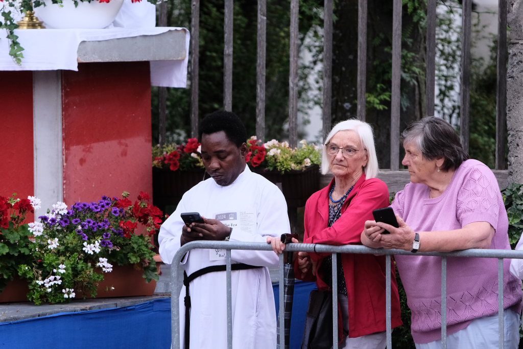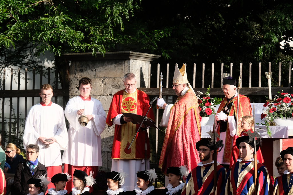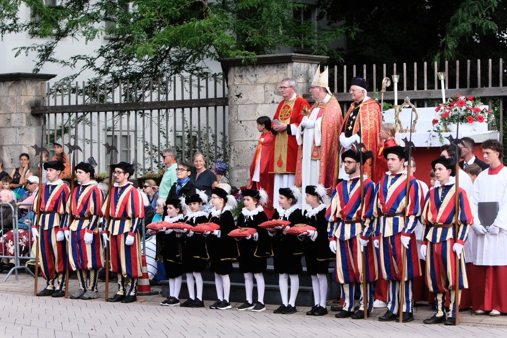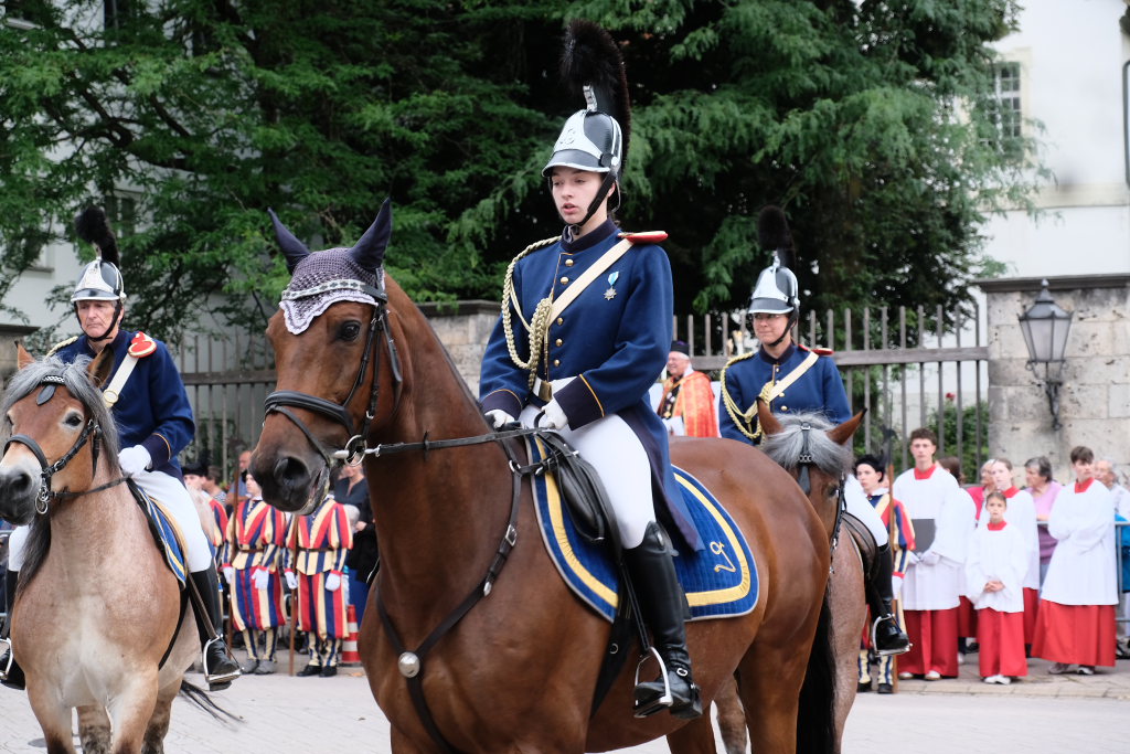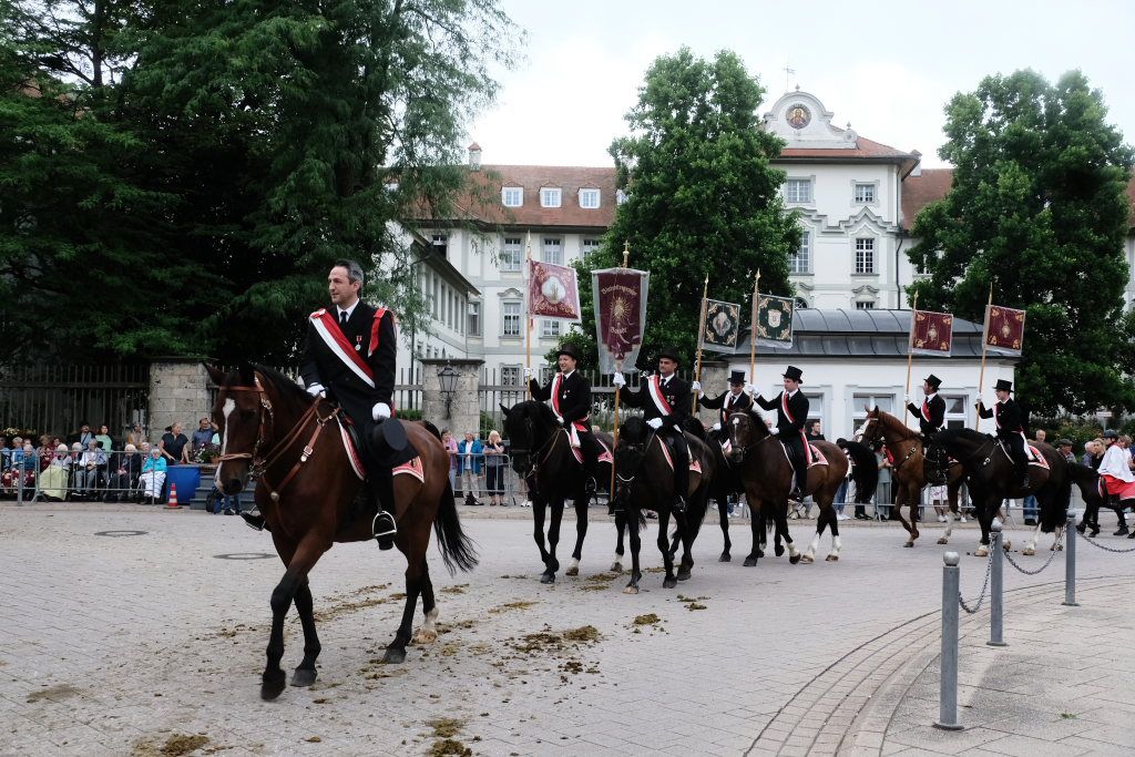 Am Fuße des Gottesberges übernahm dann der Abt Vinzenz Wohlwend OCist wieder die Reliquie, um auf dem Podest an der Straße der zweiten Abteilung der insgesamt 65 Blutreitergruppen und 23 Musikkapellen den Segen zu spenden.