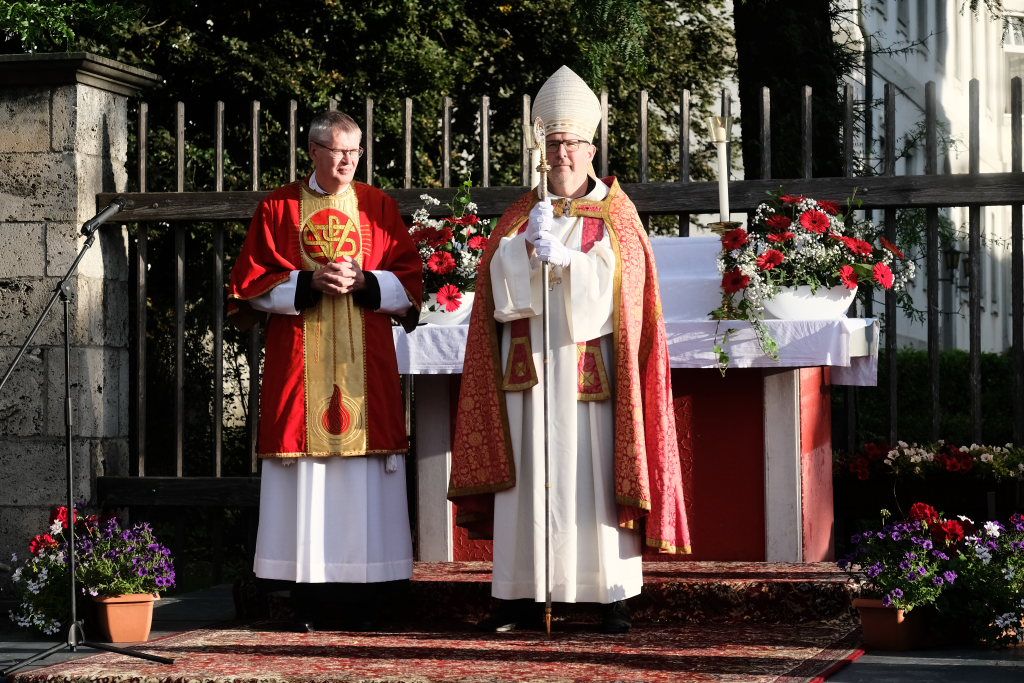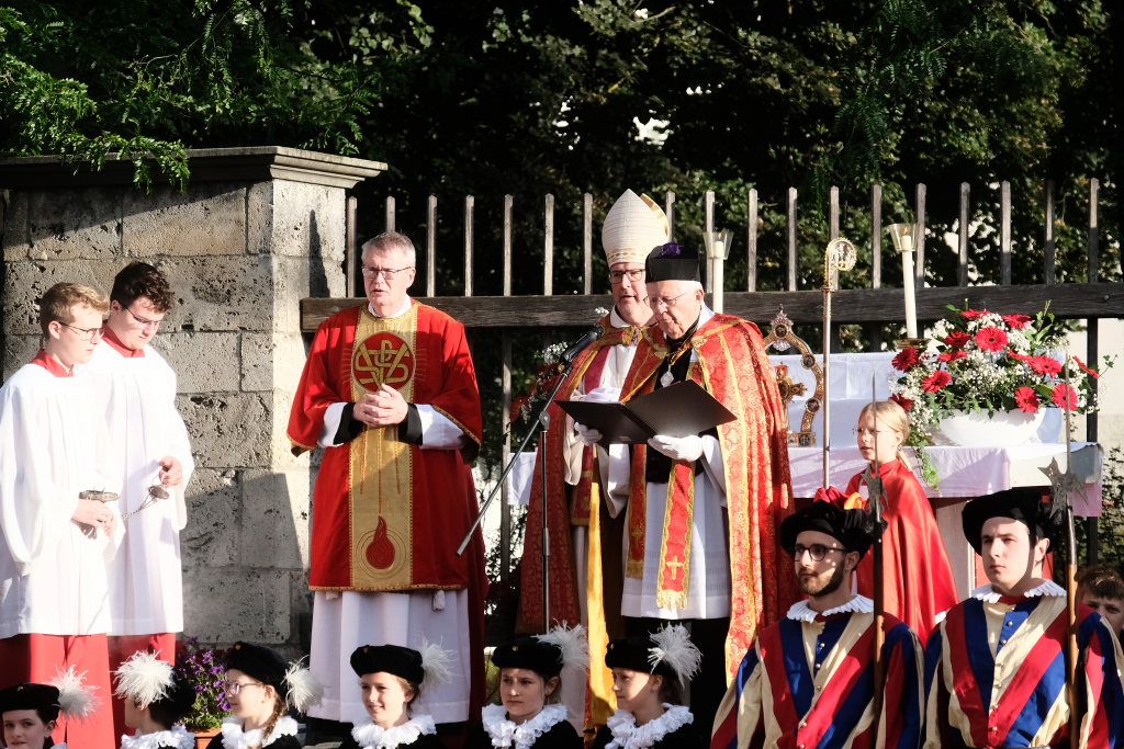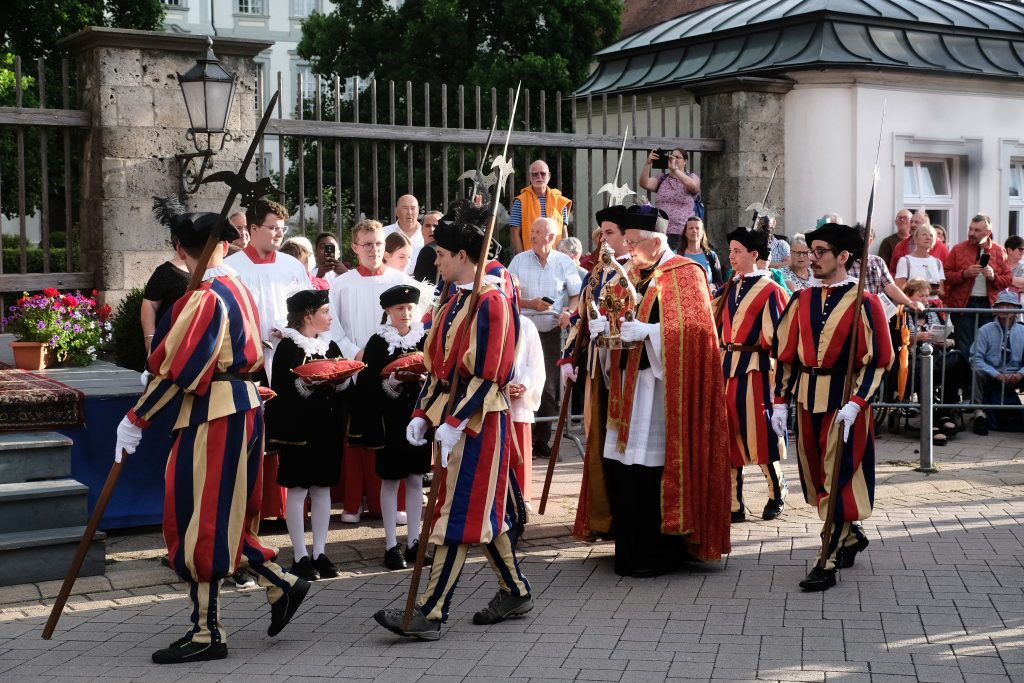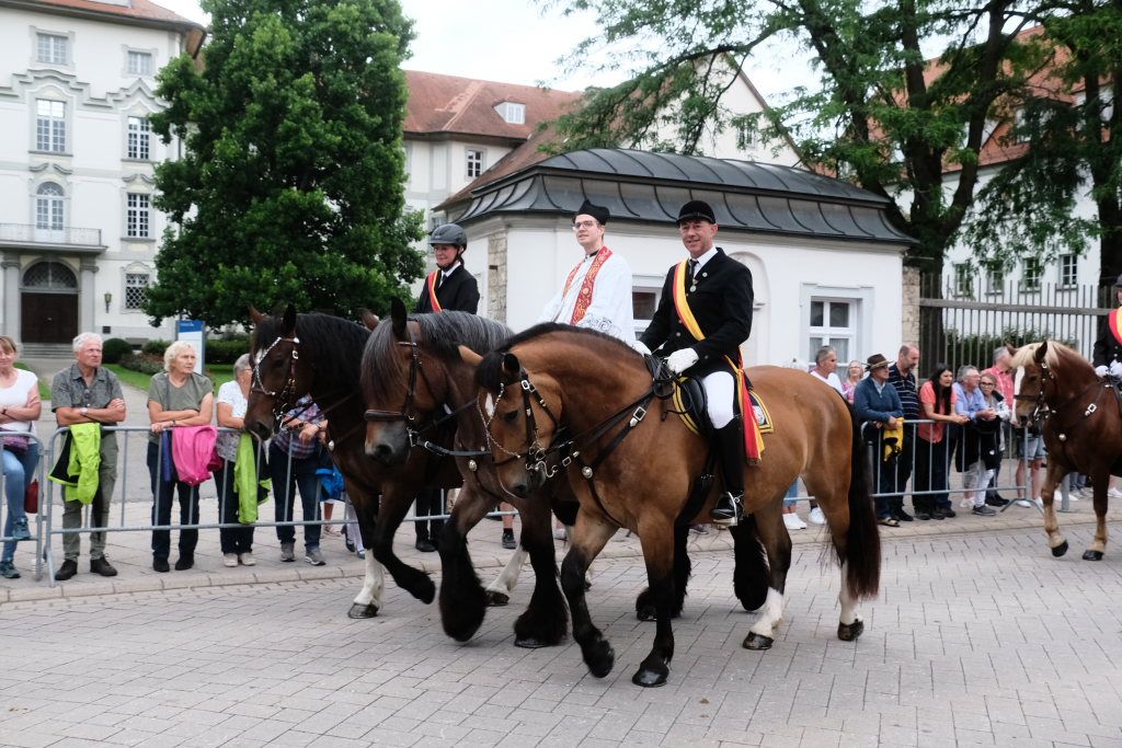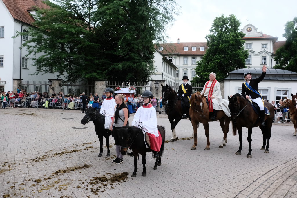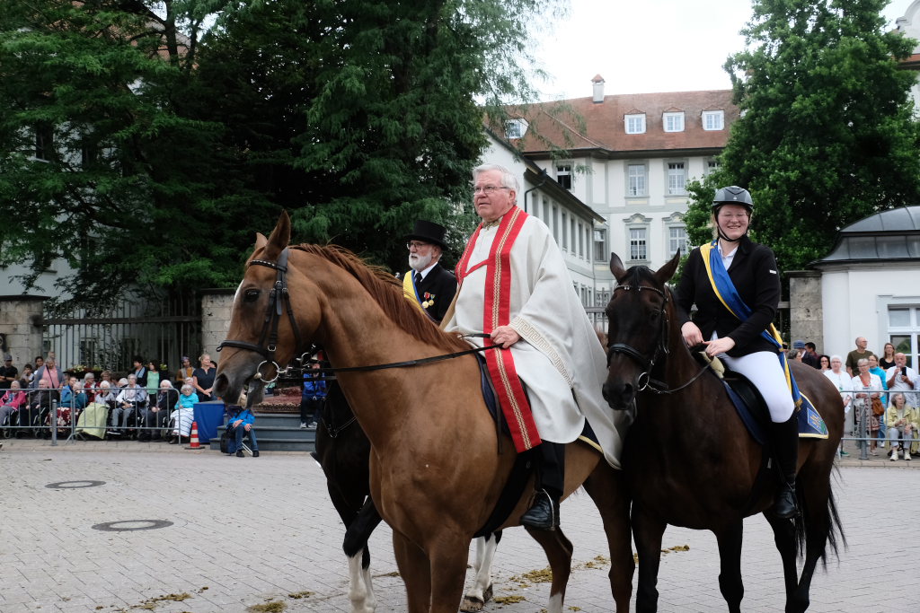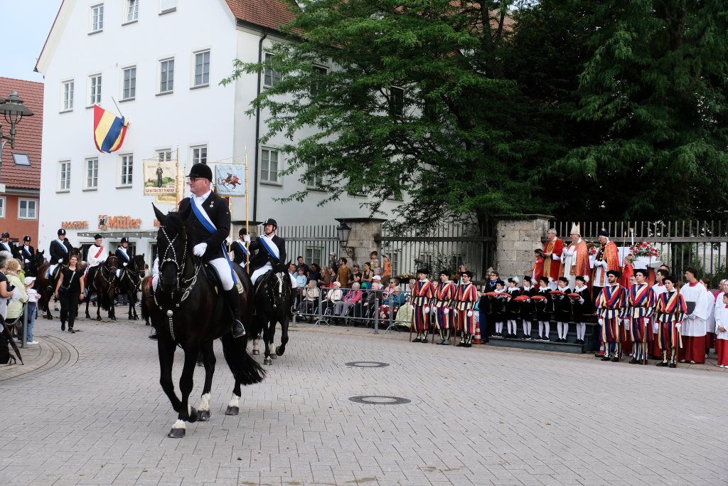 Pünktlich nach dem letzten Glockenschlag des Sieben-Uhr-Läutens von St. Verena nahm Norbert Wahl im Blutwagen Platz, dessen erster Weg die wenigen Meter waren, um die Reliquie zum Segnungsaltar beim Schloss zu bringen, wo Provinzial Pater Dr. Friedrich Emde die Monstranz mit der Reliquie – das Reliquiar – Abt Vinzenz Wohlwend OCist von der Abtei Wettingen-Mehrerau überreichte. Nach einer Lesung erteilte dieser mit dem aus dem Reliquiar entnommenen Kreuz den Pilgern und der ersten Abteilung der Reitergruppen den Segen.