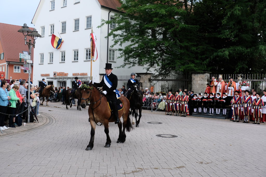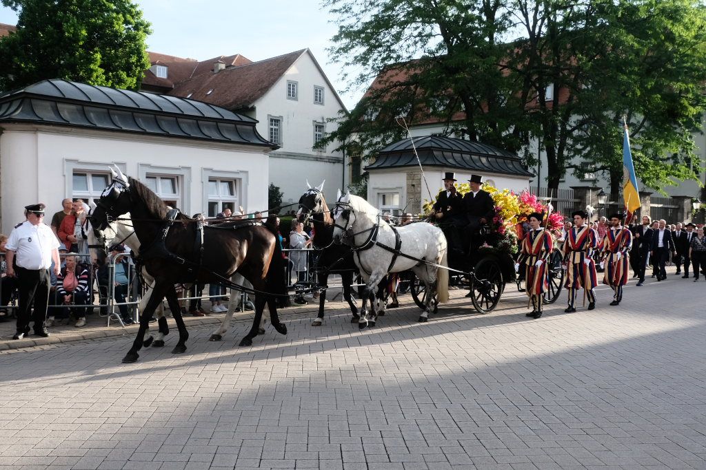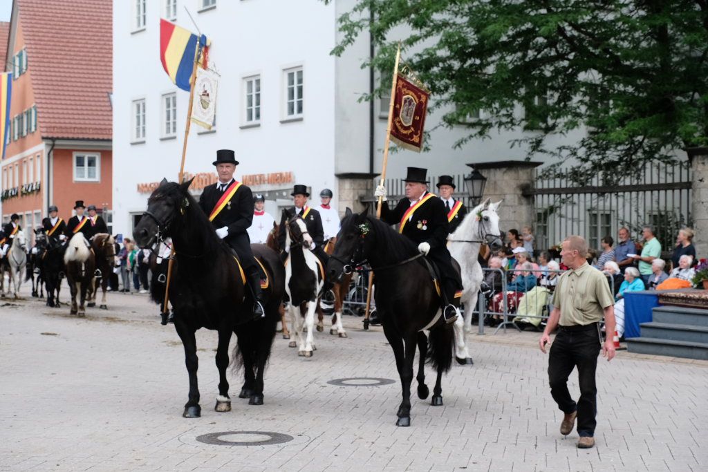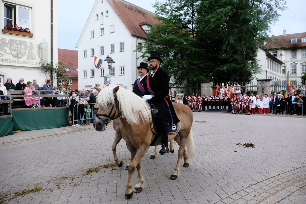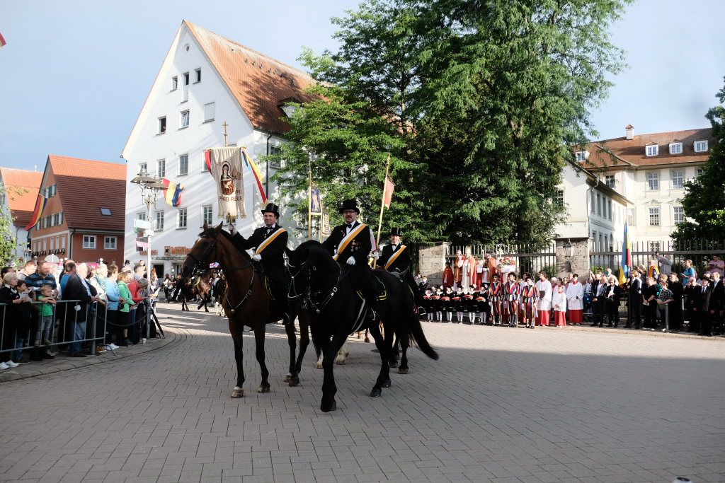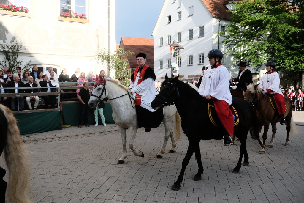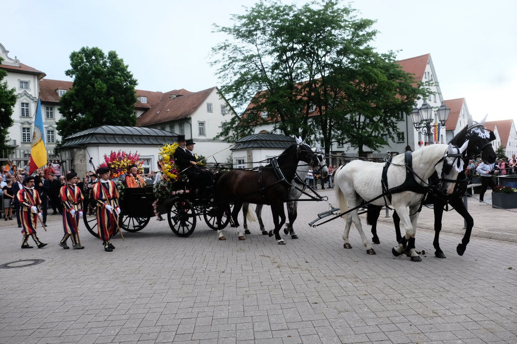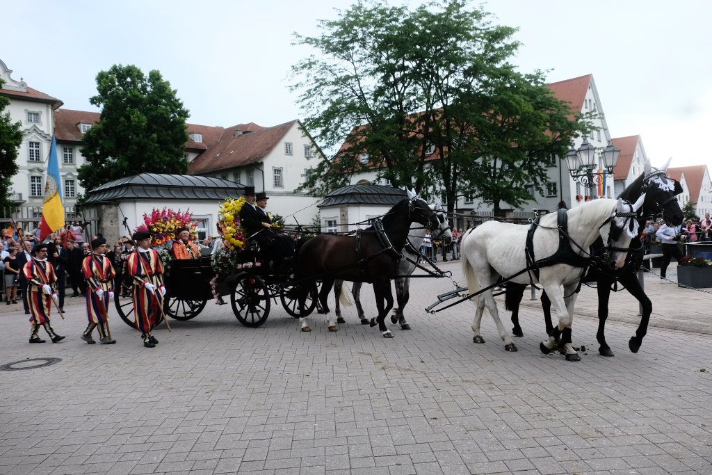 Nachdem der Heiligblutwagen mit Pfarrer Norbert Wahl wieder das Reliqiar, das prächtige Schaugefäß, übernommen hatte, ging es vorbei an den zahlreichen Gläubigen und Ehrengästen und dem geschmückten Amtshaus durch die Mühltorstraße, wo Gläubige noch viele Meter weit den Prozessionsweg säumten, ehe der vierspännige Landauer beim Wohnheim St. Hedwig in Richtung Achberg und der Fluren abbog.