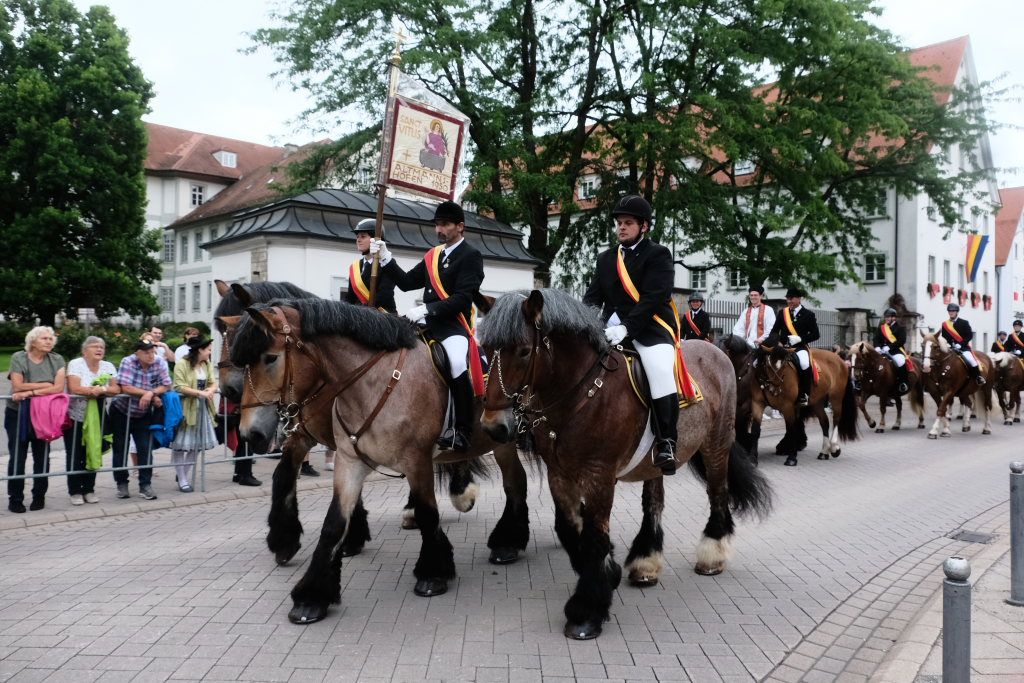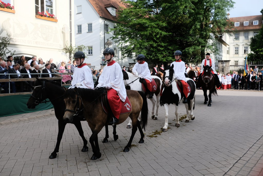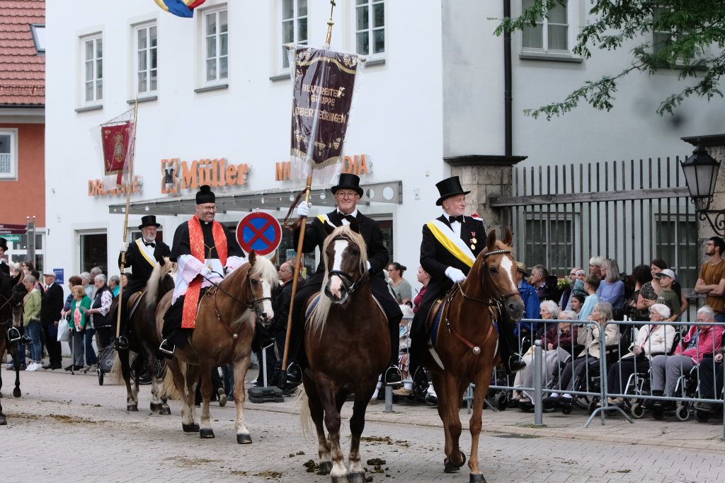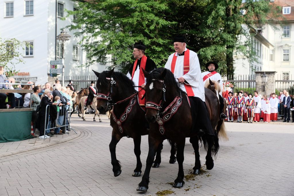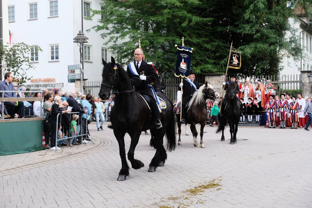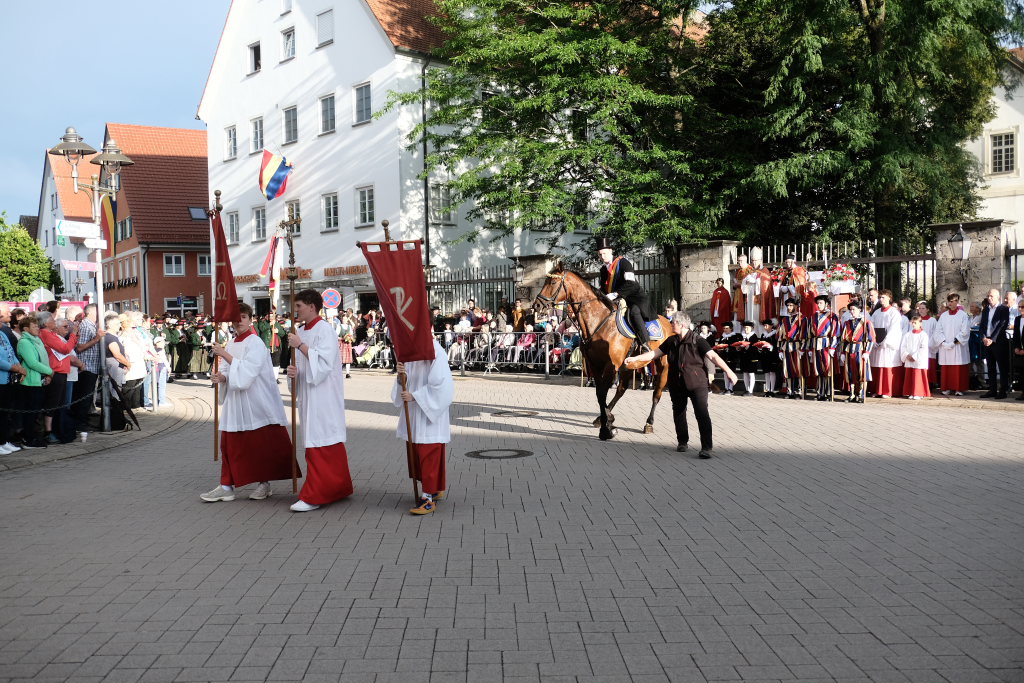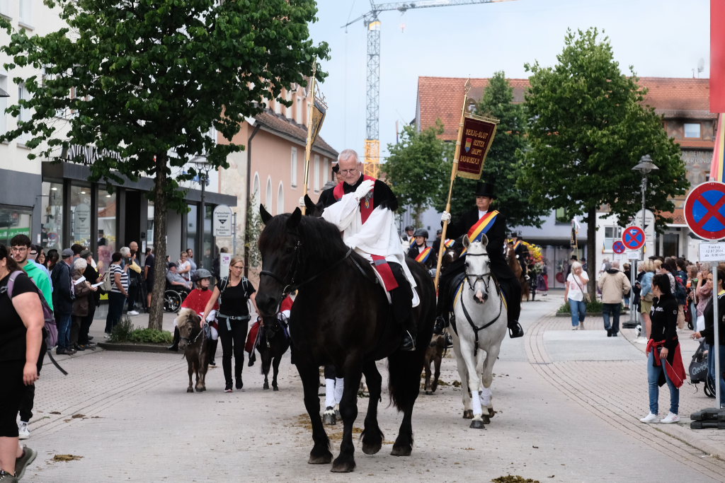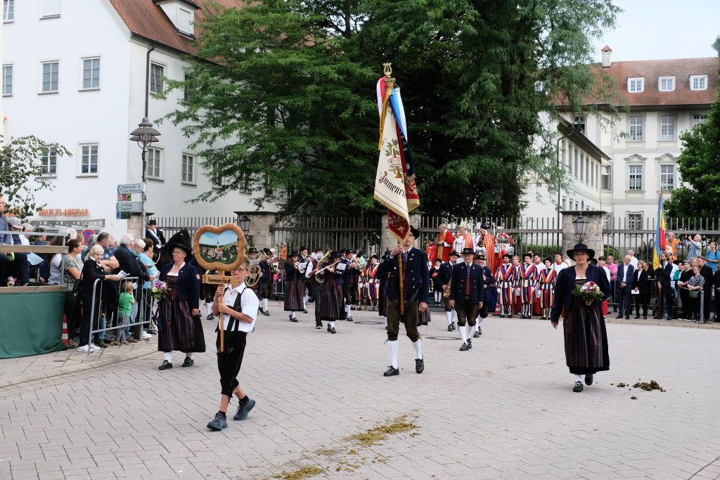 Nachdem der Heiligblutwagen mit Pfarrer Norbert Wahl wieder das Reliqiar, das prächtige Schaugefäß, übernommen hatte, ging es vorbei an den zahlreichen Gläubigen und Ehrengästen und dem geschmückten Amtshaus durch die Mühltorstraße, wo Gläubige noch viele Meter weit den Prozessionsweg säumten, ehe der vierspännige Landauer beim Wohnheim St. Hedwig in Richtung Achberg und der Fluren abbog.