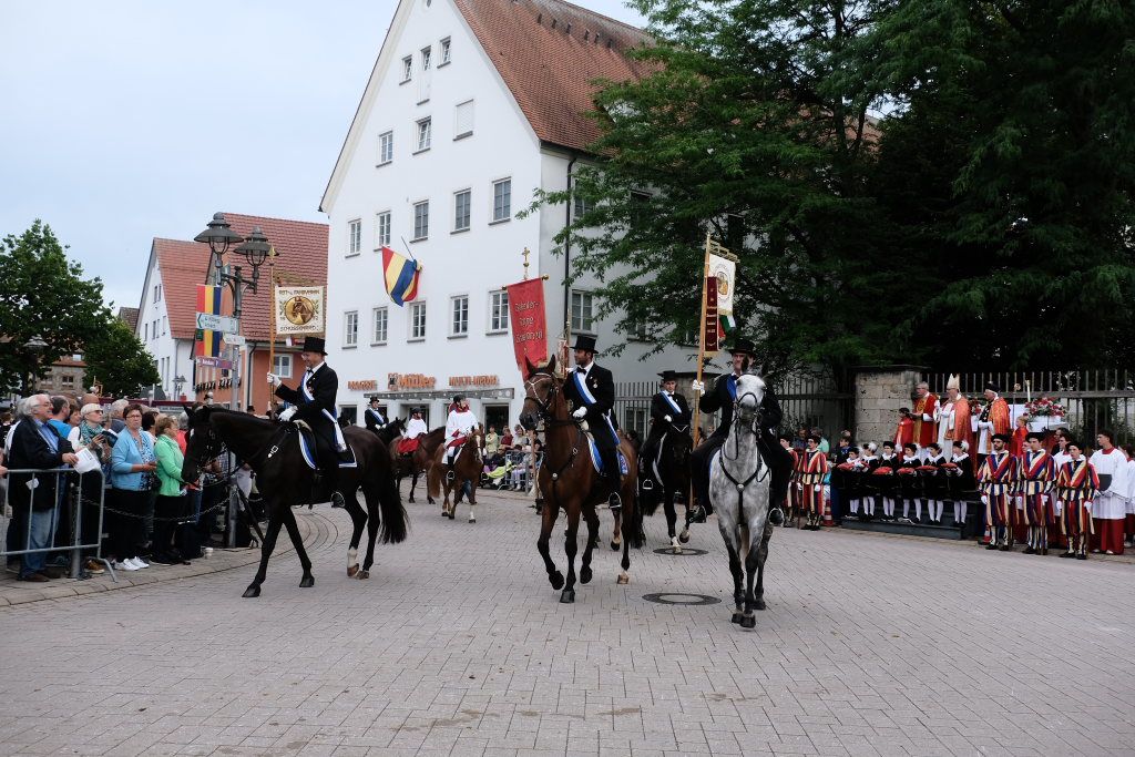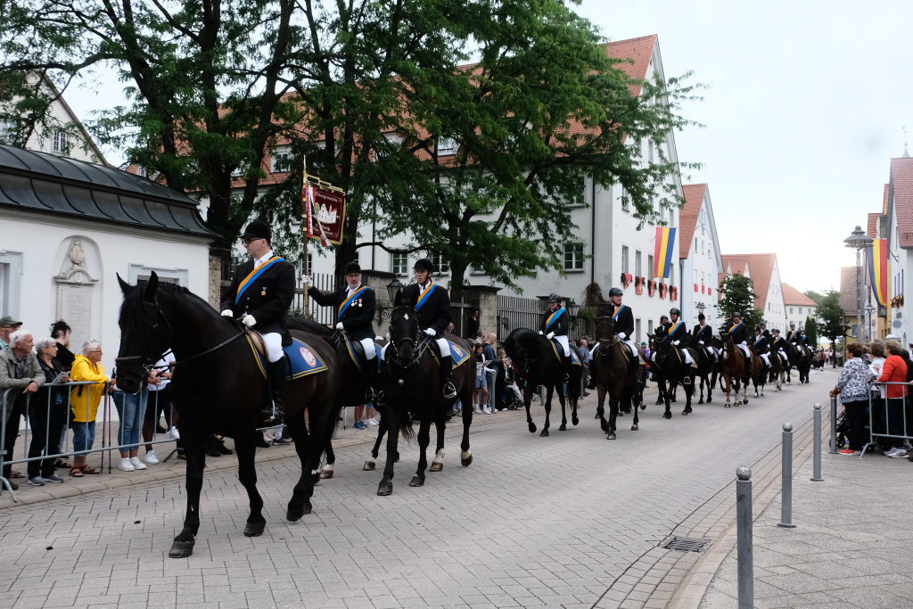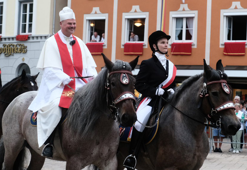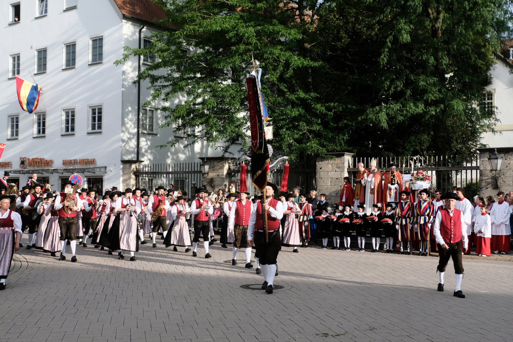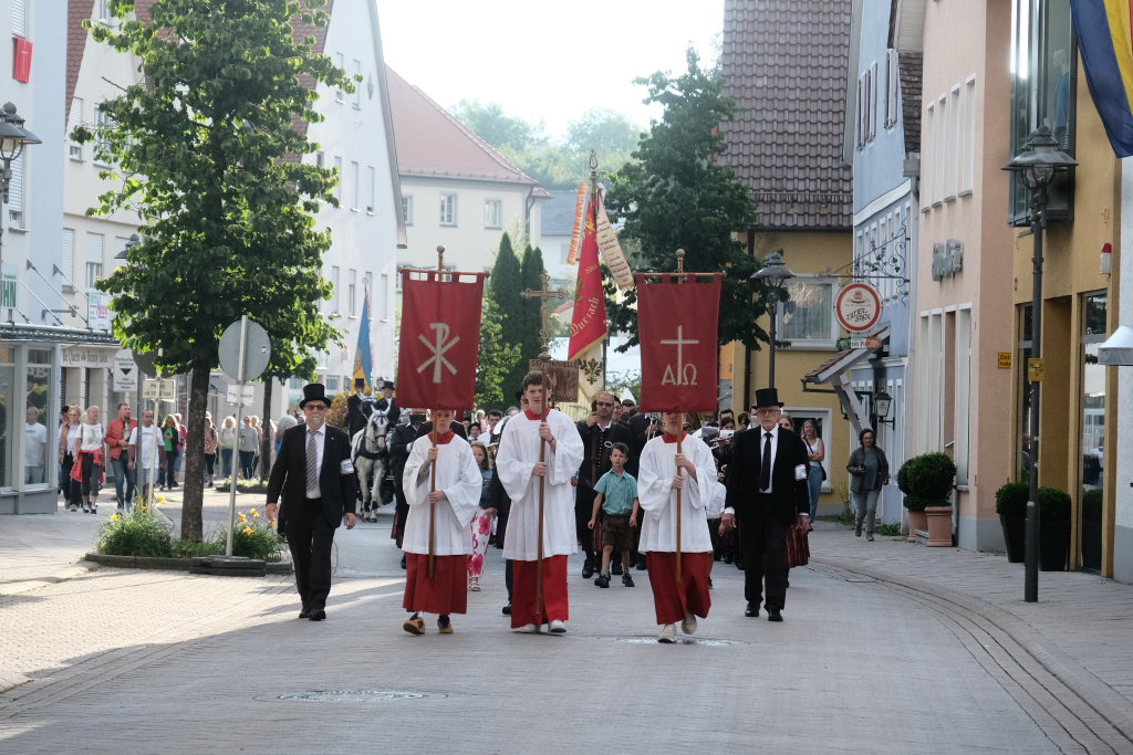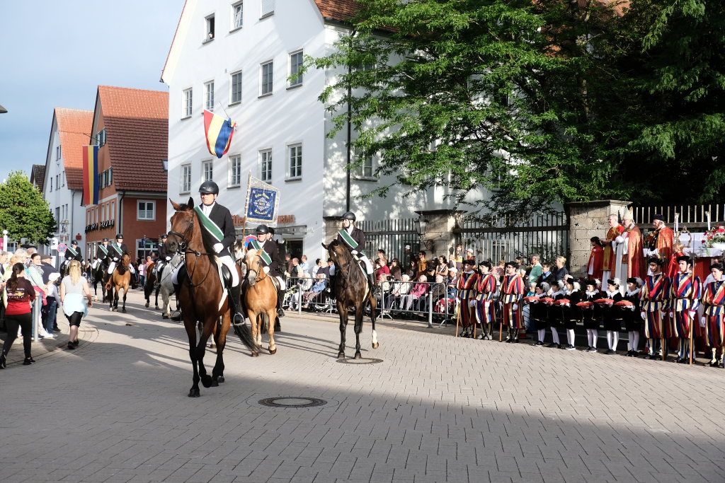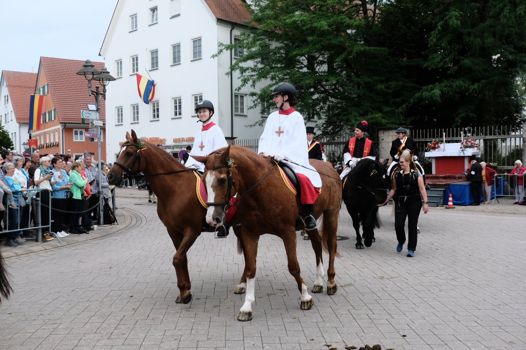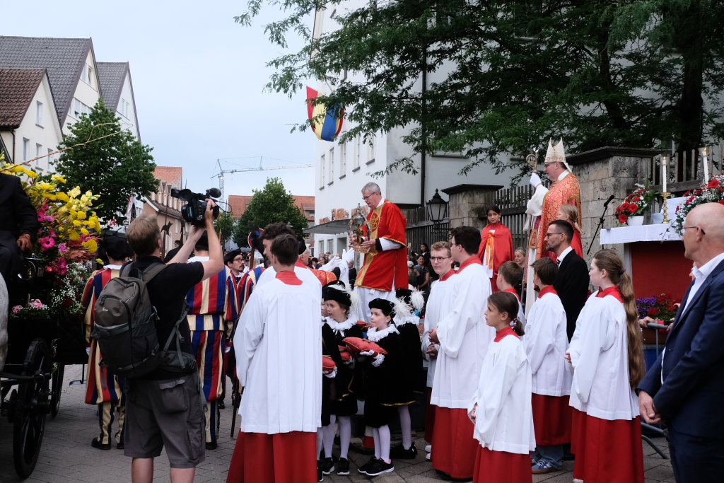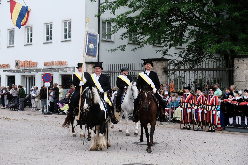 Nachdem der Heiligblutwagen mit Pfarrer Norbert Wahl wieder das Reliqiar, das prächtige Schaugefäß, übernommen hatte, ging es vorbei an den zahlreichen Gläubigen und Ehrengästen und dem geschmückten Amtshaus durch die Mühltorstraße, wo Gläubige noch viele Meter weit den Prozessionsweg säumten, ehe der vierspännige Landauer beim Wohnheim St. Hedwig in Richtung Achberg und der Fluren abbog.