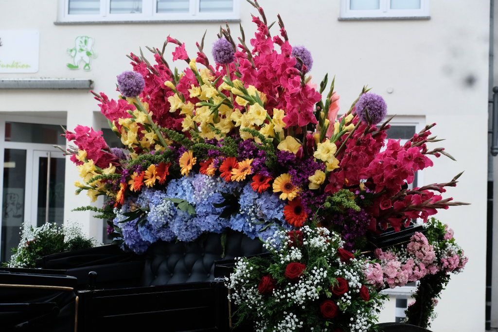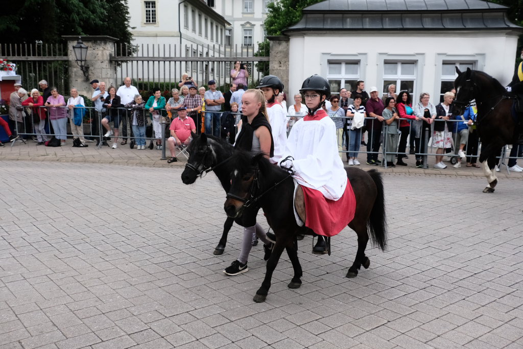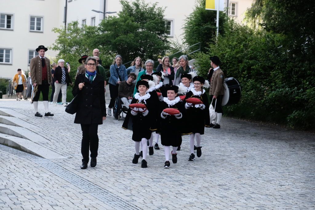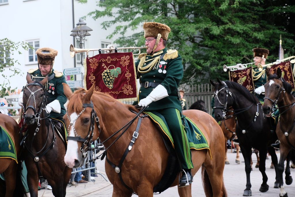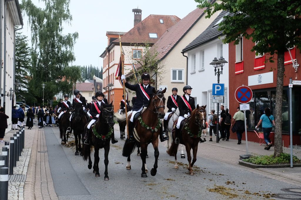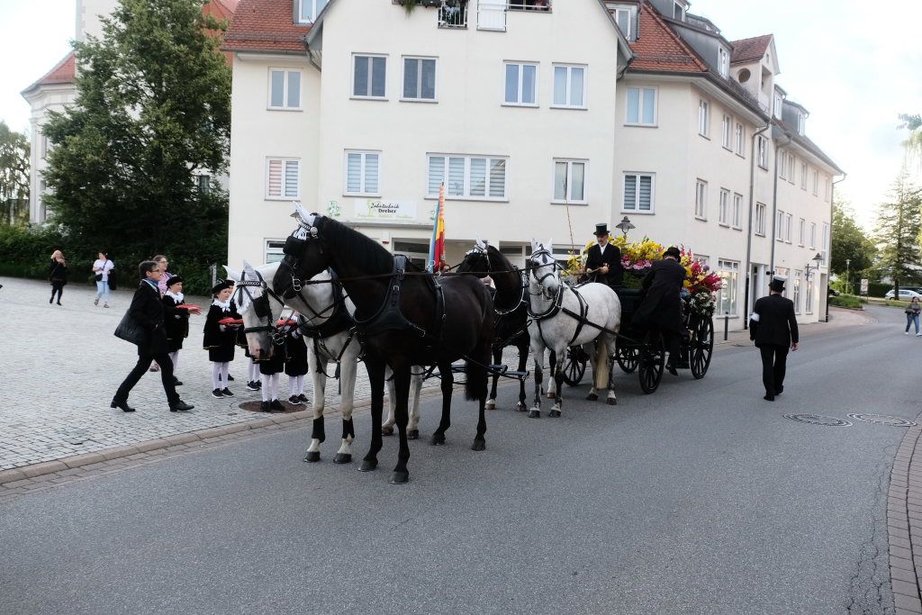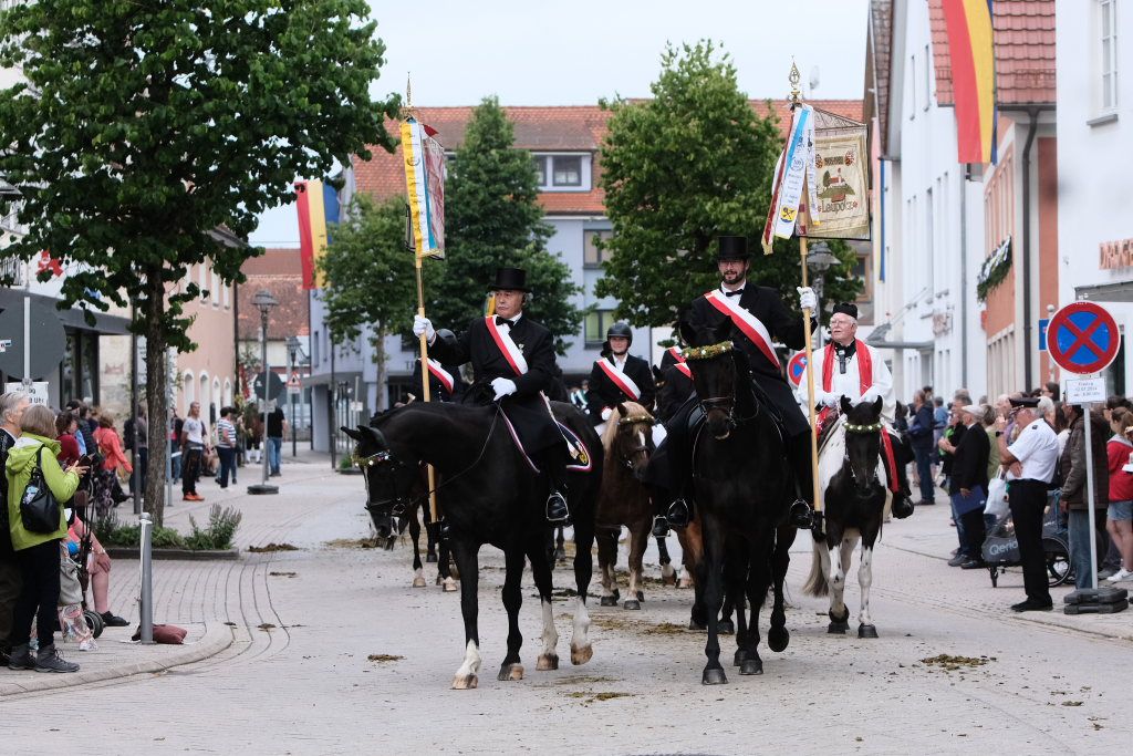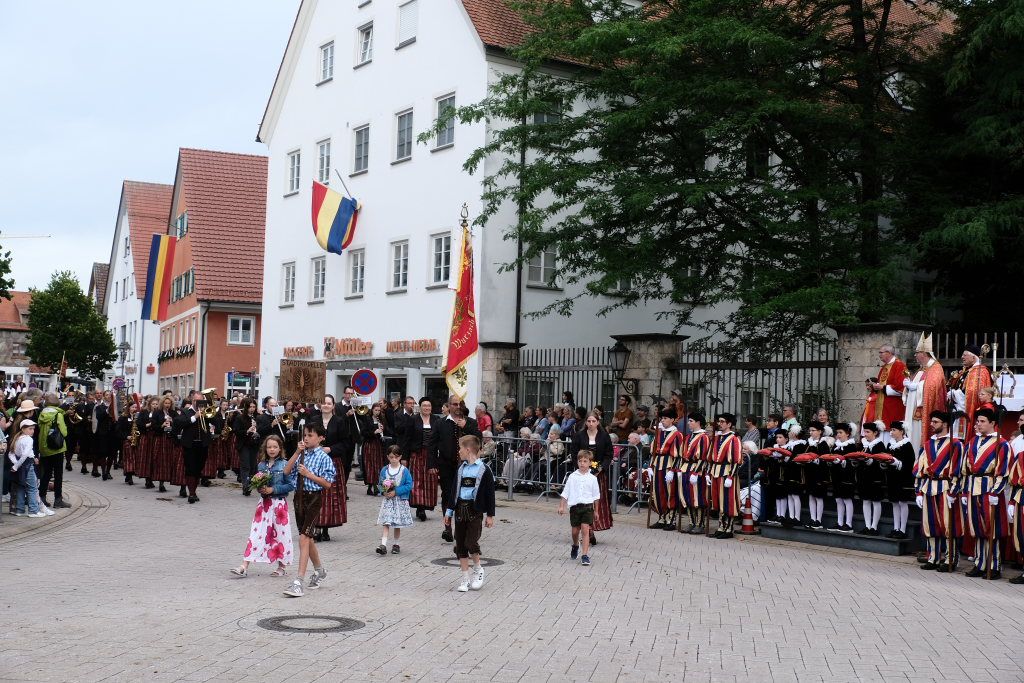 Nachdem der Heiligblutwagen mit Pfarrer Norbert Wahl wieder das Reliqiar, das prächtige Schaugefäß, übernommen hatte, ging es vorbei an den zahlreichen Gläubigen und Ehrengästen und dem geschmückten Amtshaus durch die Mühltorstraße, wo Gläubige noch viele Meter weit den Prozessionsweg säumten, ehe der vierspännige Landauer beim Wohnheim St. Hedwig in Richtung Achberg und der Fluren abbog.