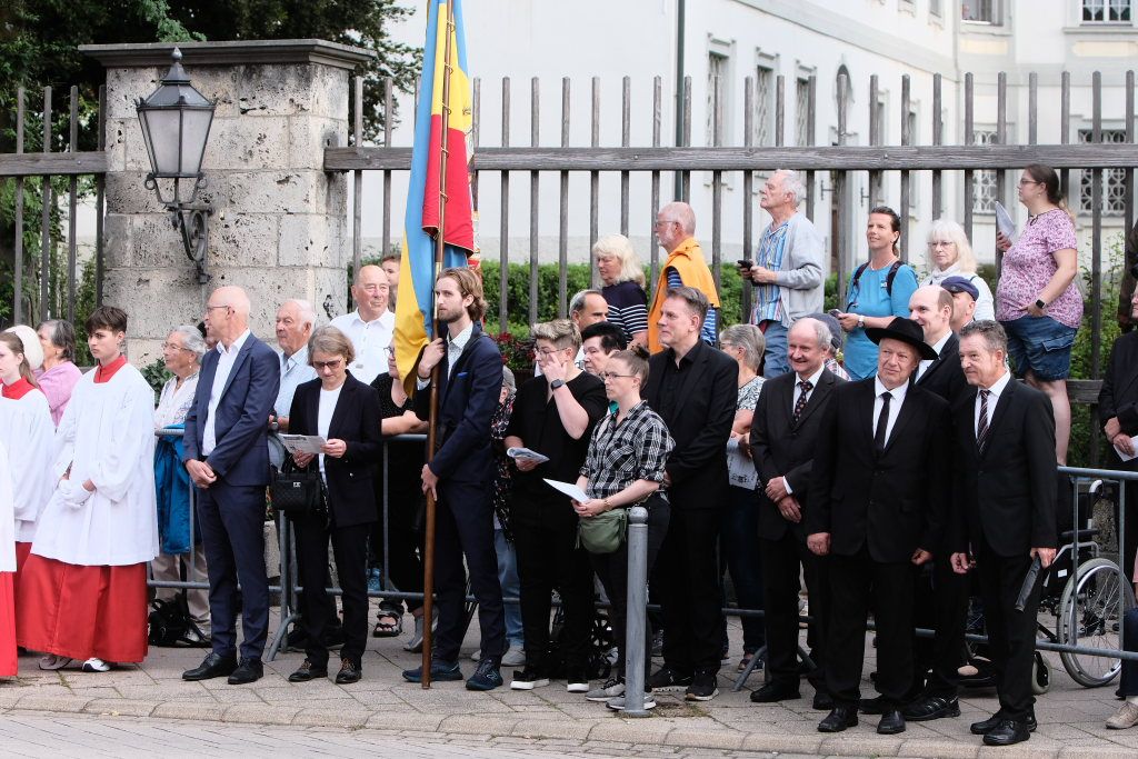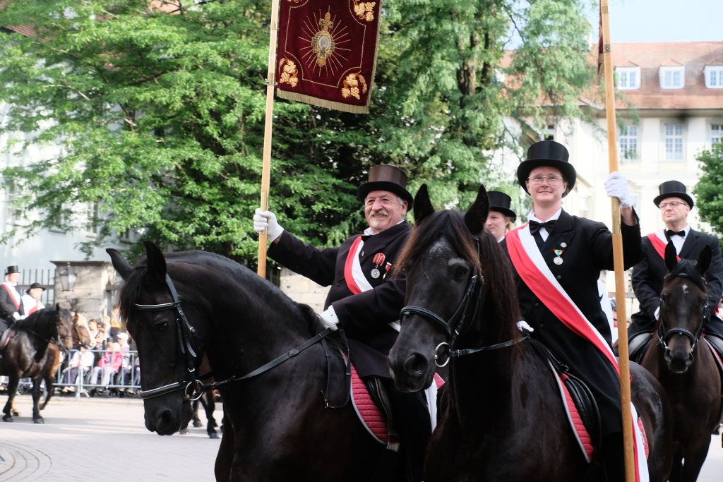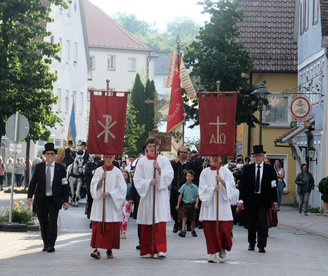 Mit Kreuz und Fahnen und Festordnern: die Spitze des Prozessionszuges.