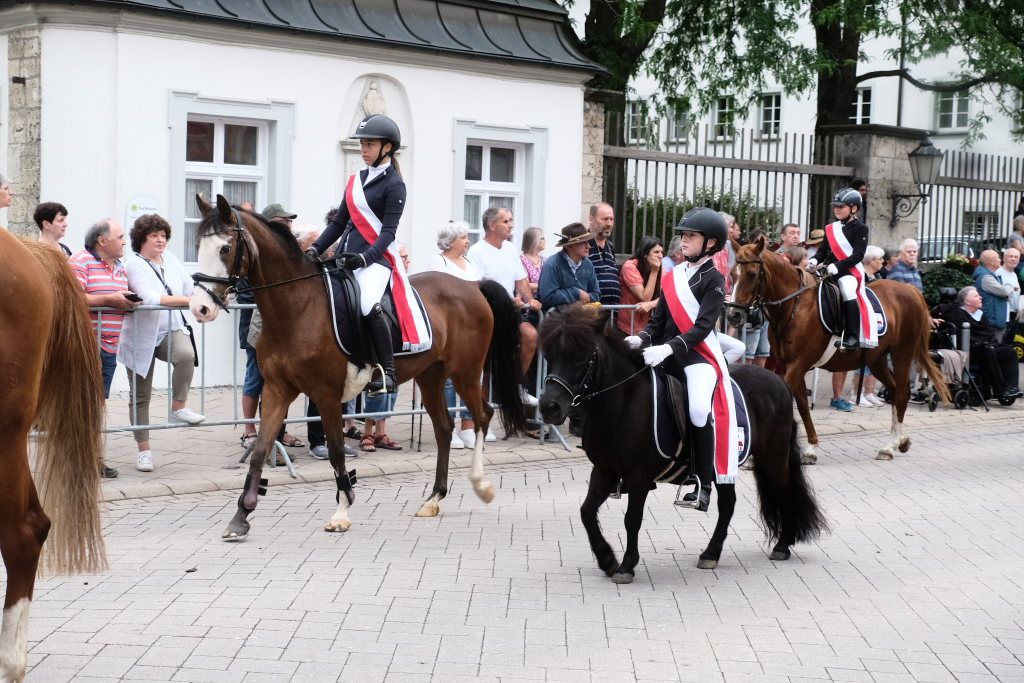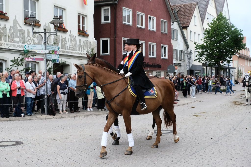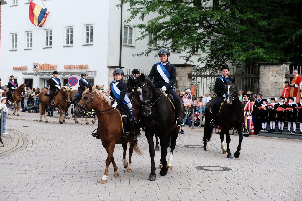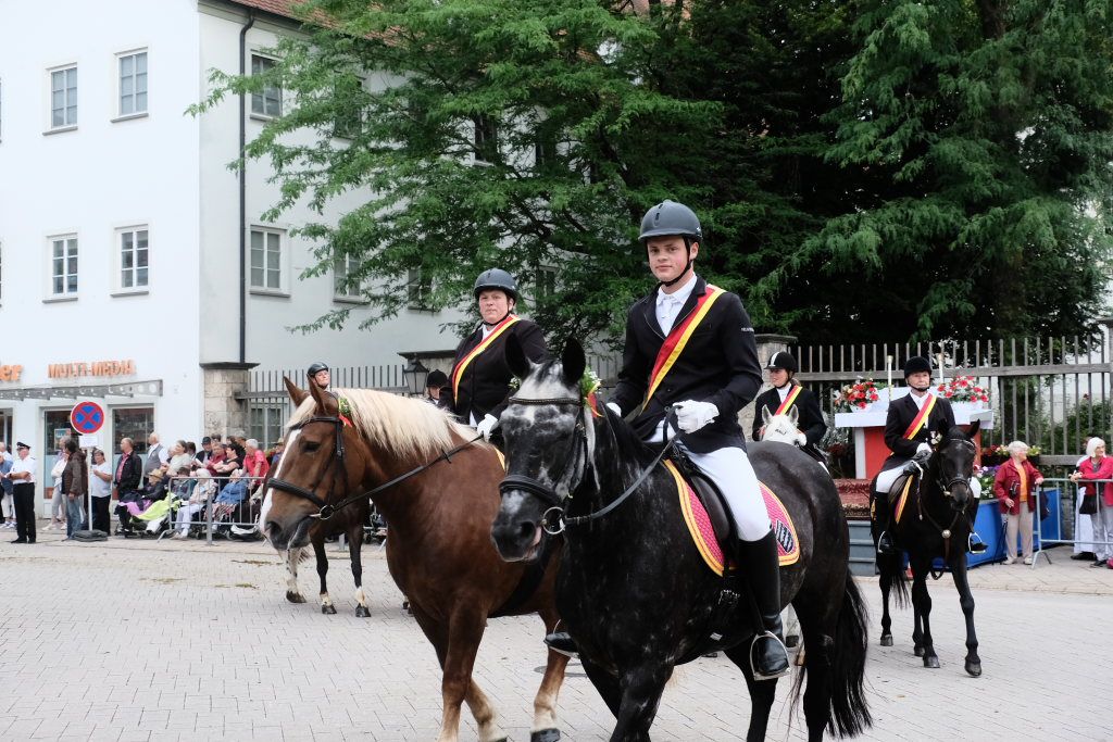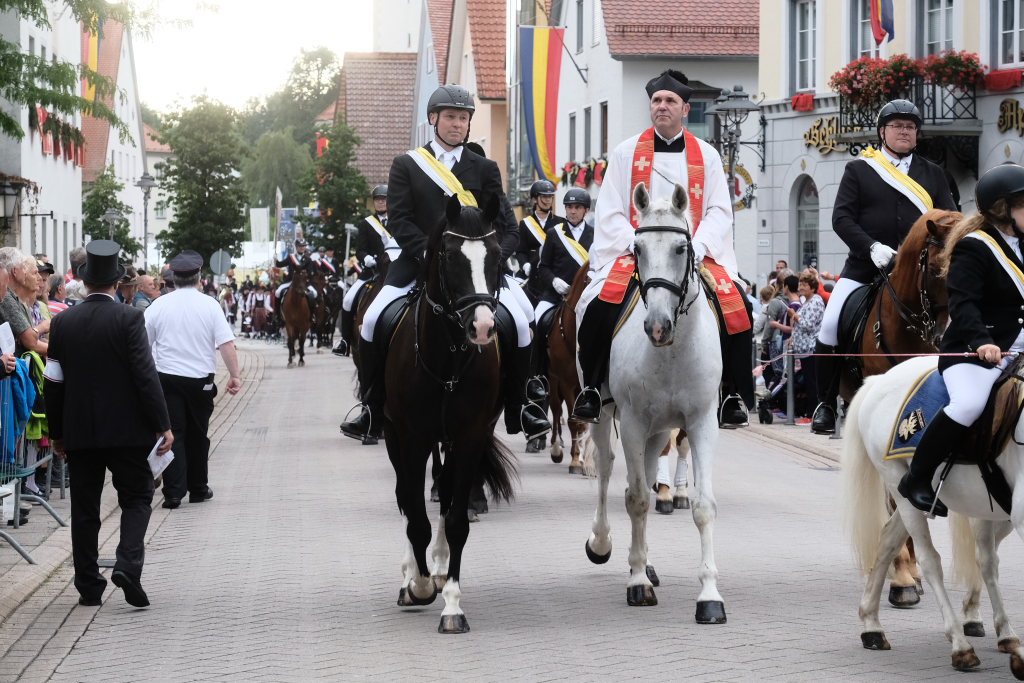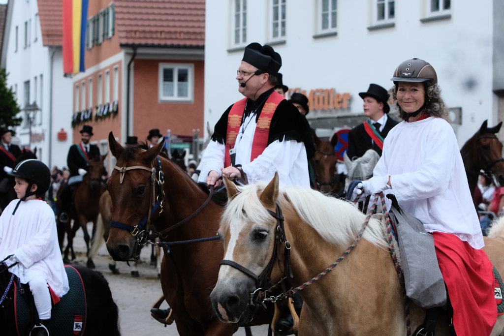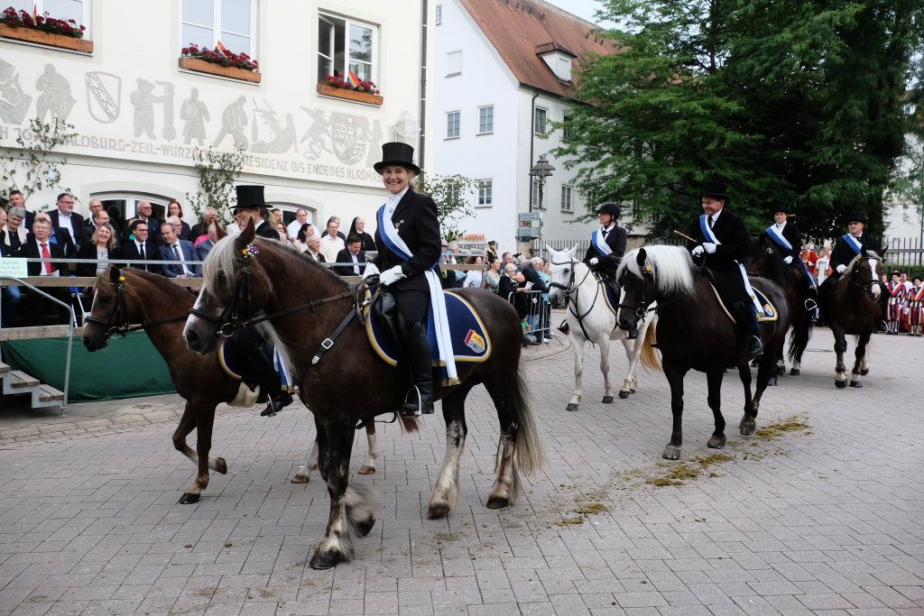 Reiterin der Immenrieder Gruppe. Im Hintergrund wendet sich der Landtagsabgeordnete Raimund Haser, wohnhaft in Immenried, dem Ehrengast Manuel Hagel zu. Er scheint ihm zu sagen: „Da bin ich auch schon mitgeritten.“