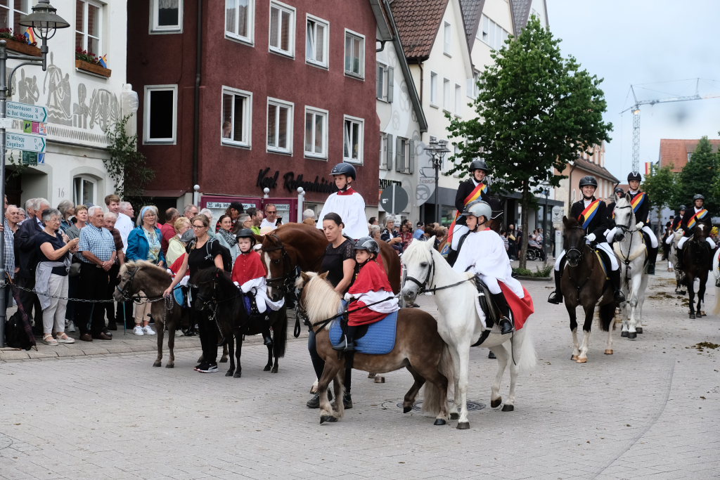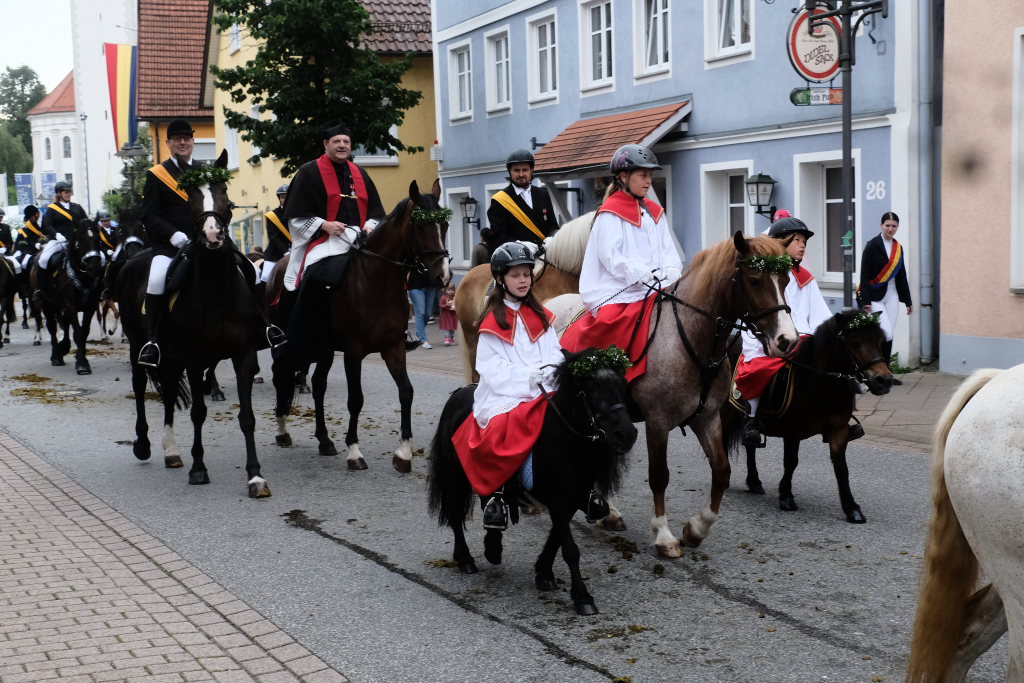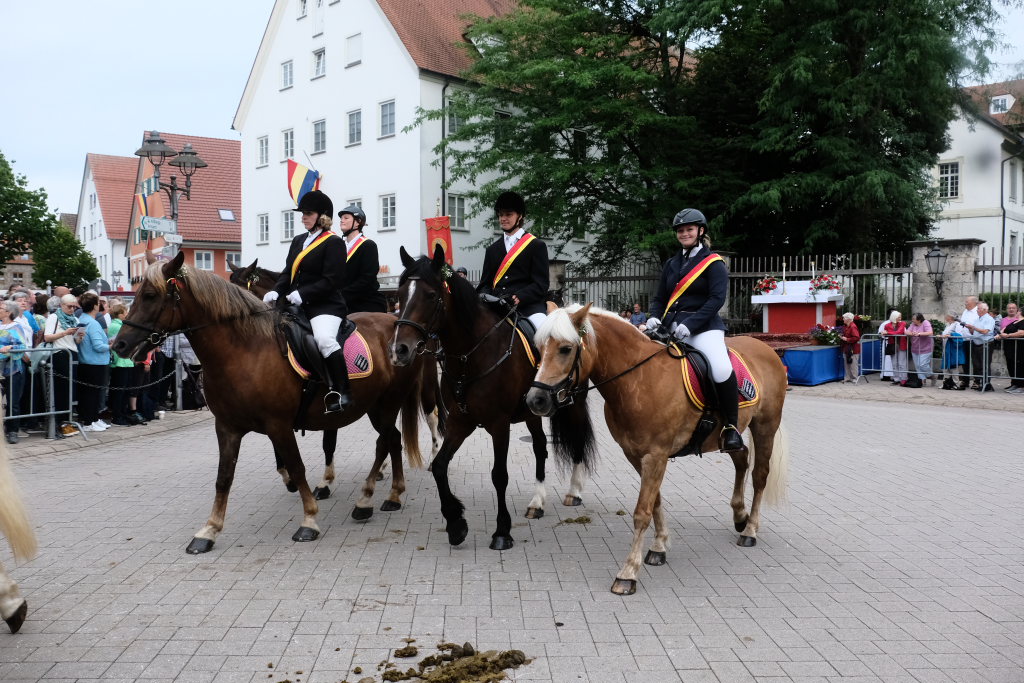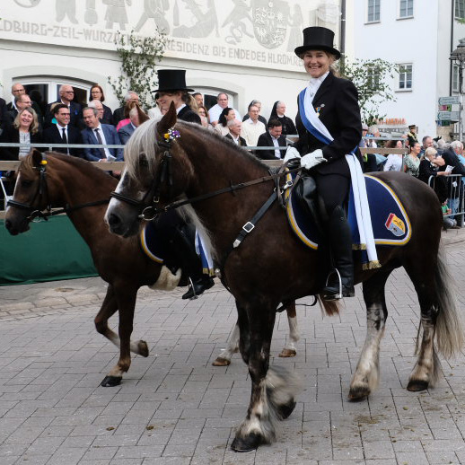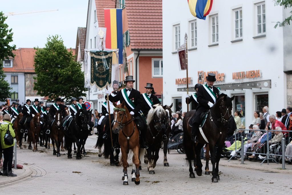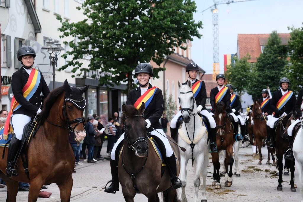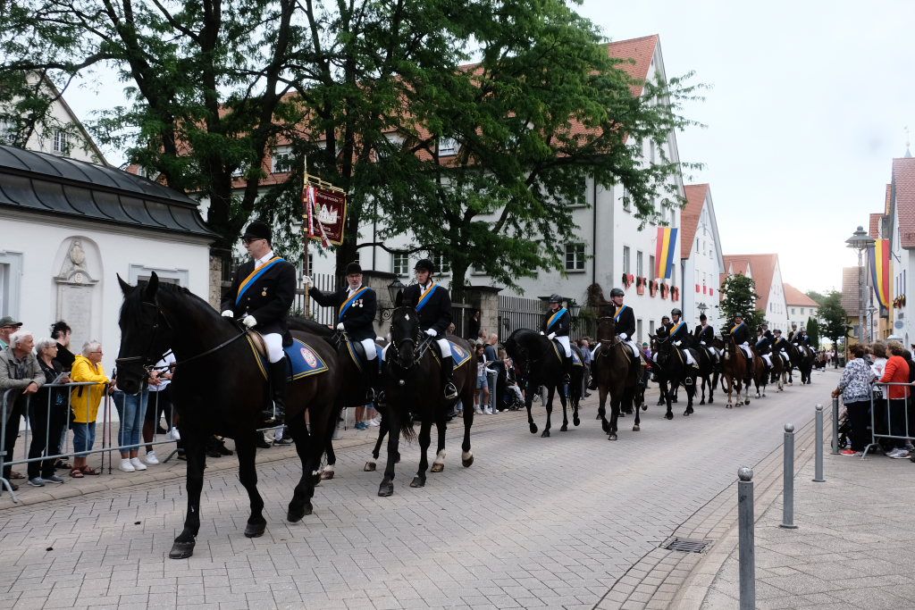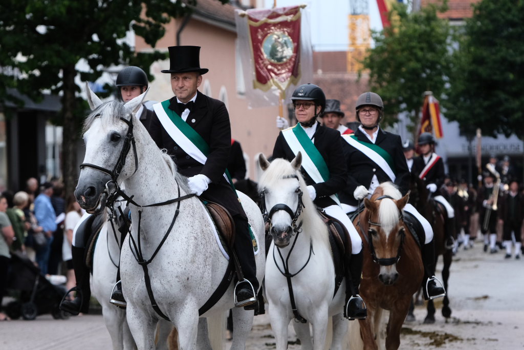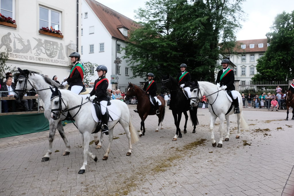 Reiterin der Immenrieder Gruppe. Im Hintergrund wendet sich der Landtagsabgeordnete Raimund Haser, wohnhaft in Immenried, dem Ehrengast Manuel Hagel zu. Er scheint ihm zu sagen: „Da bin ich auch schon mitgeritten.“