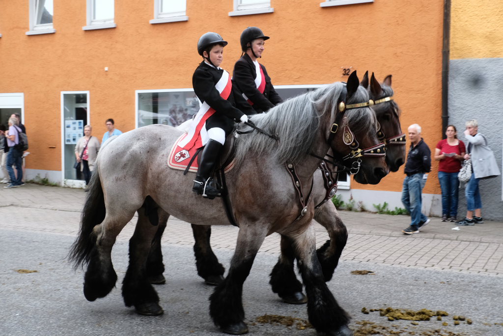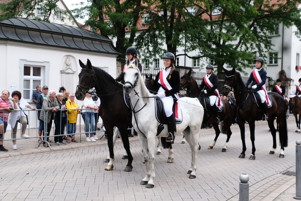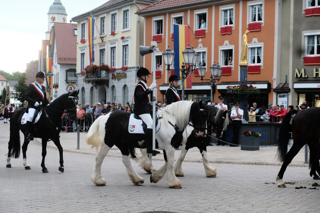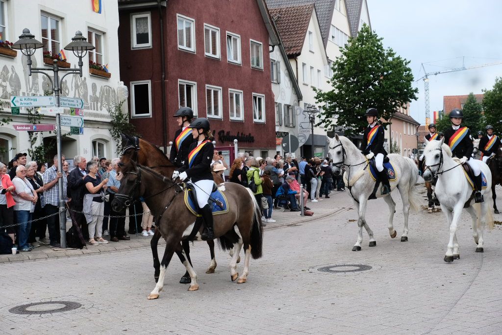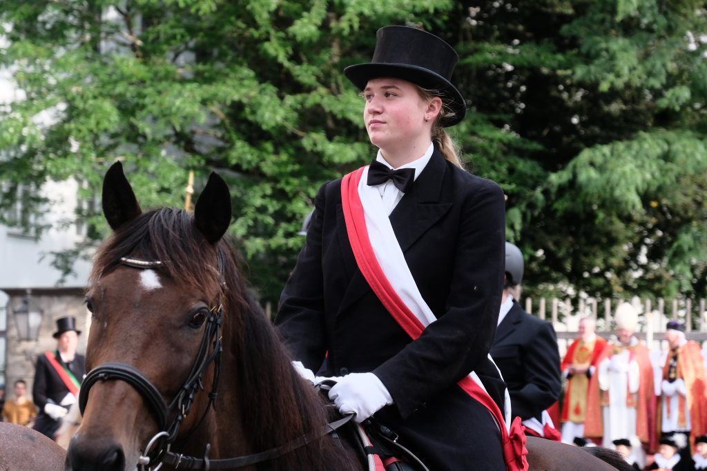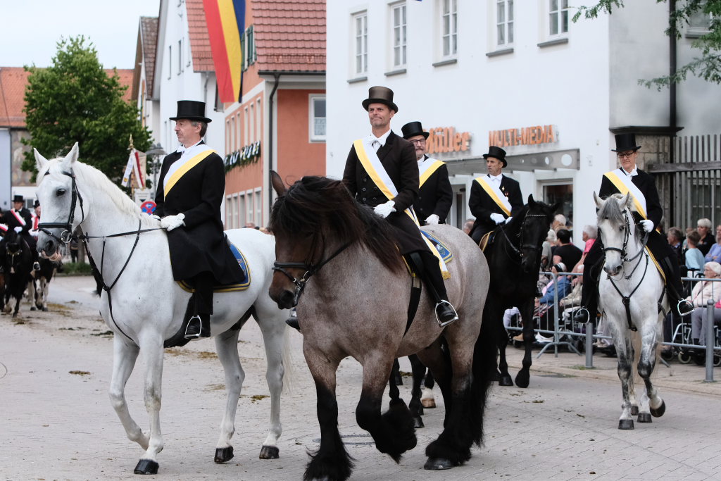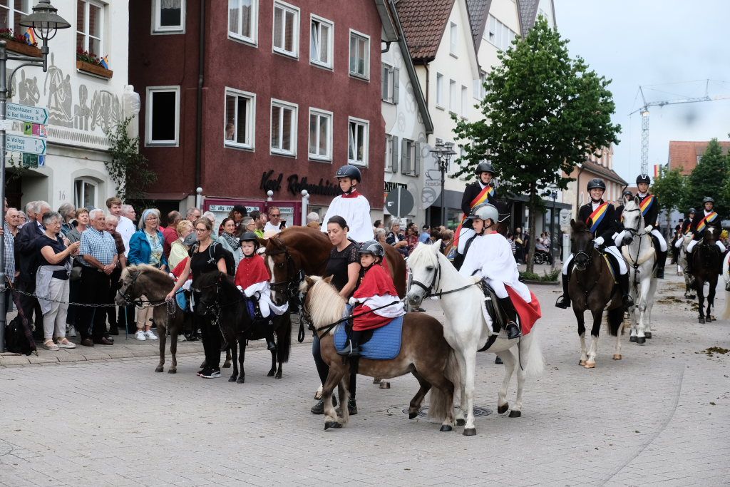 Reiterin der Immenrieder Gruppe. Im Hintergrund wendet sich der Landtagsabgeordnete Raimund Haser, wohnhaft in Immenried, dem Ehrengast Manuel Hagel zu. Er scheint ihm zu sagen: „Da bin ich auch schon mitgeritten.“
