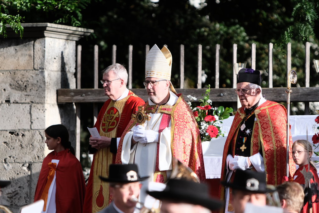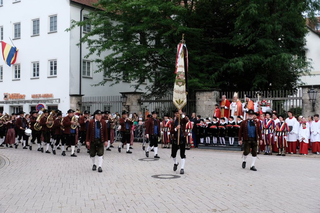 Rund acht Kilometer lang ist die Gesamtstrecke, der nächste Stopp nach dem Halt am Schloss war beim Josenhof; einen weiteren Stopp gab es dann beim Altar in Truschwende. Beim Hierlemann-Hof in Reinstein war der vierte Altar aufgebaut. Am „Pappelkreuz“ wurden die Reiter für die vielen beim Gottesberg wartenden Gläubigen wieder sichtbar; ein beeindruckendes Bild, wie die Prozession sich die kurvige Straße herabschlängelte. Musikalisch begleitet wurden die jeweiligen Lesungen von der Musikkapelle Unterschwarzach, die mit einem Bus von einem Altar zum nächsten gefahren wurde.