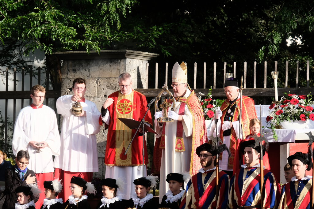 Pater Friedrich übergibt das Reliquiar nach der Segnung am Schloss-Altar an den im blumengeschmückte Landauer sitzenden Pfarrer Wahl. Das Fernsehen war dabei.