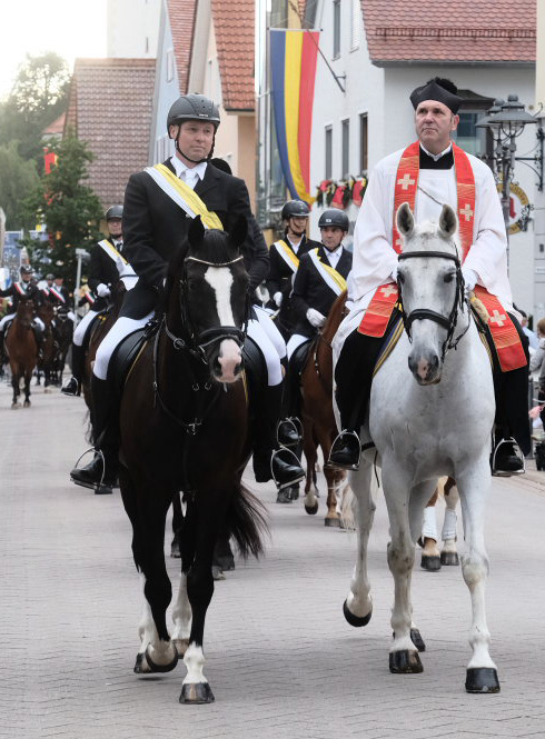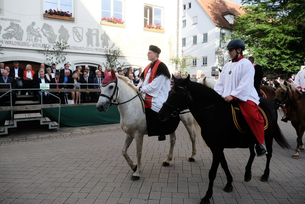 Bad Wurzach – „Petrus muss ein Wurzacher sein!“ Das sagte Abt Vinzenz Wohlwend beim Pontifikalamt am Blutfreitag in Bad Wurzach, das um 10.30 Uhr nach der Reiterprozession gefeiert wurde. Am Morgen des Blutfreitags hatte es noch getröpfelt und die Wetterprognosen waren schlecht. Doch Prozession, Hochamt und Bergpredigt blieben von Regen verschont. Morgens um 7.00 Uhr hatten sich an die 1000 Reiter aus 65 Blutreitergruppen auf den Weg hinaus in Bad Wurzachs Fluren gemacht. Bad Wurzachs ehemaliger Stadtpfarrer Norbert Wahl, der erst vor kurzem sein Diamantenes Priesterjubliäum feiern konnte, hatte die Ehre, vom Heiligblutwagen aus in den Fluren und in der Stadt den Segen erteilen.