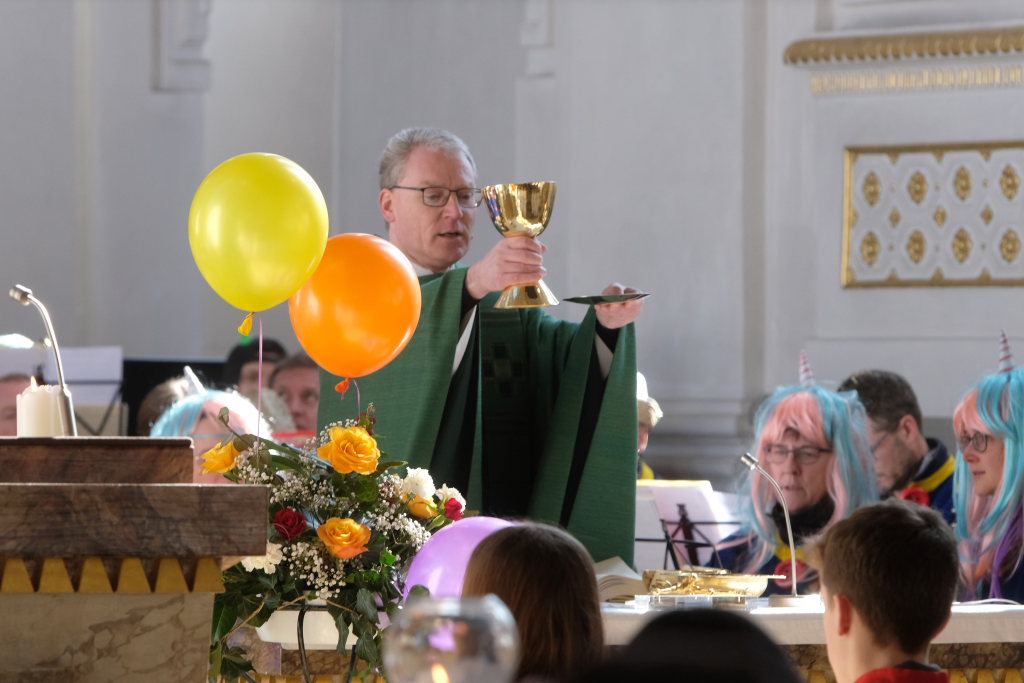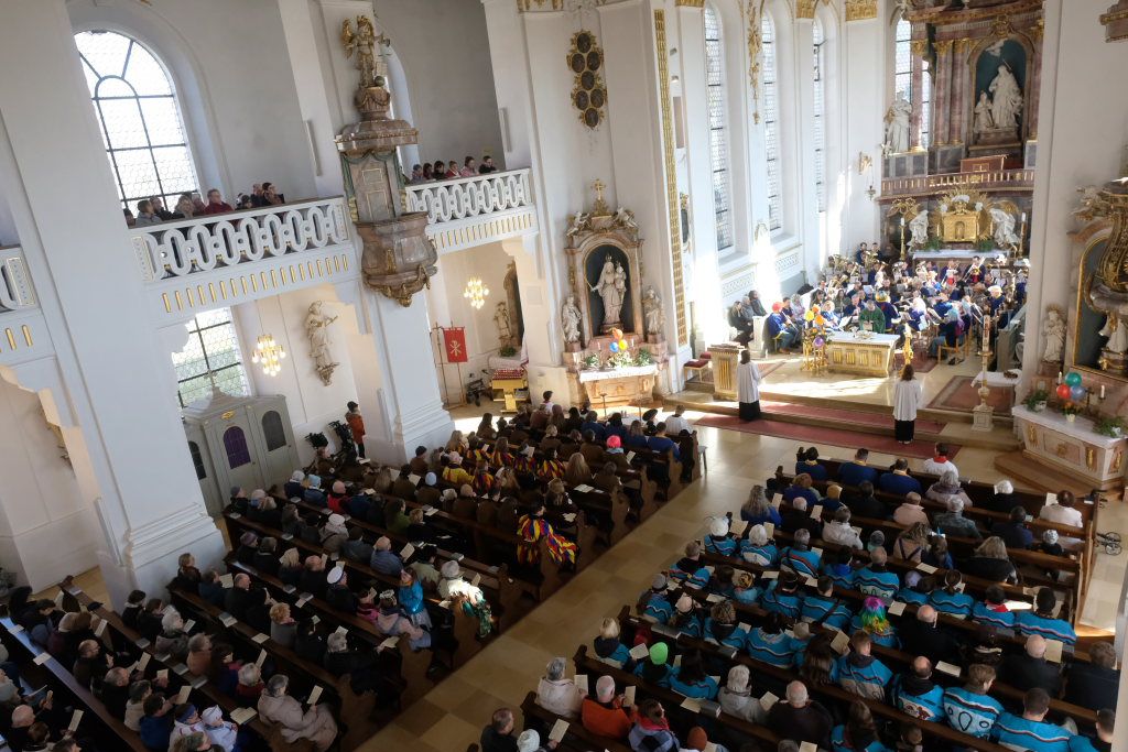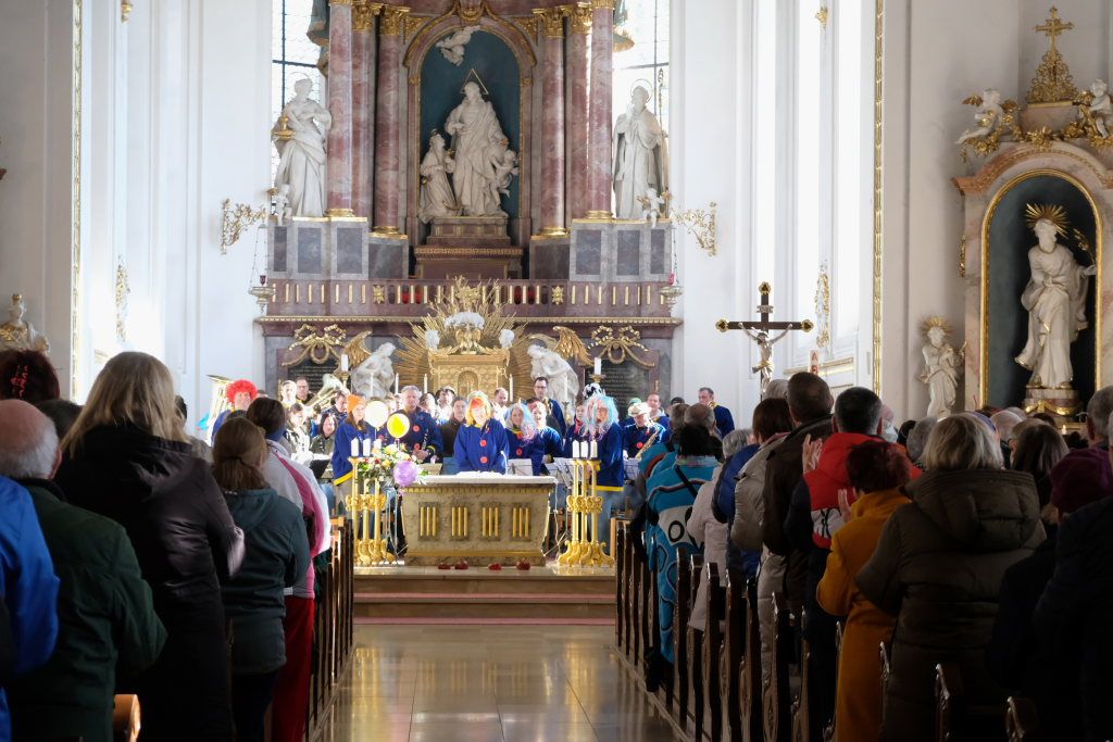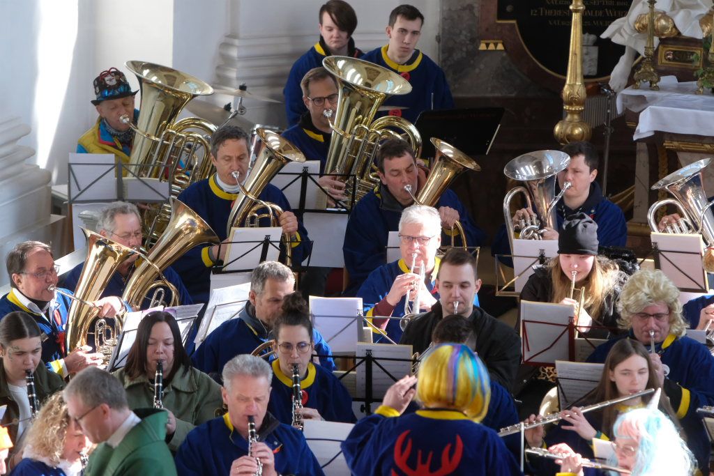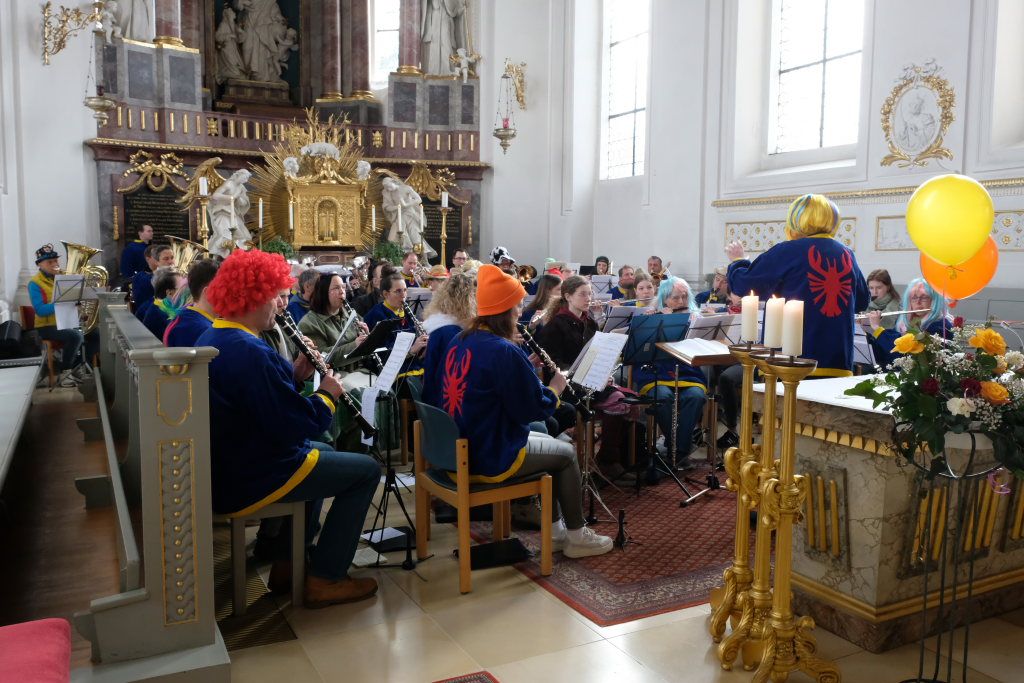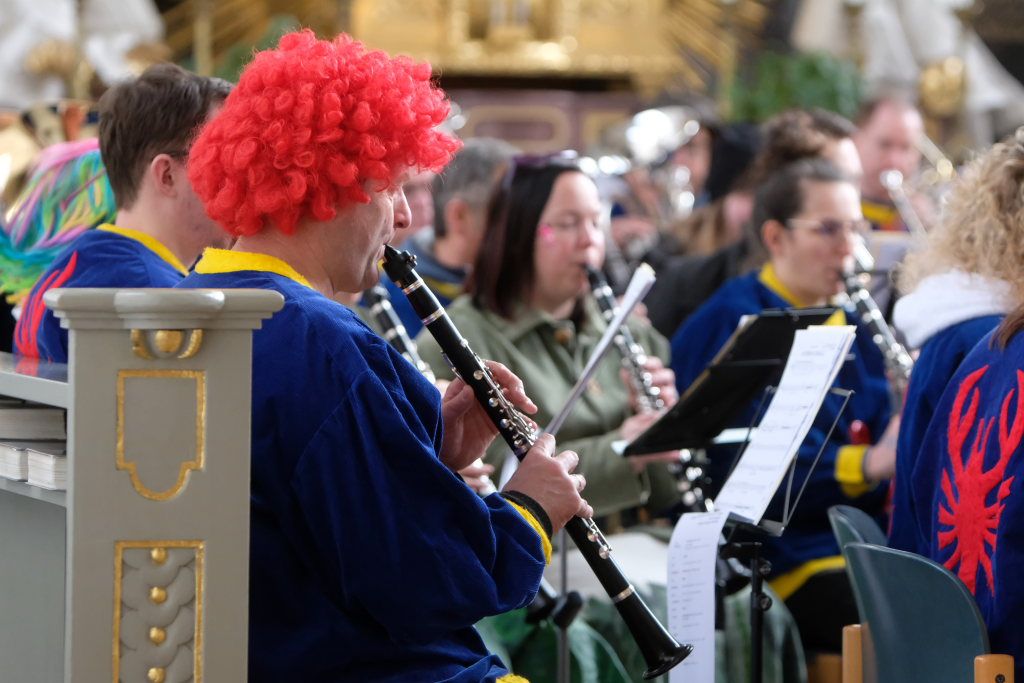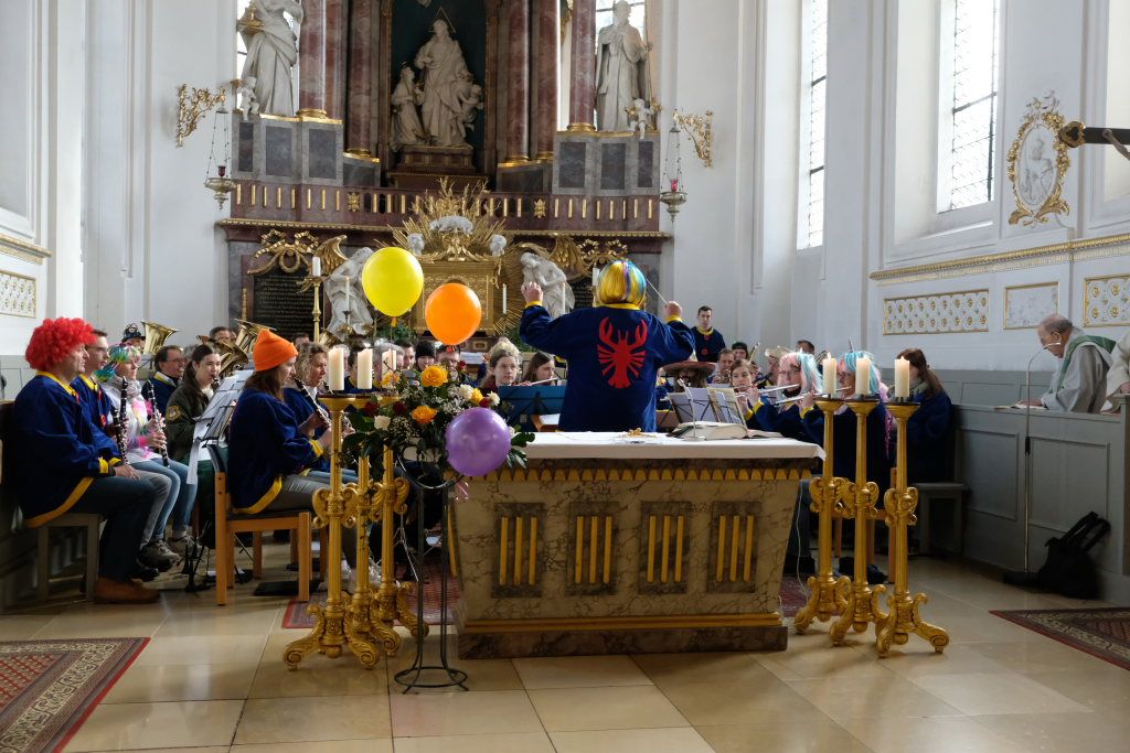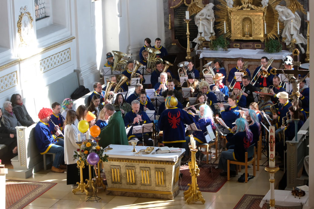 Dass diese Narrenmesse auch zu einem echten Audio-Highlight wurde, dafür sorgte die Stadtkapelle mit ihrer Leiterin Petra Springer. Neben den Liedern aus dem Gotteslob sorgten vor allem ihre Instrumental-Stücke für Kirchenkonzert-Feeling. Als Kommunionbegleitung spielte die Stadtkapelle beispielsweise den berühmten „Second Waltz“ von Dimitri Schostakowitsch. Kein Wunder, dass nach dem Schlusssegen durch Pfarrer Patrick Meschenmoser – zurecht – frenetischer Jubel für sie aufbrandete.