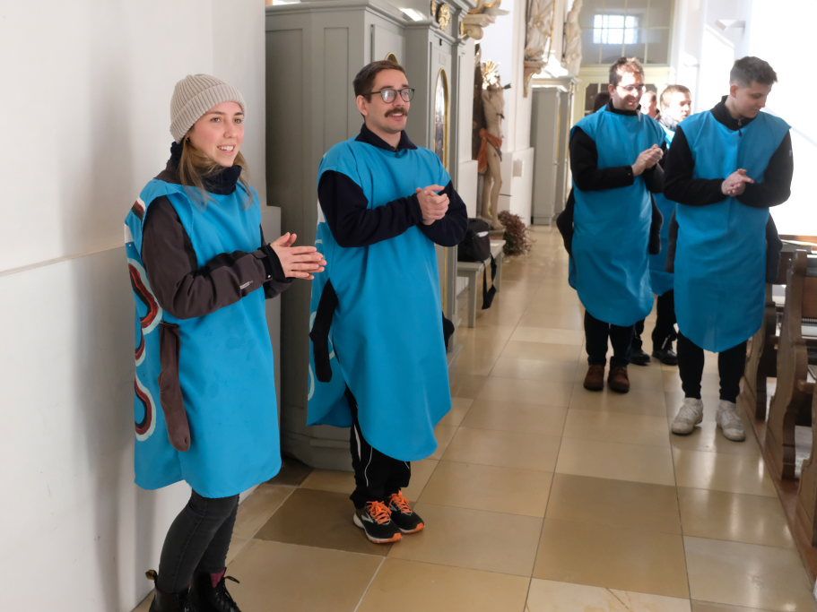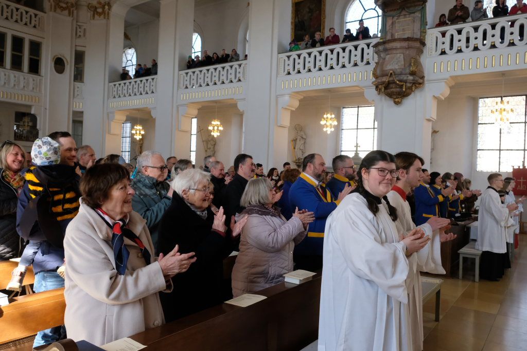 Nach dem Auszug von Ministranten, Pfarrer Meschenmoser und den Hästrägern, rührte sich jedoch keiner: Alle blieben sitzen und warteten darauf, was die Stadtkapelle noch auf Lager hatte. Und tatsächlich bekam das „Publikum“ noch ein kleines Medley mit zwei Robbie Williams-Titeln zu hören.