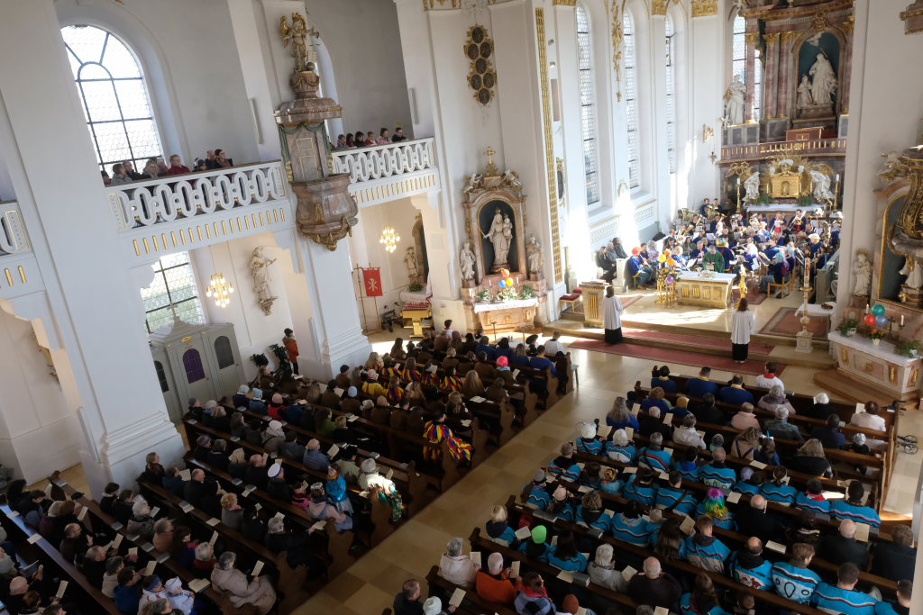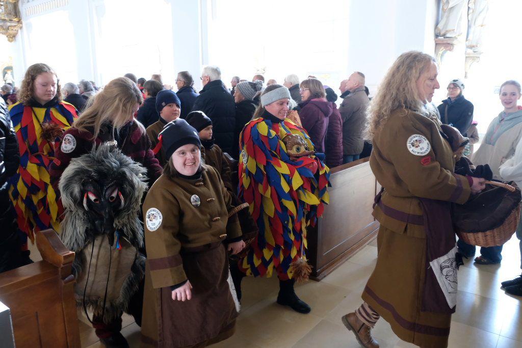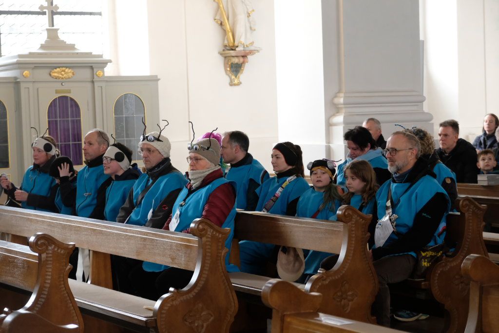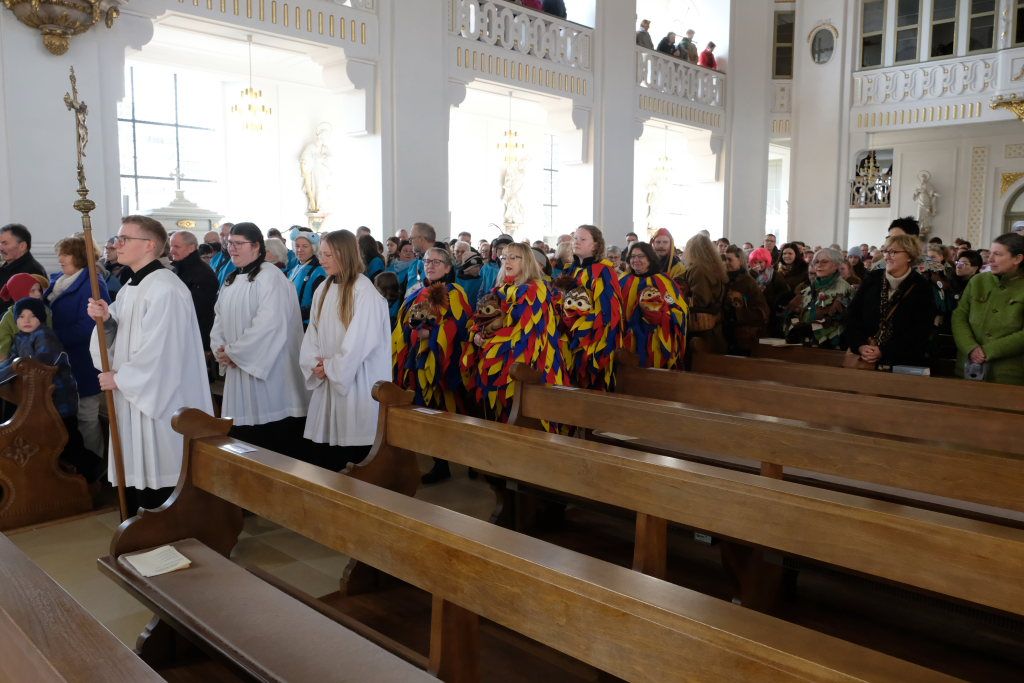Pfarrer Patrick Meschenmoser, der für den am Fuß verletzten Pfarrer Stefan Maier die Liturgie hielt, zog mit Ministranten, Hästrägern und fast mit dem gesamtem Zunftrat hinter der Zunftfahne zu den Klängen des Michael Jackson-Klassikers „Heal the world“ in die St. Verena-Kirche ein. Auch die Freunde des Ungeziefers, die in diesem Jahr als Picasso-Wanzen unterwegs sind, waren mit Kind und Kegel bei dem Gottesdienst vertreten. Dazu gesellten sich Bürgermeisterin Alexandra Scherer und einige Stadt- und Gemeinderäte.