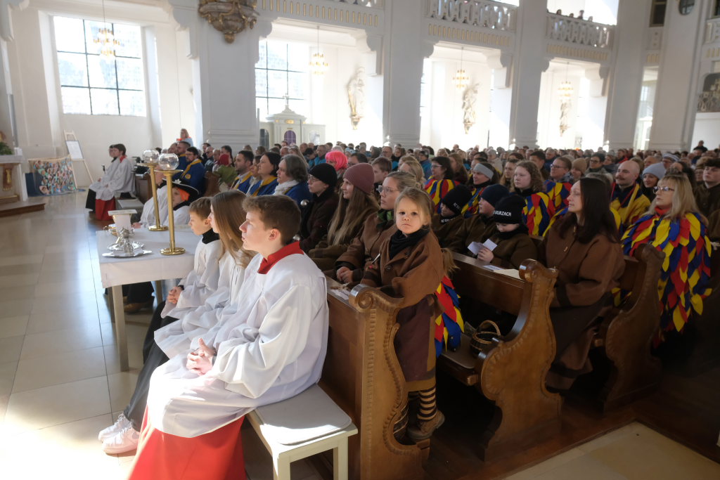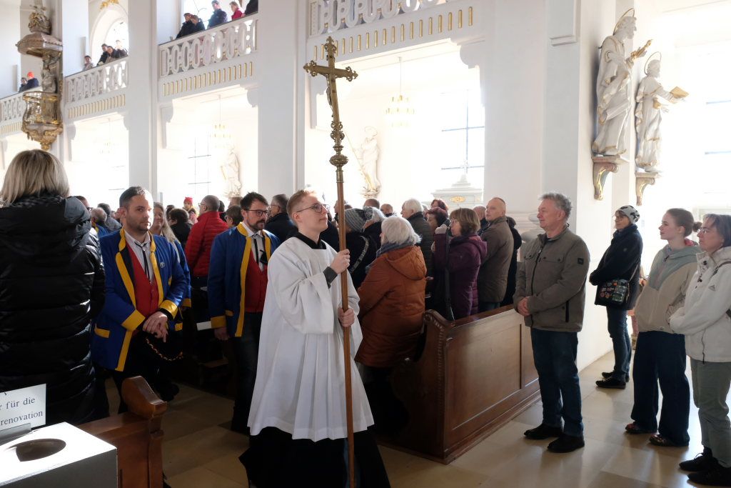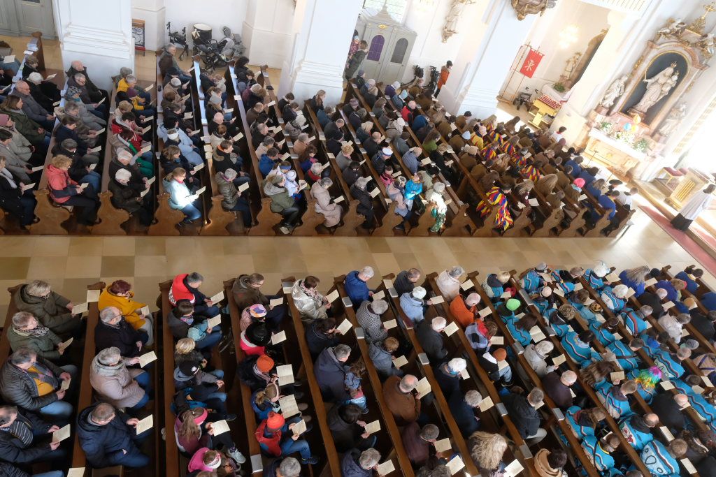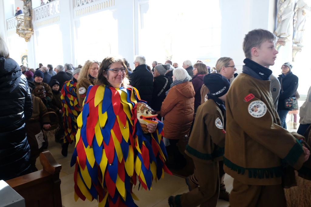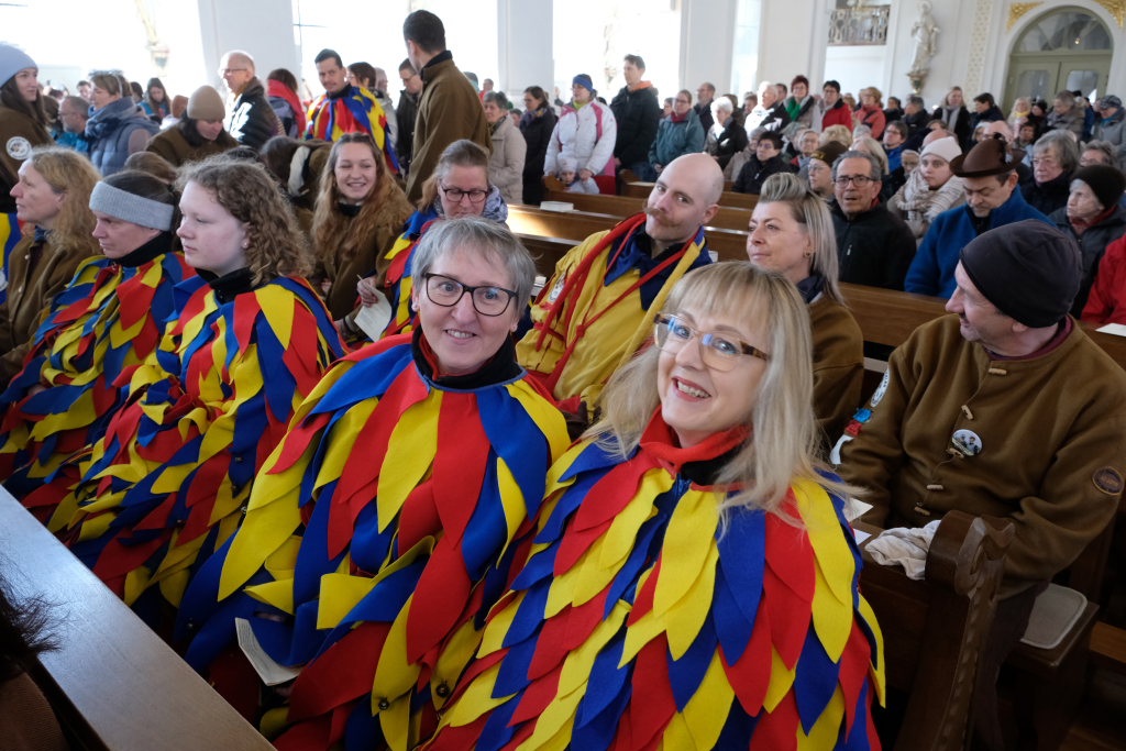 Pfarrer Patrick Meschenmoser, der für den am Fuß verletzten Pfarrer Stefan Maier die Liturgie hielt, zog mit Ministranten, Hästrägern und fast mit dem gesamtem Zunftrat hinter der Zunftfahne zu den Klängen des Michael Jackson-Klassikers „Heal the world“ in die St. Verena-Kirche ein. Auch die Freunde des Ungeziefers, die in diesem Jahr als Picasso-Wanzen unterwegs sind, waren mit Kind und Kegel bei dem Gottesdienst vertreten. Dazu gesellten sich Bürgermeisterin Alexandra Scherer und einige Stadt- und Gemeinderäte.