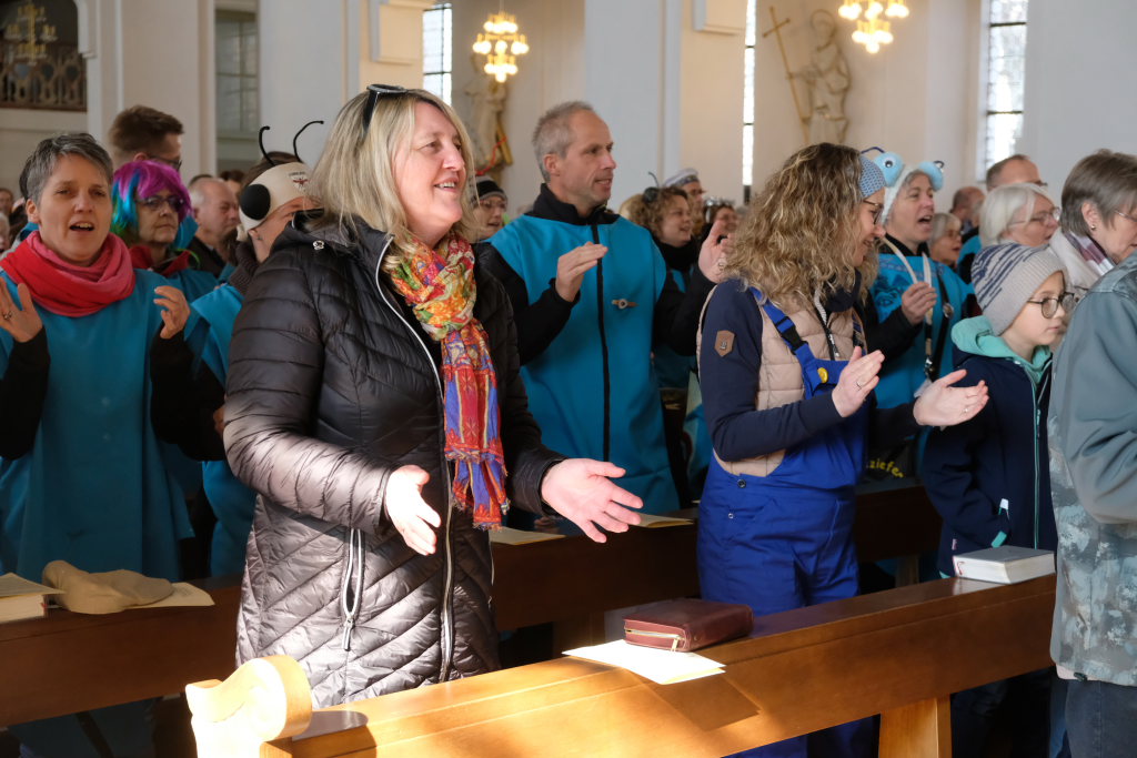 Höhepunkt der Messe aber wurde das Lobpreislied Masithi-Amen, vor dem Petra Springer noch einen kleinen Workshop ansetzte. Danach war dann aber wirklich jeder Gottesdienstbesucher, darunter auch Bürgermeisterin Scherer und die HGV-Spitze, mit vollem Herzen dabei, sang und tanzte bei den drei Strophen „preisen – danken –loben“ geradezu euphorisch mit.