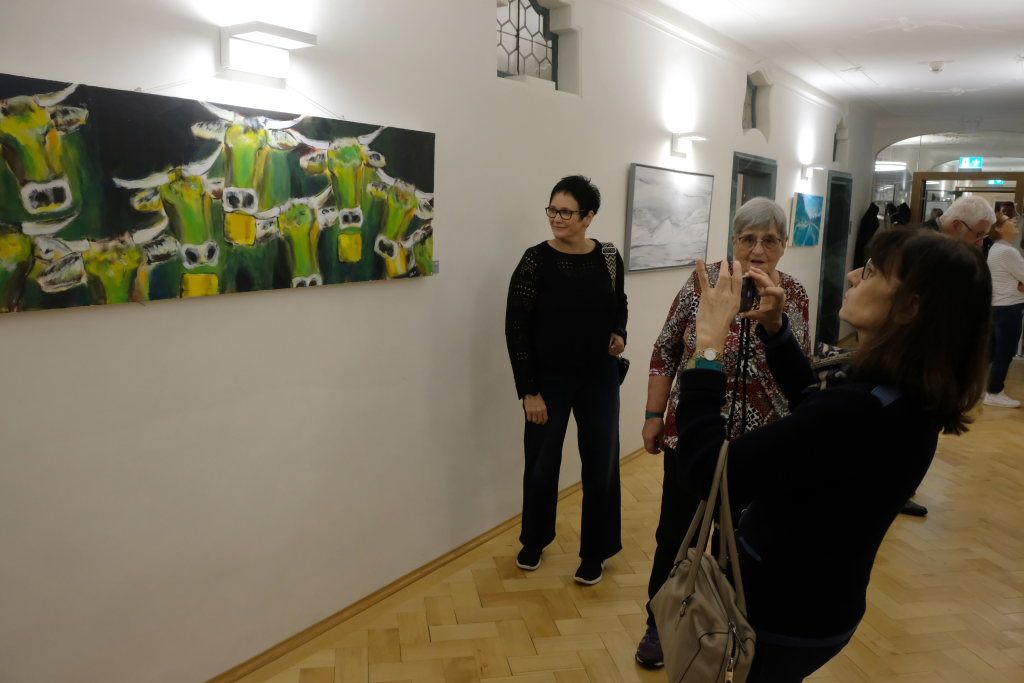 Mit dem Malen angefangen hatte Christoph Reich schon als Bub auf dem elterlichen Hof: Weil Papier knapp war, bemalte er damals die Rückseiten von ausgemusterten Tapetenbüchern. Auf dem Hof gab es jede Menge Malmotive: Pfaue, Kühe, Schweine, Hunde und Katzen. Daraus entwickelten sich dann im Laufe der Jahre viele Motive der jetzt ausgestellten Bilder. Zu seinem Markenzeichen wurden die „Grünen Kühe“, die in Variationen in der Ausstellung auftauchen. Warum diese nicht braun oder gar lila, sondern grün sind, das entziehe sich seiner Kenntnis erzählte Rieker mit einem Augenzwinkern. „Fragt ihn am besten selbst.“