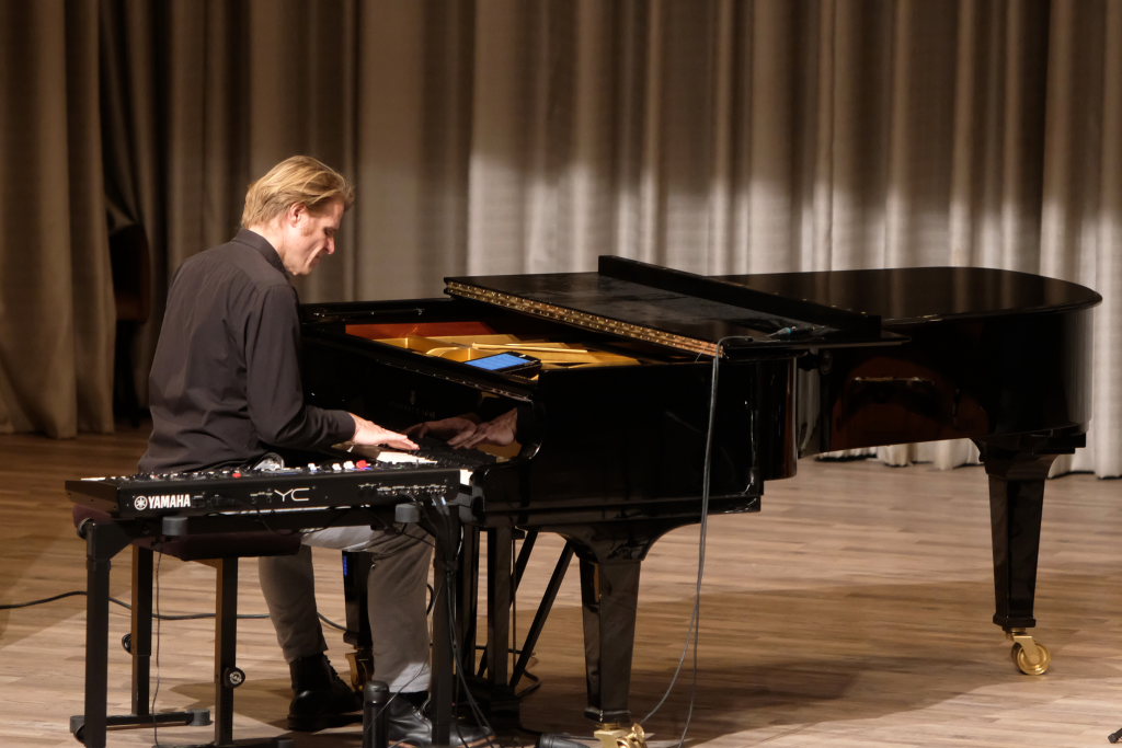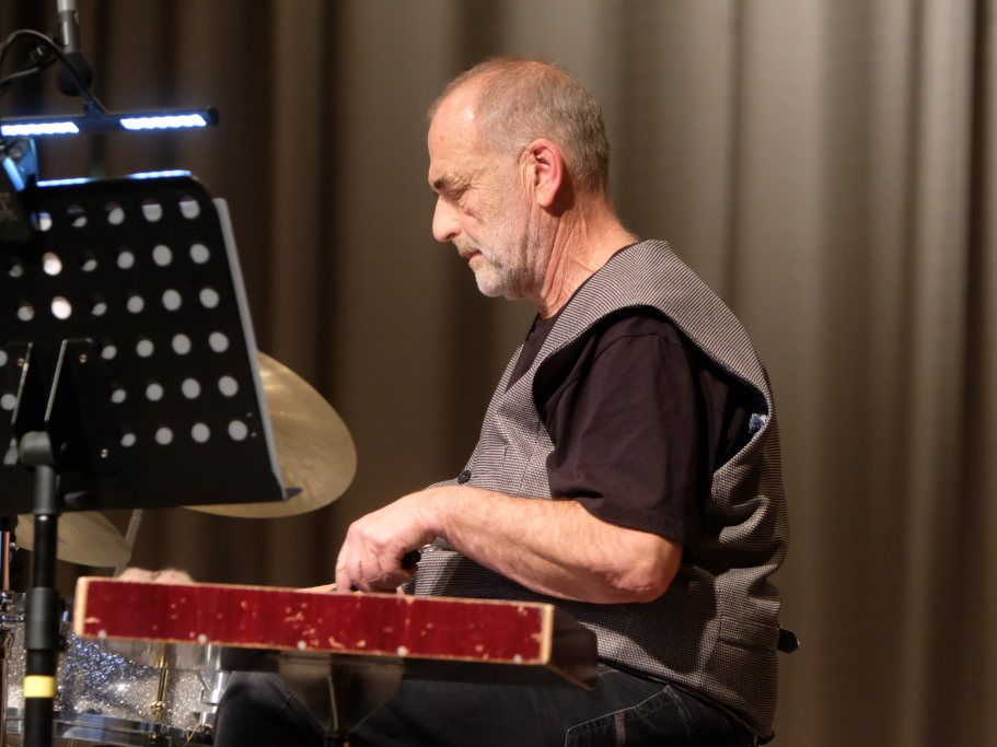 Sein ihm eigener Humor war an diesem besonderen Konzertabend deutlich spürbar, und Michael Porter hatte bei seiner Begrüßung nicht zu viel versprochen: Es wurde ein richtig amüsanter Abend. Was auch an seinen Mitmusikern lag. Da wäre Martin Meixner, der erstmals beim Michael Porter Trio an den Tasteninstrumenten saß. Er definierte die Bedeutung von Multiinstrumentalist neu: Den Flügel spielte er mit links, die Rechte hieb auf die Tasten seiner Miniorgel ein. Gleichzeitig! Zum Zweiten am Kontrabass Andreas Schmid, der garantiert nicht als Slowhand gelten kann, so flink wie seine Hände über die dicken Basssaiten flitzten. Und schließlich Michael Porter, dessen schlagzeugerische Fähigkeiten eh außerhalb jeder Diskussion stehen.