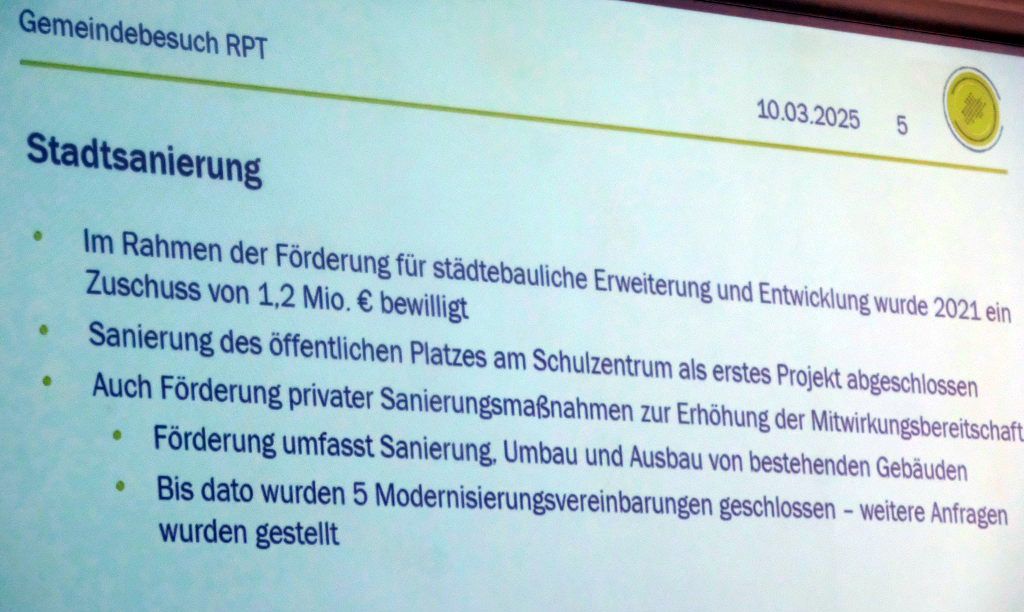 Kämmerer Stefan Kunz erläuterte dem Regierungspräsidenten die Zahlen des aktuellen Haushaltsplanes, der aufgrund des Glasfaserausbaues mit rekordverdächtigen Zahlen aufwartet. Allein in den letzten zehn Jahren, seit er Kämmerer in Bad Wurzach ist, sei das HH-Volumen um 57 % gestiegen. Man habe in guten Jahren Rücklagen gebildet und Schulden abgebaut. Weil in der größten Flächengemeinde des Regierungsbezirkes, was Bad Wurzach ist, viele Infrastruktureinrichtungen wie Hallen, Kindergärten, Grundschulen usw. in fast allen Ortschaften vorhanden sind und unterhalten werden müssen, sei er froh, dass bei Zuweisungen der Flächenfaktor statt wie bisher der Einwohnerfaktor eingeführt worden sei.
