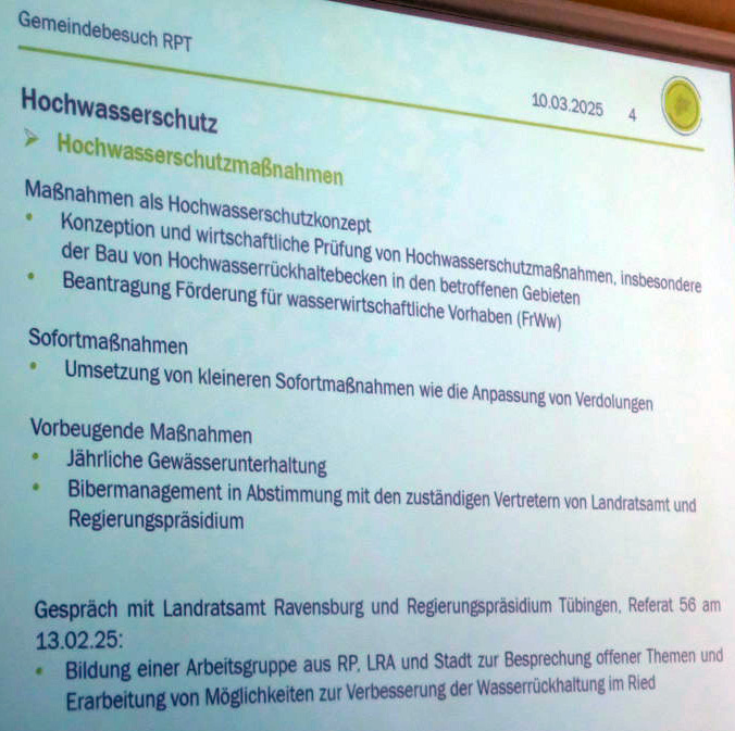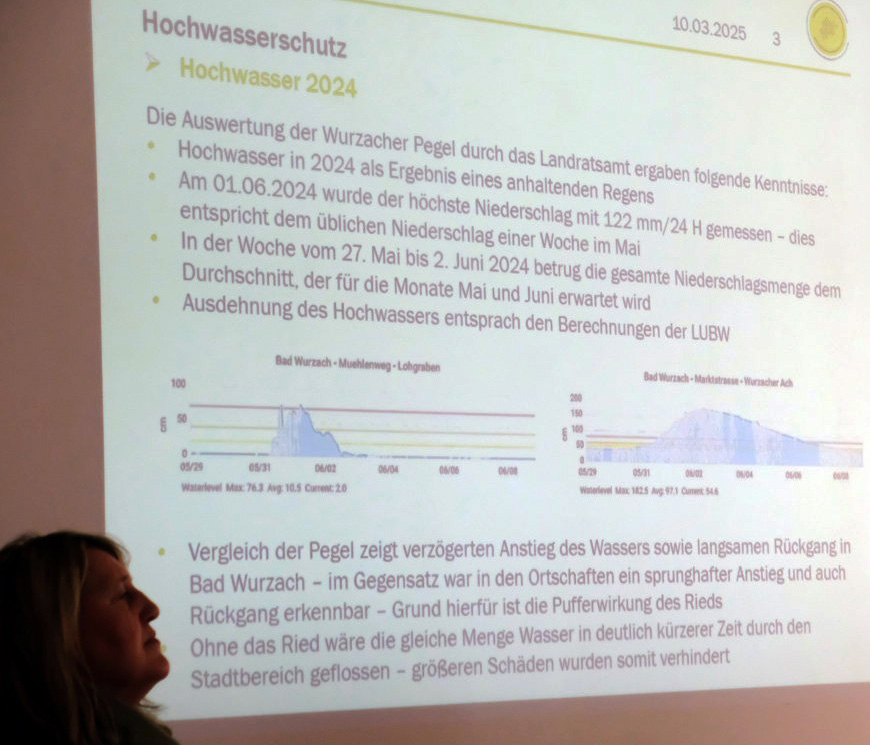 Auch das Thema Hochwasser wurde angesprochen. Stadtbaumeisterin Kathleen Kreutzer (Bild) stellte in einer kleinen Präsentation die Probleme des Hochwassers vom letzten Sommer dar. Dabei zeigte sie auf, dass in den Ortschaften die Wassermassen viel schneller ansteigen, aber auch wieder abnahmen. Anders dagegen in der Stadt: Der Wasserstand stieg auch dank der Saugwirkung des Riedes langsamer an und nahm auch langsamer ab. Ihr Fazit: Dadurch konnten noch viel größere Schäden verhindert werden.