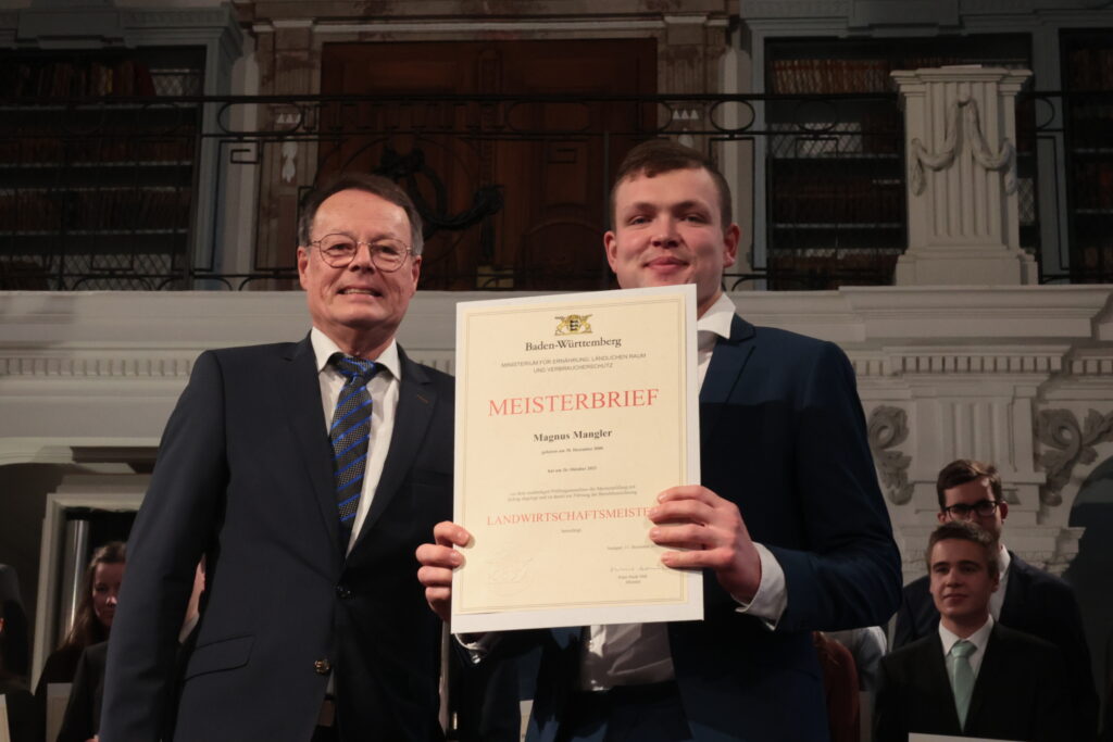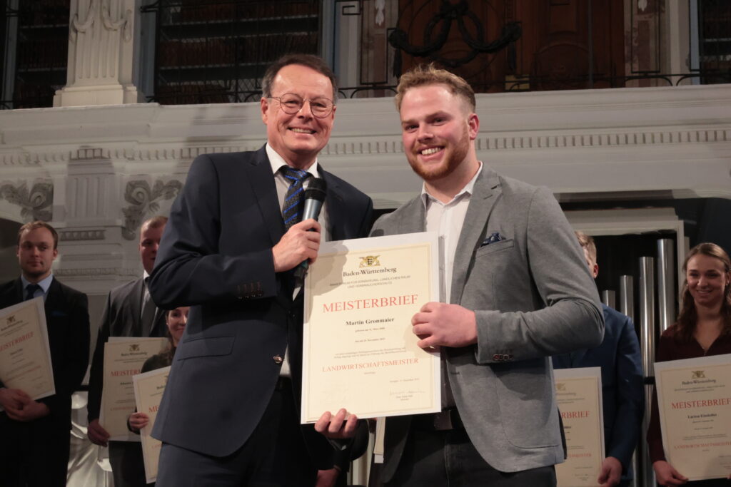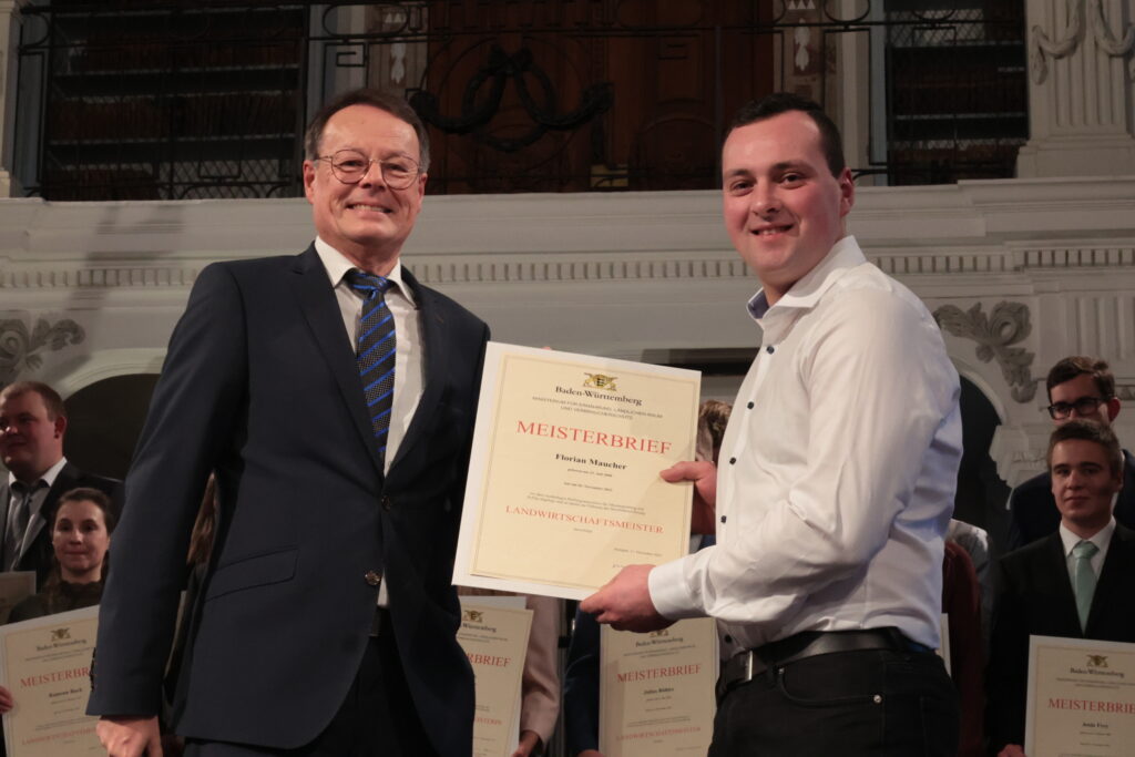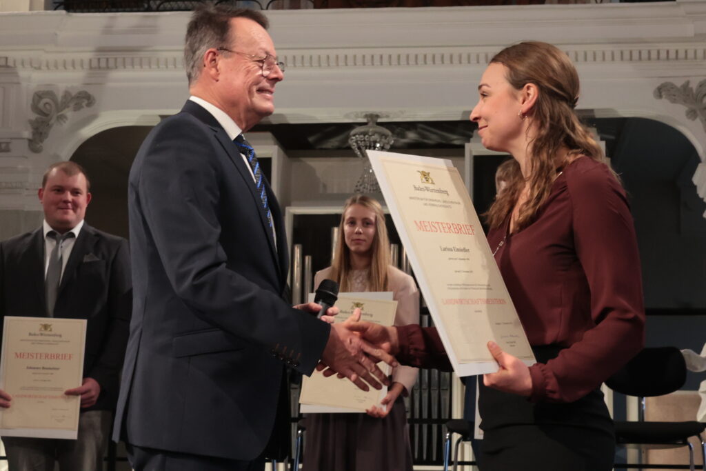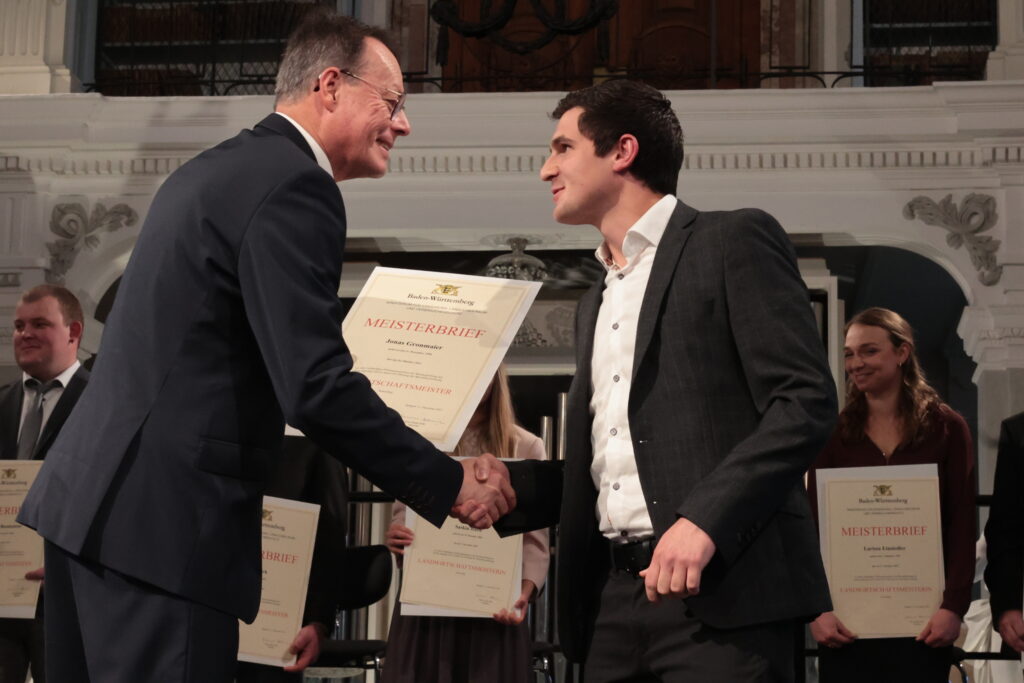 Ochsenhausen – Im Prachtbau des Klosters Ochsenhausen war Freude überall – in den Deckengemälden und in den Gesichtern der 38 neuen Meister und Meisterinnen der Landwirtschaft. Ein würdevoller Rahmen für die feierliche Übergabe der Urkunden durch Regierungspräsident Klaus Tappeser. Die Bläser von „HeiliXblechle“ spielten sogar eine Intrada von Nikolaus Betscher, dem letzten Abt des Klosters vor der Mediatisierung.