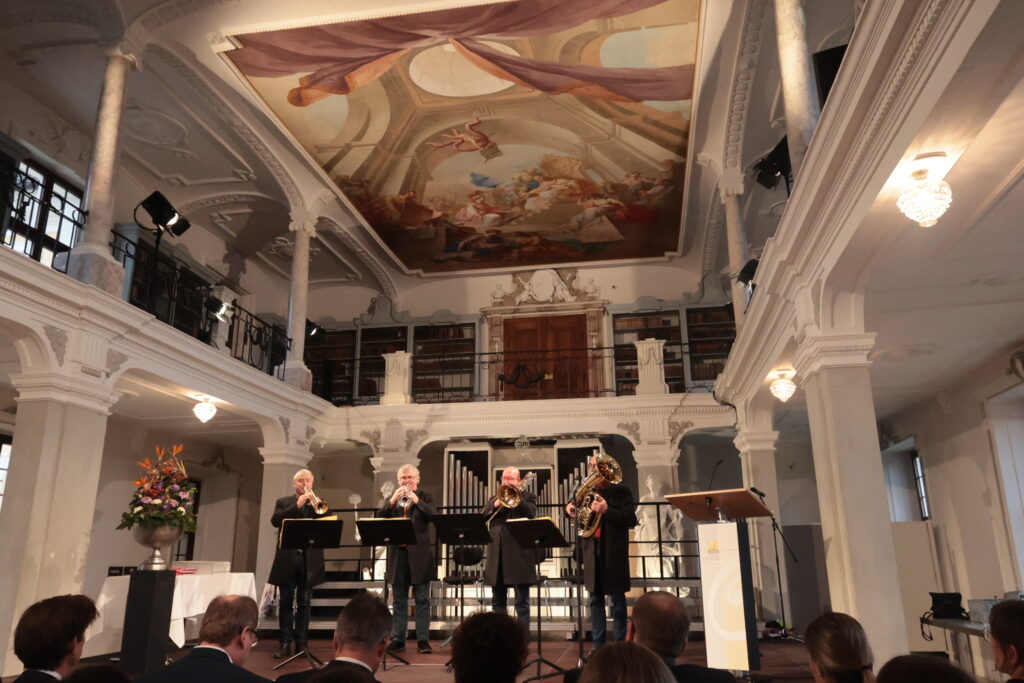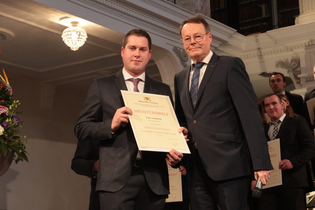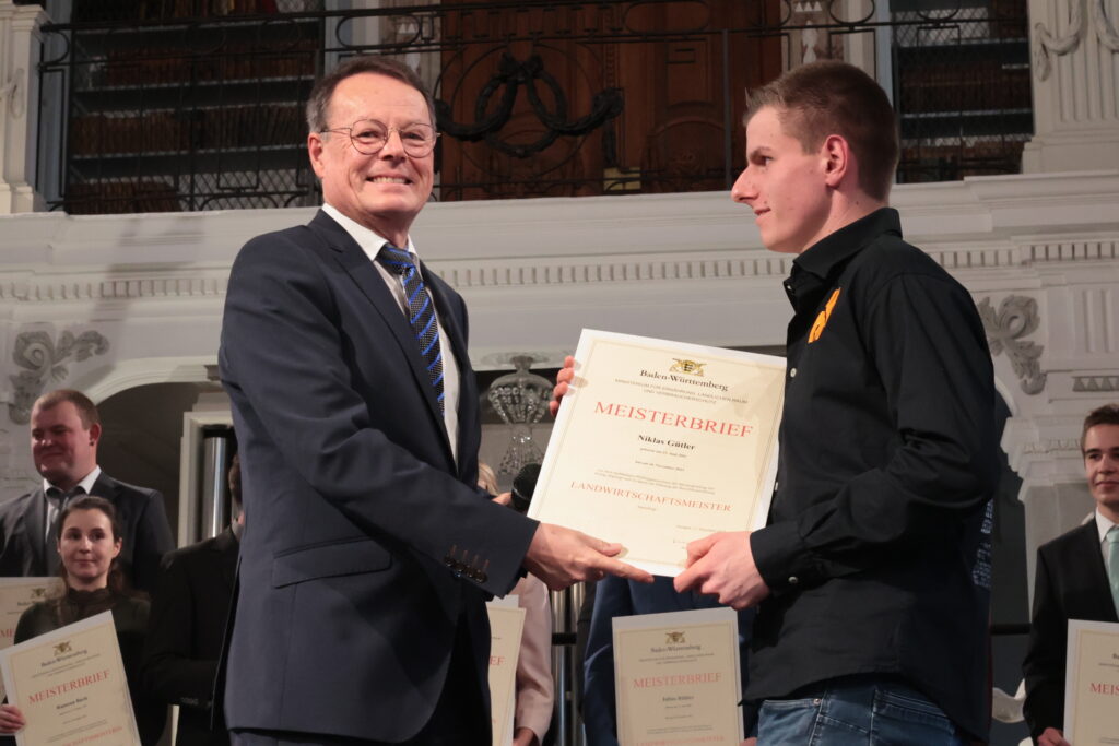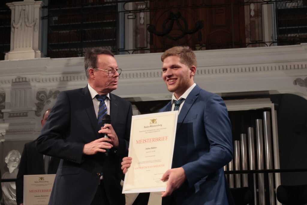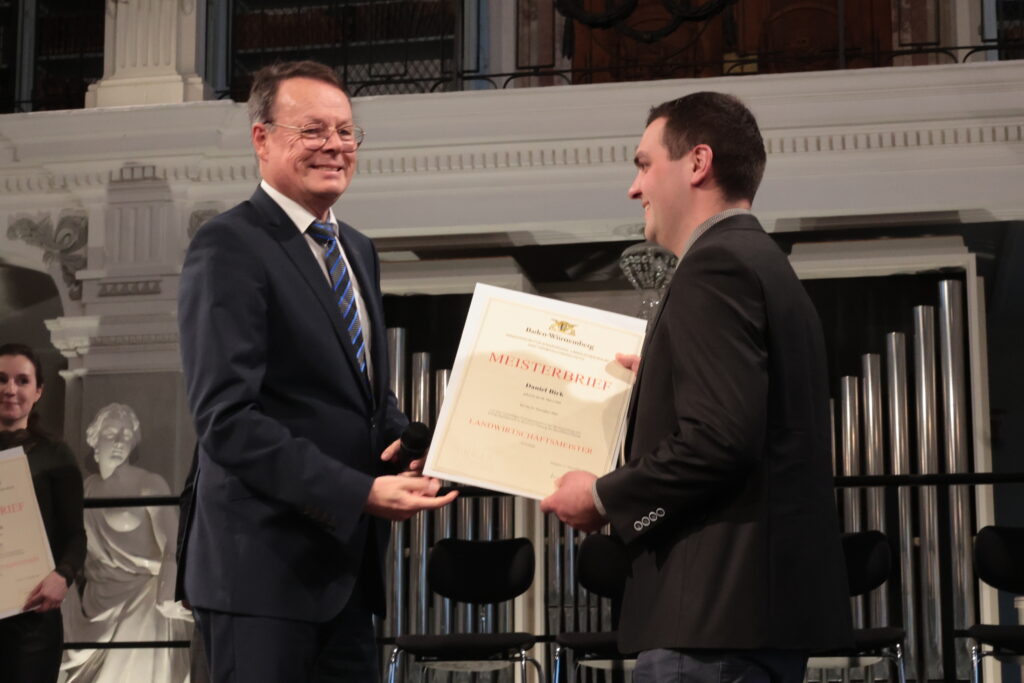 Ochsenhausen – Im Prachtbau des Klosters Ochsenhausen war Freude überall – in den Deckengemälden und in den Gesichtern der 38 neuen Meister und Meisterinnen der Landwirtschaft. Ein würdevoller Rahmen für die feierliche Übergabe der Urkunden durch Regierungspräsident Klaus Tappeser. Die Bläser von „HeiliXblechle“ spielten sogar eine Intrada von Nikolaus Betscher, dem letzten Abt des Klosters vor der Mediatisierung.