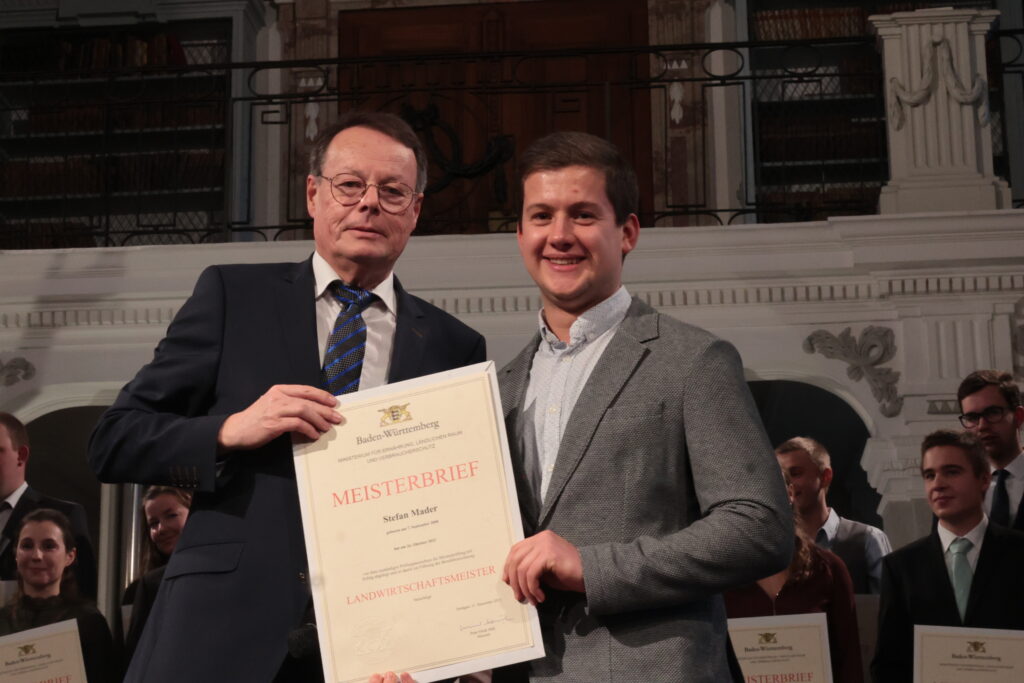 Die neuen landwirtschaftlichen Leistungsträger wurden in diesem Festakt von Abteilungspräsidentin Anita Schmitt vom Regierungspräsidium Tübingen begrüßt. Weitere Grußworte und gute Wünsche überbrachten Ochsenhausens Bürgermeister Philipp Bürkle und Biberachs Landrat Mario Glaser. Durch den anschließenden „Meistertalk“ führte Bernhard Bitterwolf. Eine Kostprobe daraus: „Was macht einen Bauern glücklich?“ Für Jungmeister Vinzenz Popp ganz klar: „Ein guter Melkstand und ein guter Kontostand!“